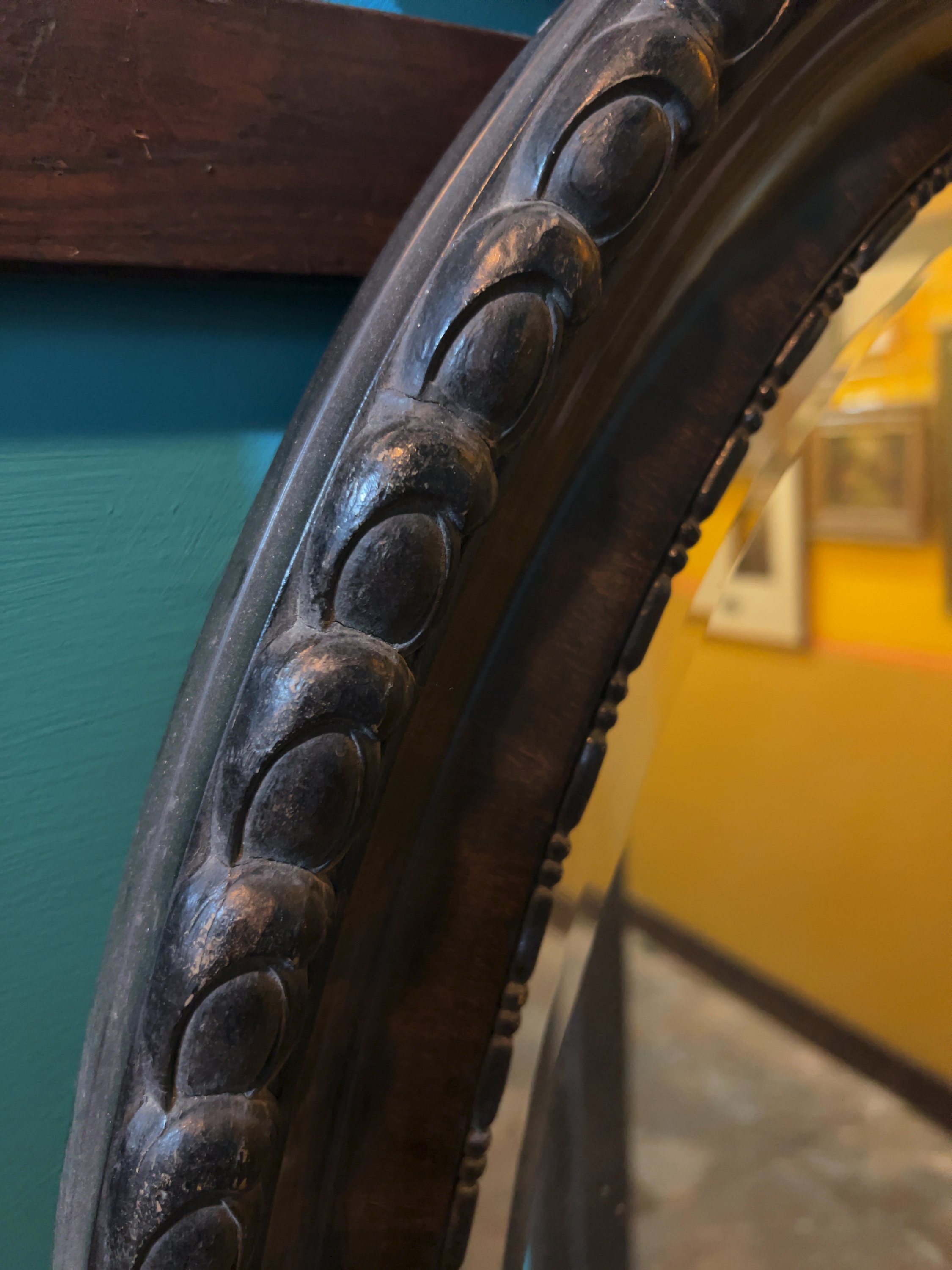 The frame exhibits minor surface wear, small scuffs, and accumulations of dust consistent with age and use. The mirror plate appears generally intact but is obscured by a paper label and adhesive tape that will require careful removal. Minor silvering degradation or foxing may be present at the extreme edges where the glass meets the frame.
