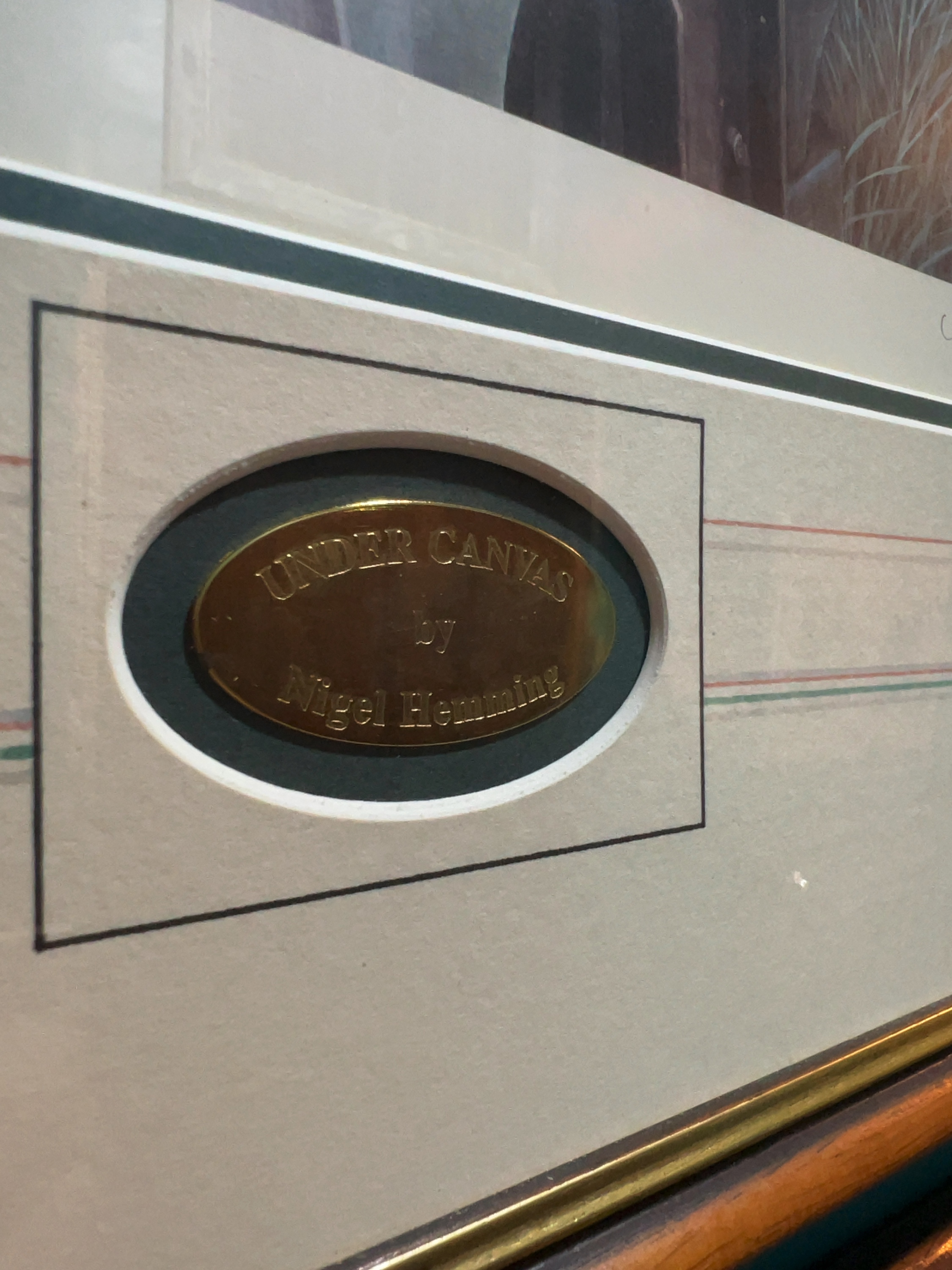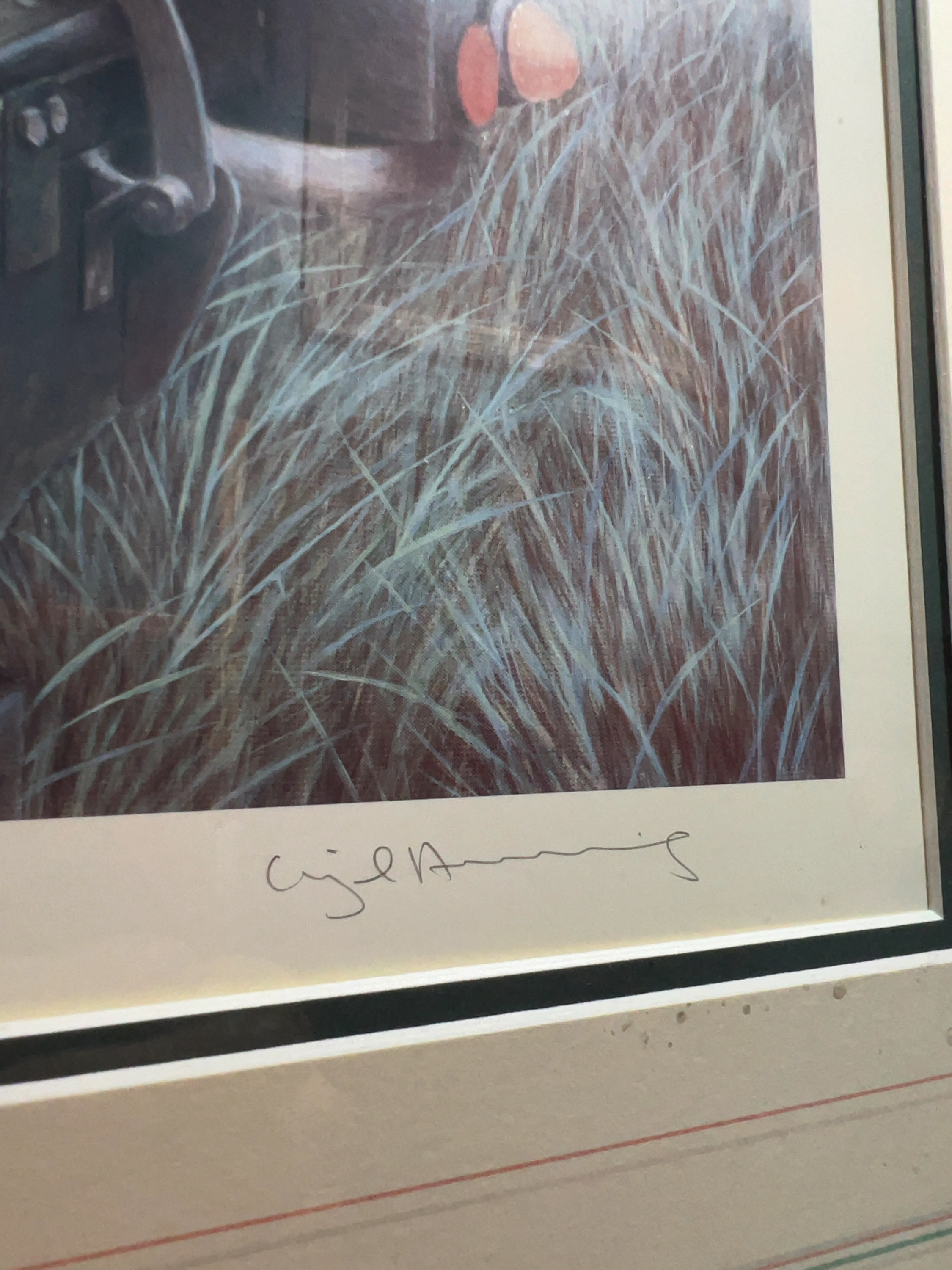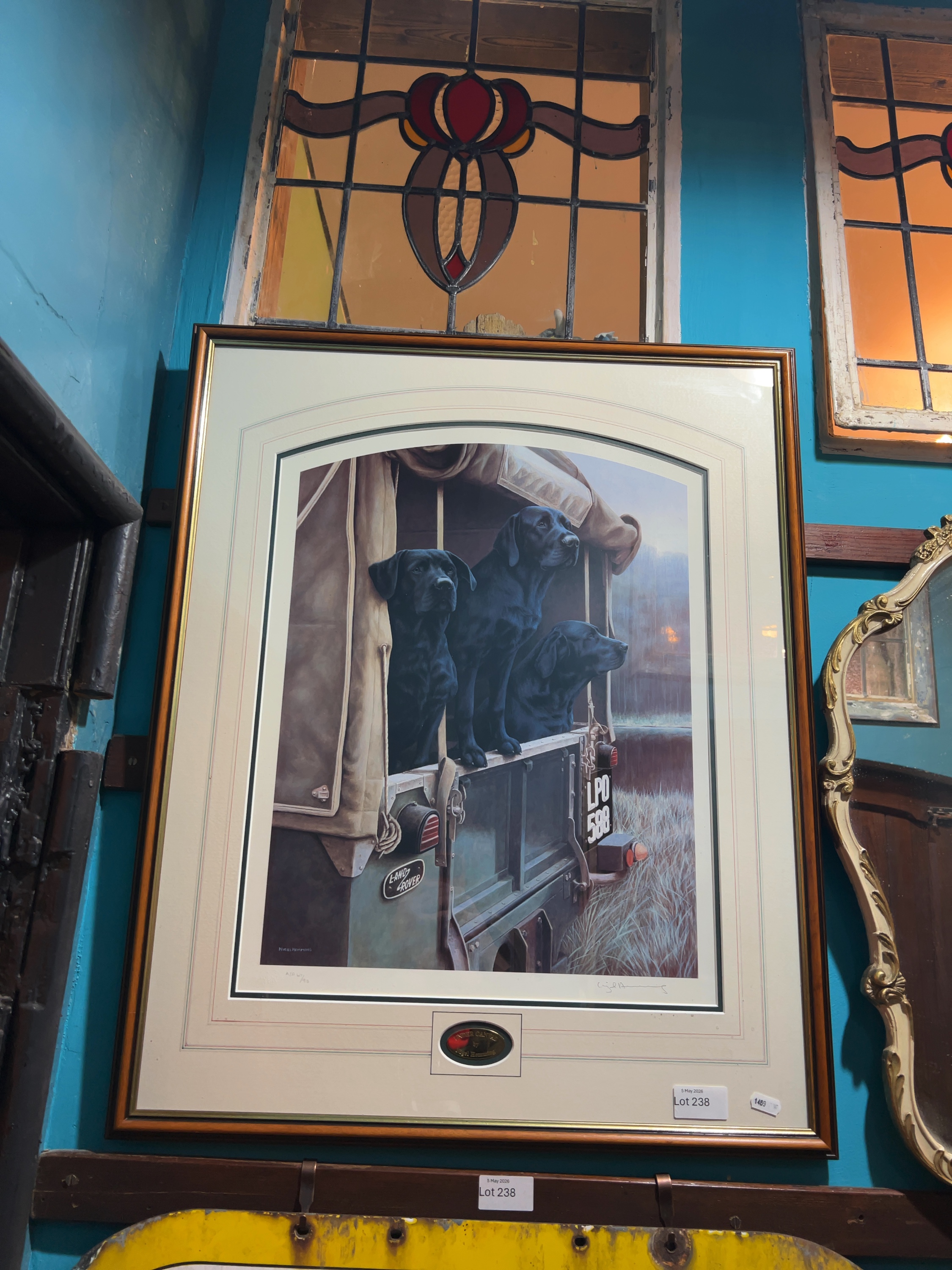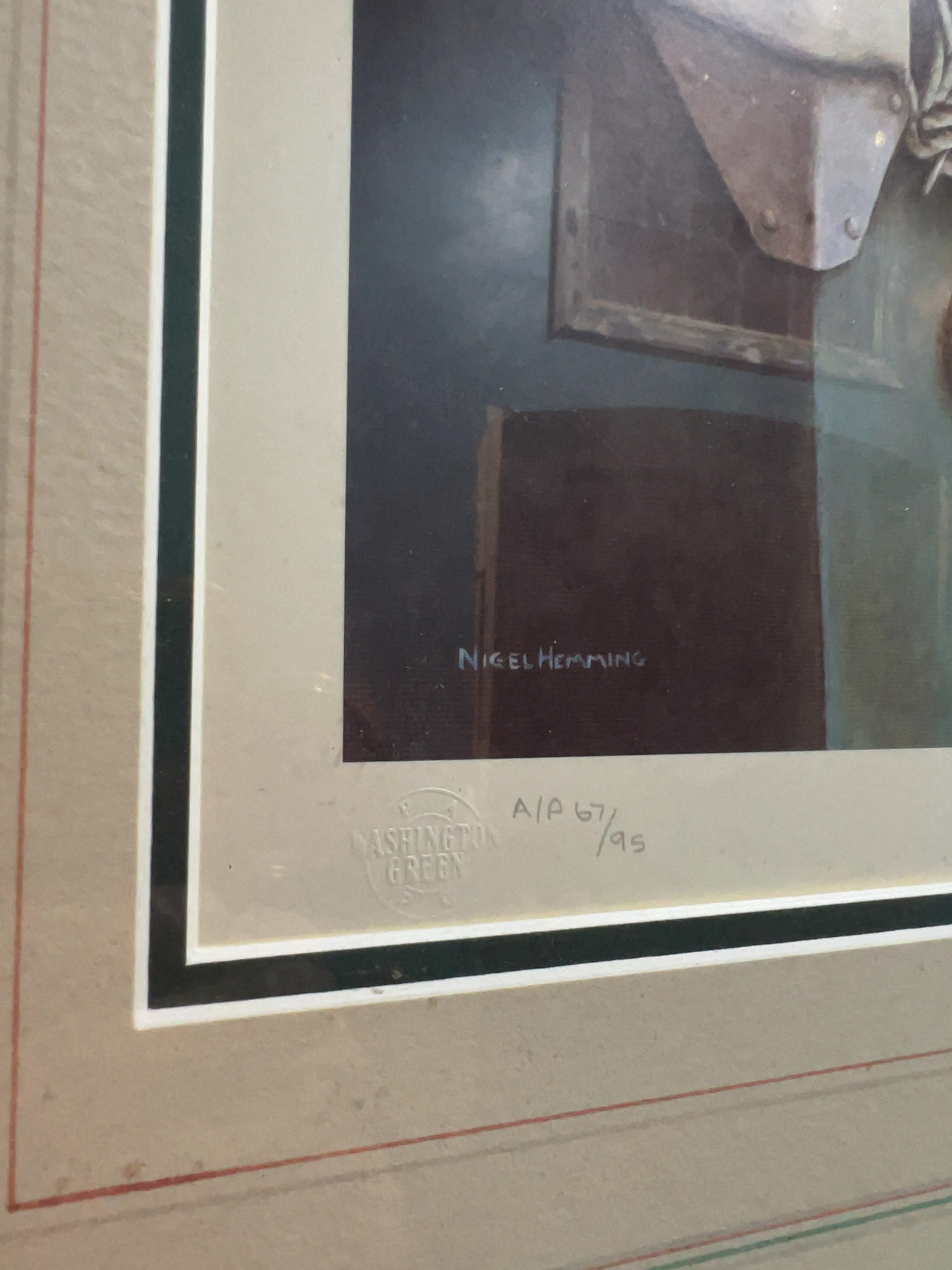A limited edition artist’s proof print titled Under Canvas by the British animal artist Nigel Hemming, depicting three black Labrador Retrievers looking out from the rear of a canvas-tilted Land Rover. The work is hand-signed in pencil by the artist in the lower right margin and is numbered in pencil as an artist’s proof, A/P 67/95, in the lower left margin. An embossed circular publisher’s stamp for Washington Green is present in the lower left margin, and the artist’s name is printed within the image plate at the bottom left.