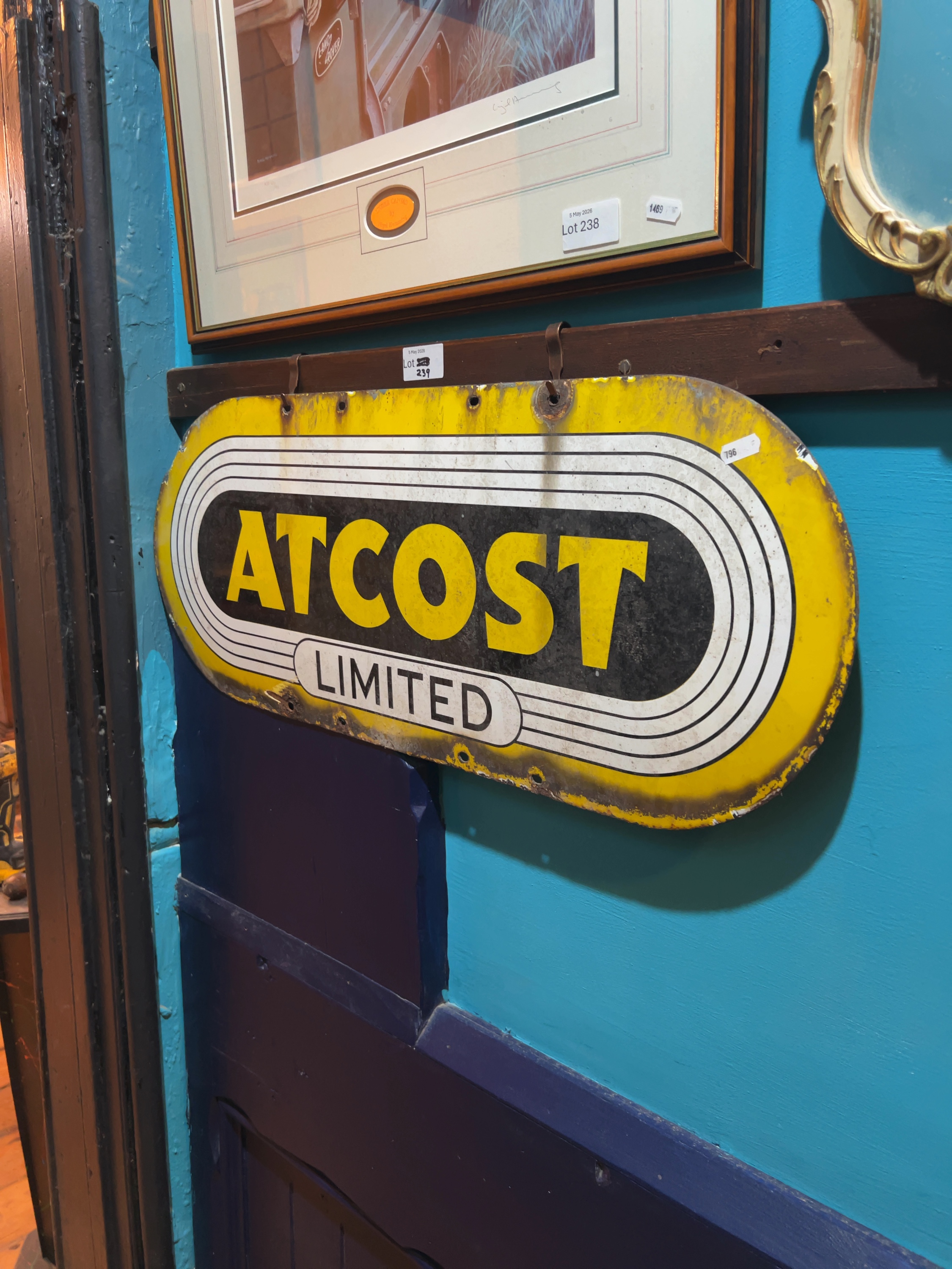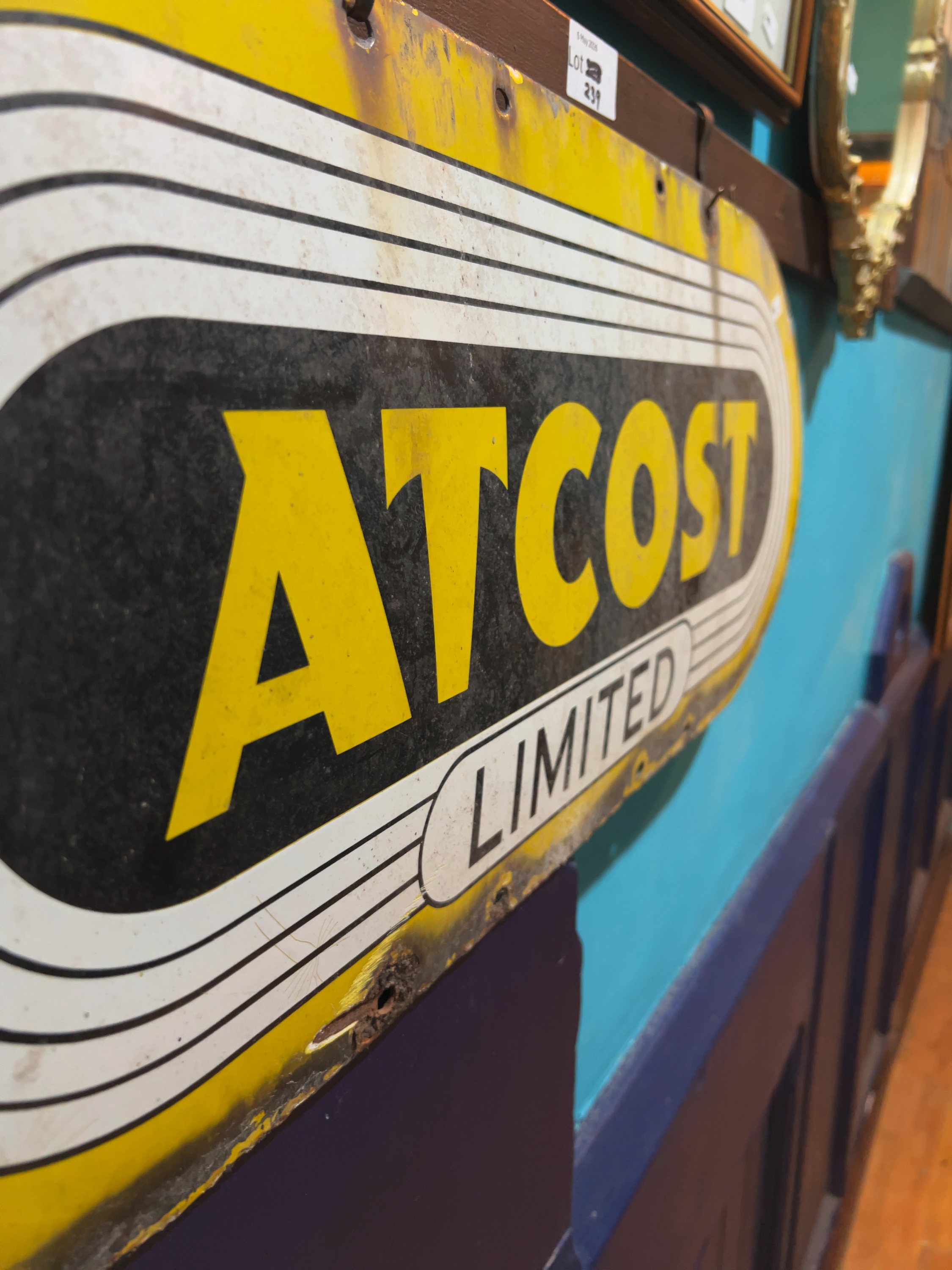 A vintage single-sided vitreous enamel advertising sign for Atcost Limited and representative of mid-century British industrial branding and would have been used as a site marker or building plaque.