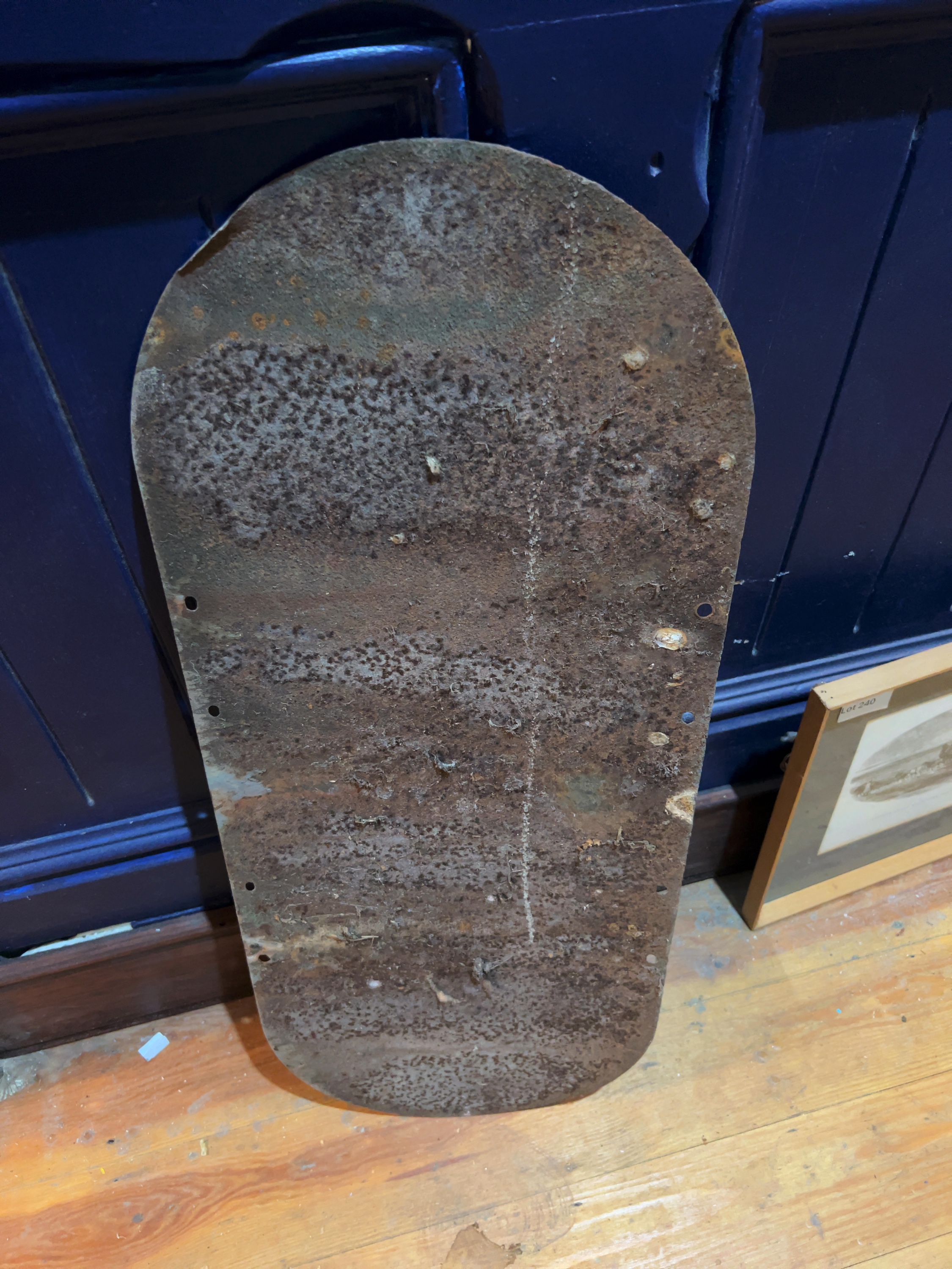 The sign is in used vintage condition. The front face retains relatively vibrant colours, though it shows visible surface wear, minor scratching, and areas of rust spotting, particularly concentrated around the edges and the mounting holes. There is a small area of loss to the enamel on the top left edge. The reverse is heavily oxidised with significant surface rust covering the entire back.