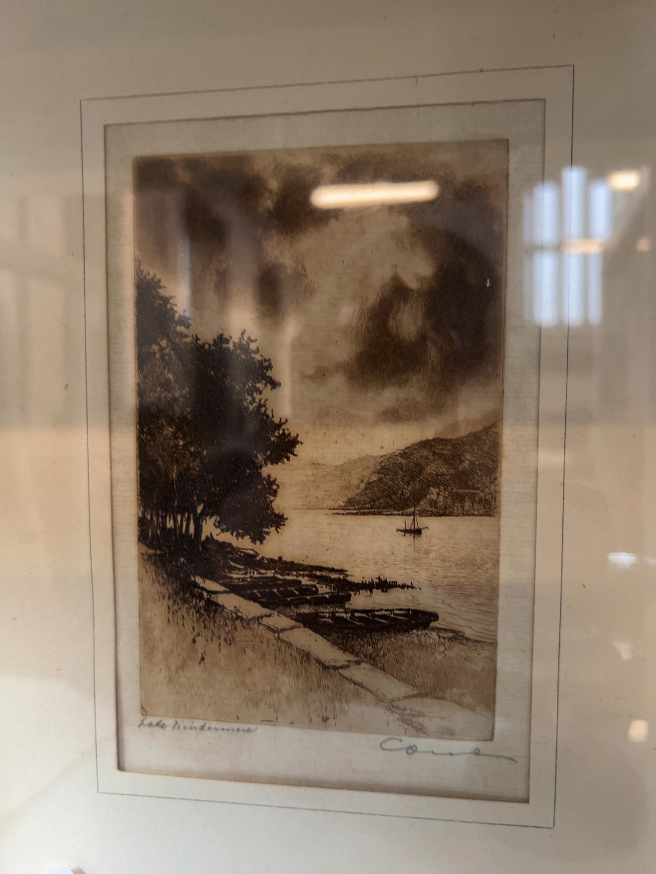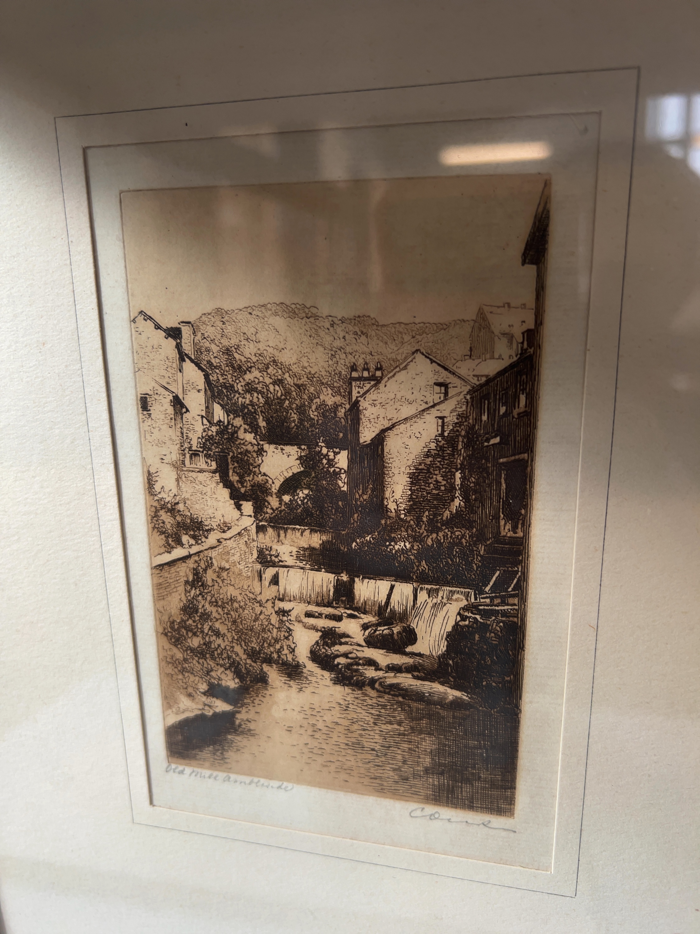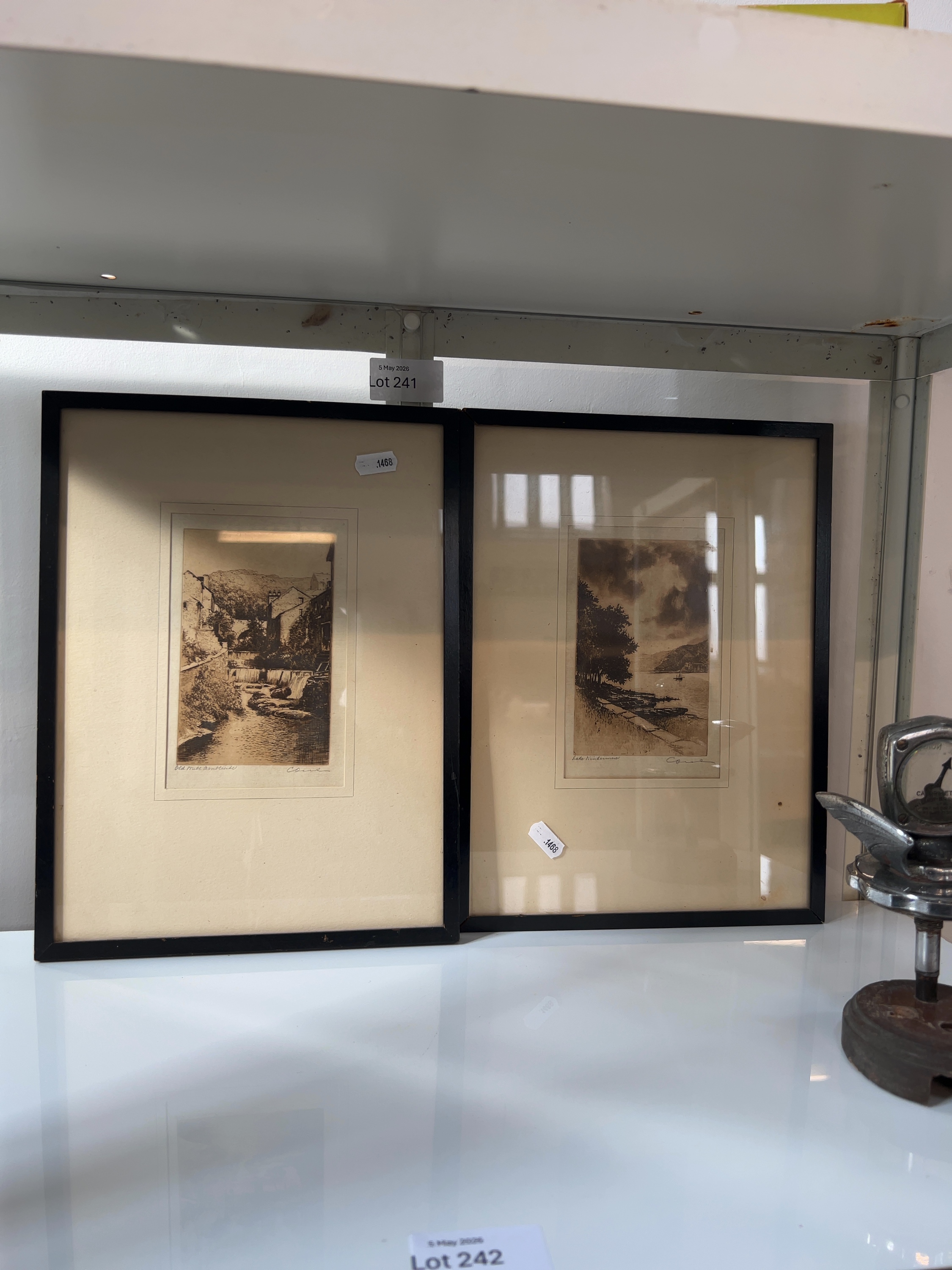 A pair of mid-20th century etchings on paper depicting quintessential Lake District scenes, titled Old Mill Ambleside and Lake Windermere. Each print is inscribed with its title in pencil to the lower left margin and bears a pencil signature to the lower right. The signature consists of a capital C followed by cursive characters, possibly reading Court.