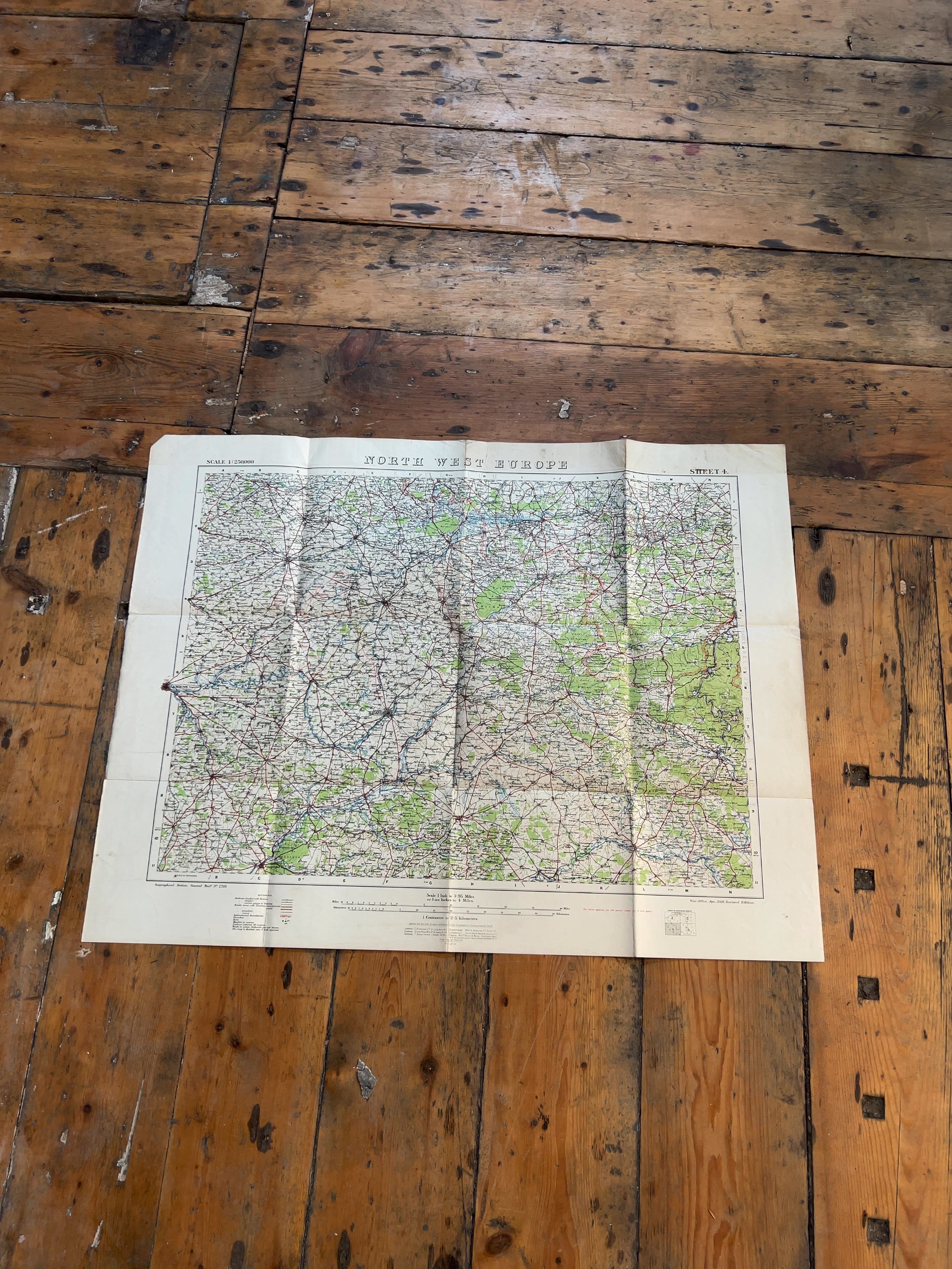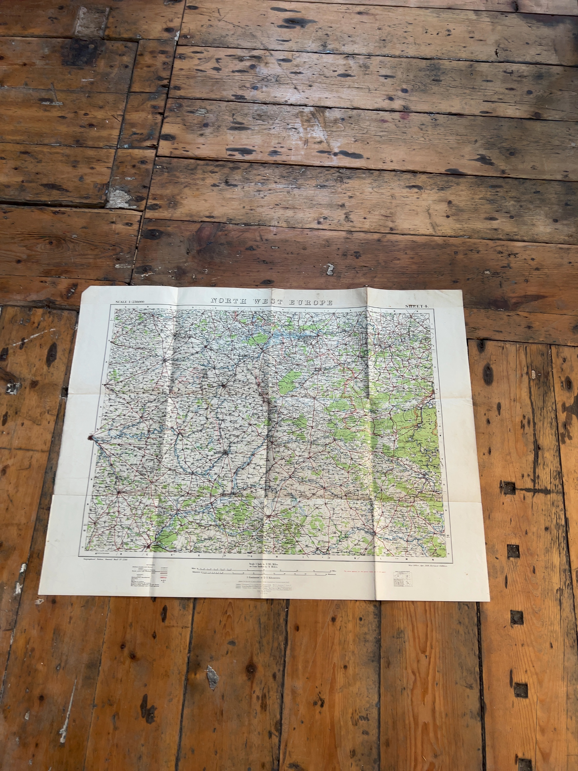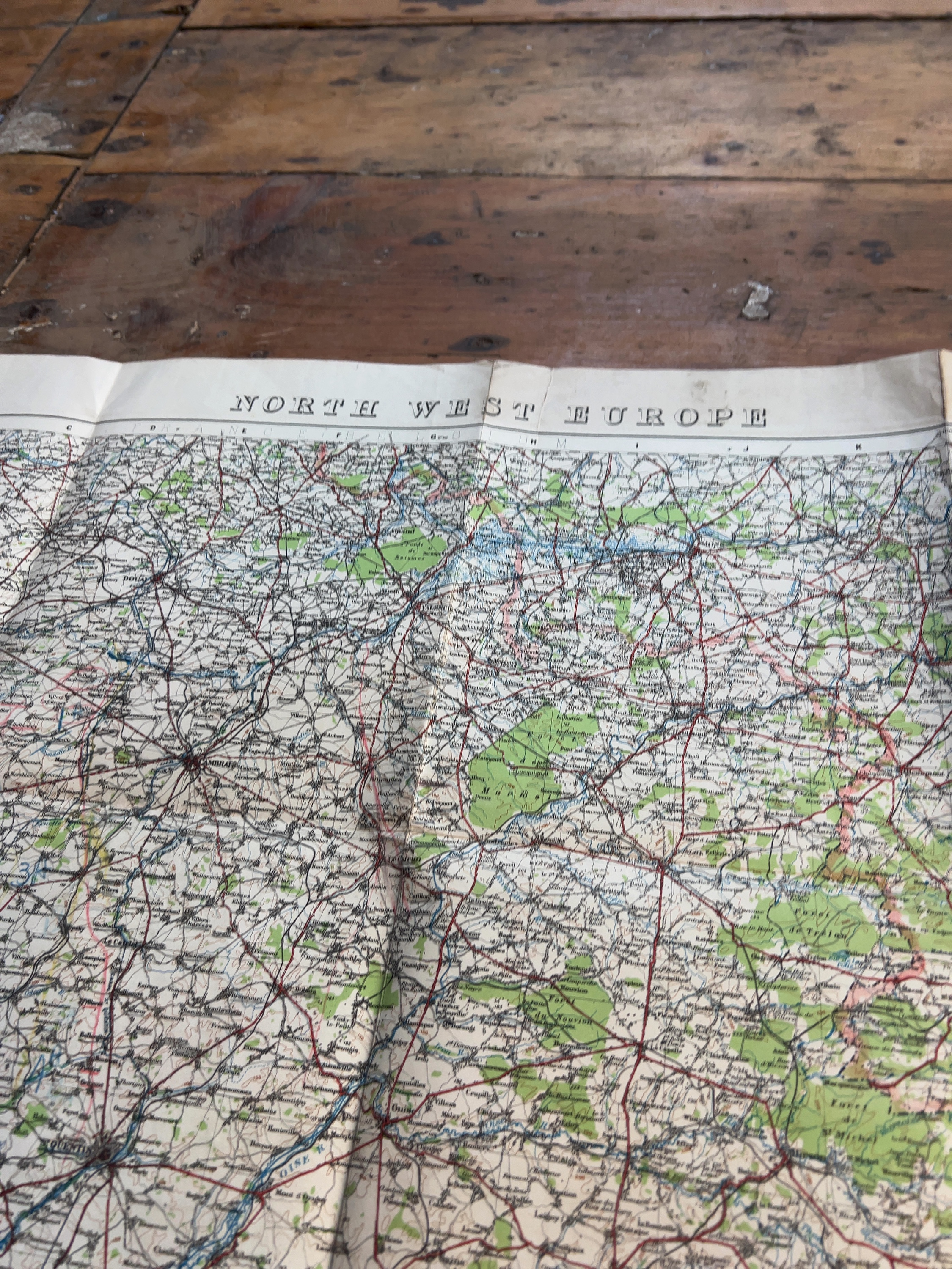 The map is in good overall condition for its age. It retains its original fold lines with visible creasing throughout. There is minor wear and light fraying at the intersections of the folds and along the outer margins. The paper surface remains largely clean with minimal foxing or staining. The coloured printing remains vibrant and all text is clearly legible.