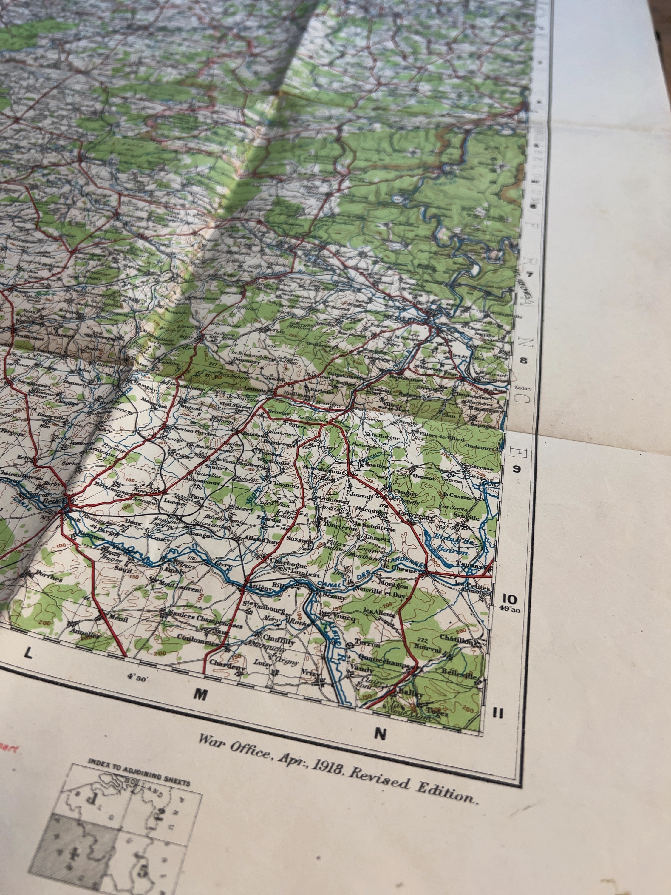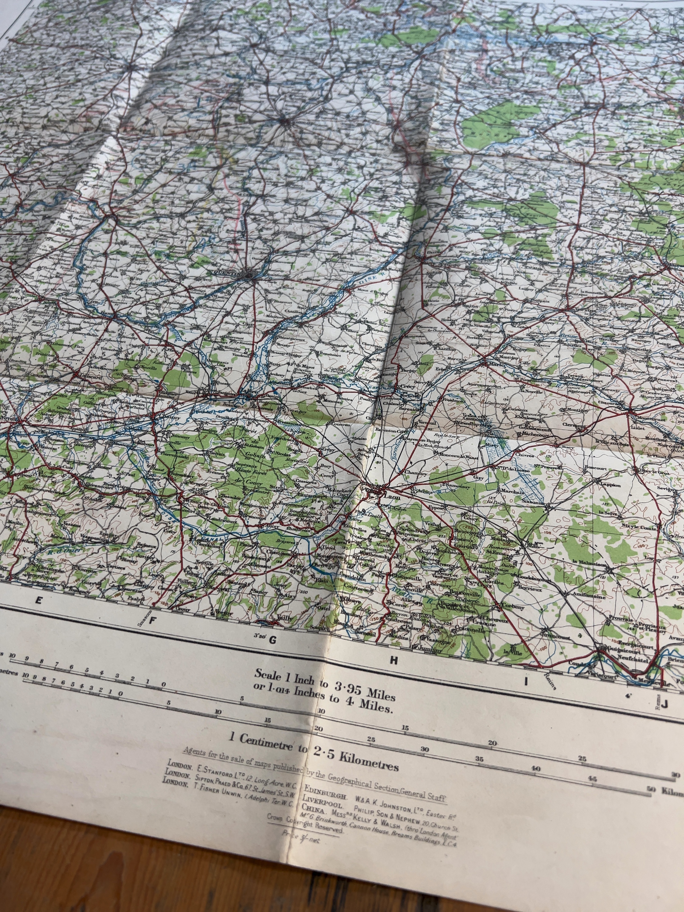 This is an original First World War British military map published by the Geographical Section, General Staff (GSGS), designated as No. 2733. Titled North West Europe, Sheet 4, it is a revised edition dated April 1918. It focuses on parts of Northern France and the Ardennes region, highlighting significant First World War locations such as St. Quentin, Laon, Sedan, and the course of the Oise River. The bottom margin includes the War Office publication details, the GSGS number, and a list of authorised agents for sale including E. Stanford Ltd of London, W. & A. K. Johnston Ltd of Edinburgh, and Kelly & Walsh of China. A retail price of 3/- net is also printed.
