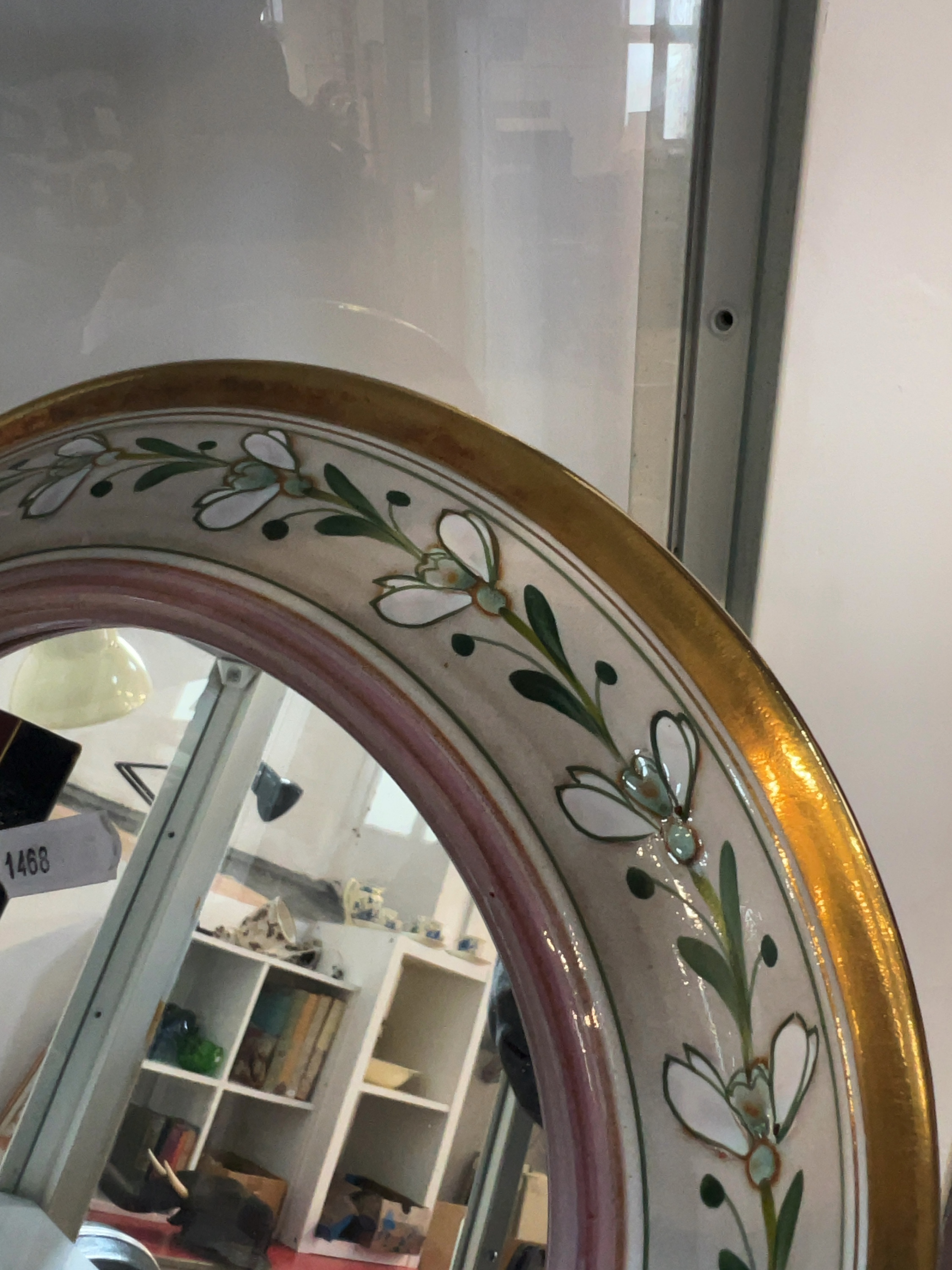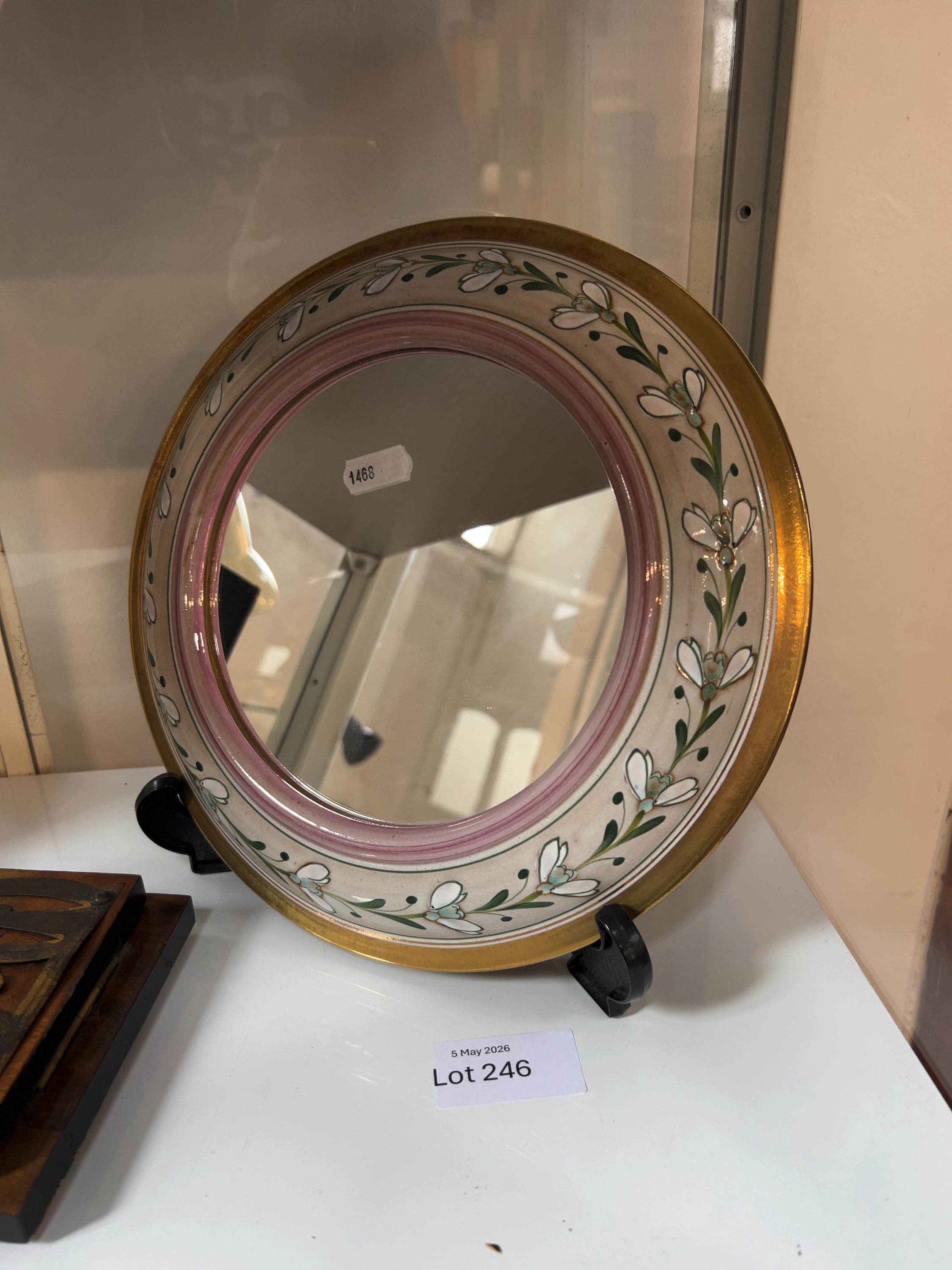 The piece is in good condition. There are no apparent chips, cracks, or signs of restoration to the ceramic frame. There is minor surface wear and light rubbing to the gilded outer rim consistent with age. The mirror glass remains clear and free from significant scratches or silvering loss.