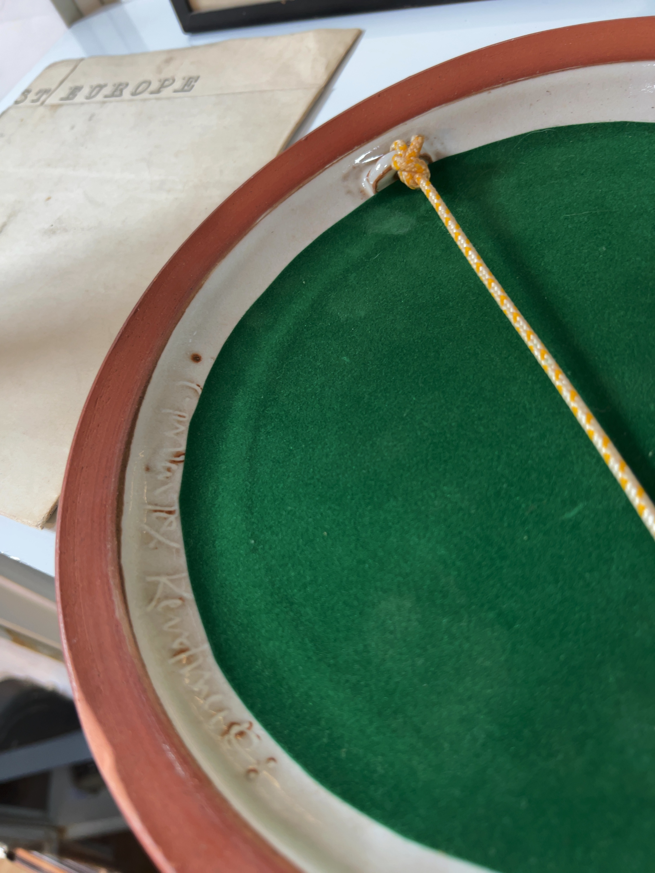 A circular wall mirror set within a wide ceramic frame, featuring hand-painted tubelined floral decoration of snowdrops (Galanthus) on a cream ground. The unglazed ceramic edge on the reverse bears an incised signature for the maker Johanna Kenworthy.
