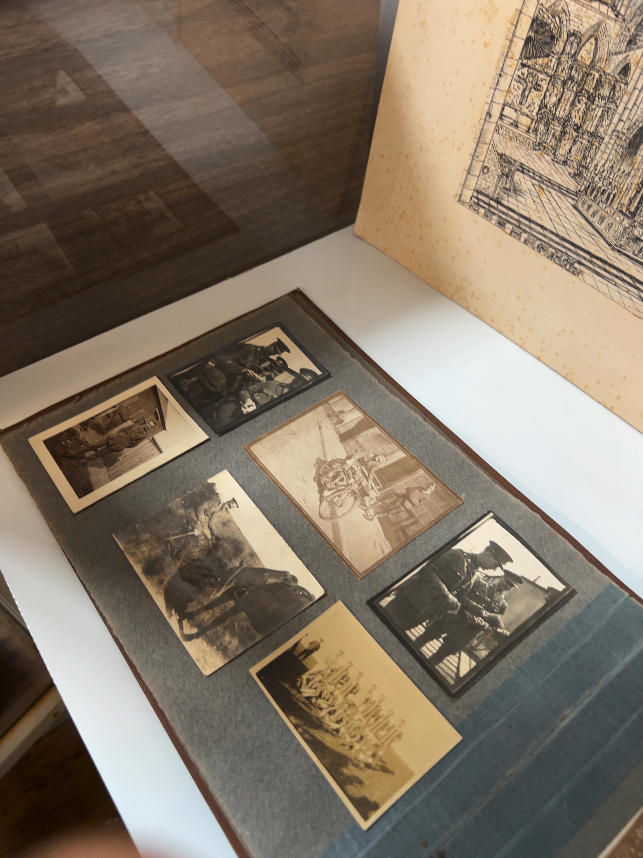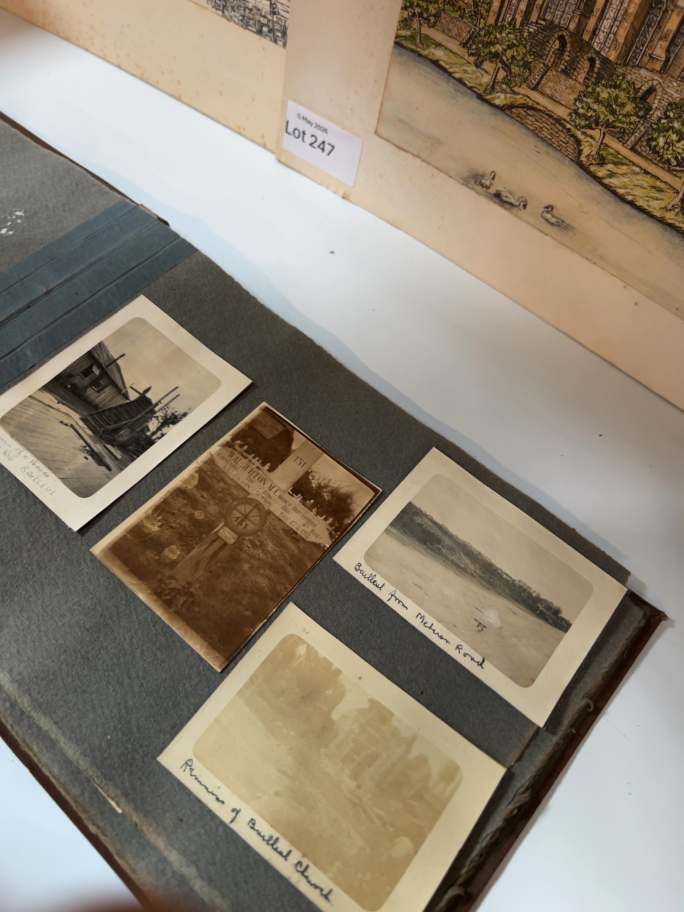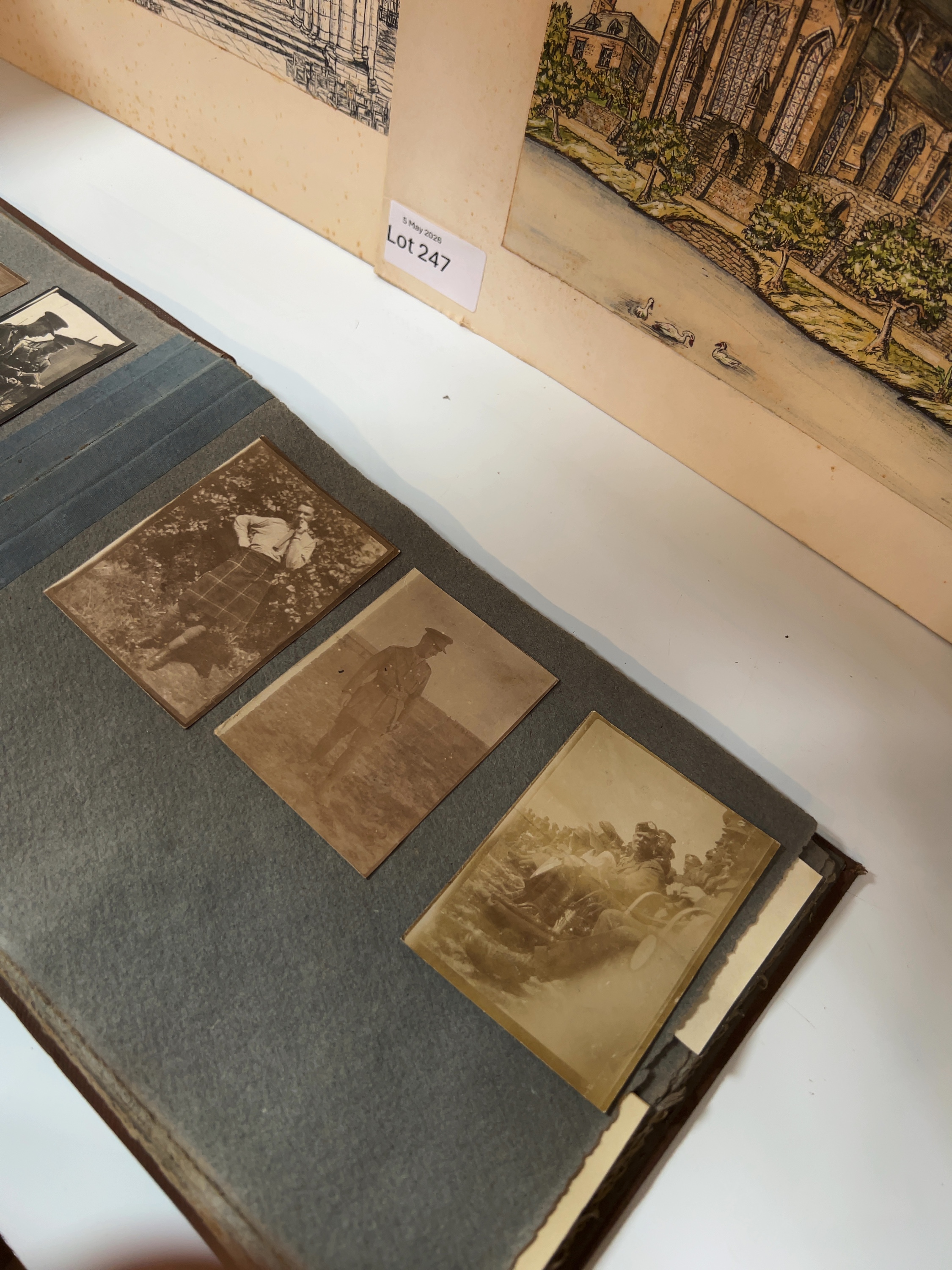 A landscape-format cloth-bound photograph album containing a collection of original silver gelatin and sepia-toned snapshots documenting the Western Front during the First World War and an immediate post-war period pilgrimage.