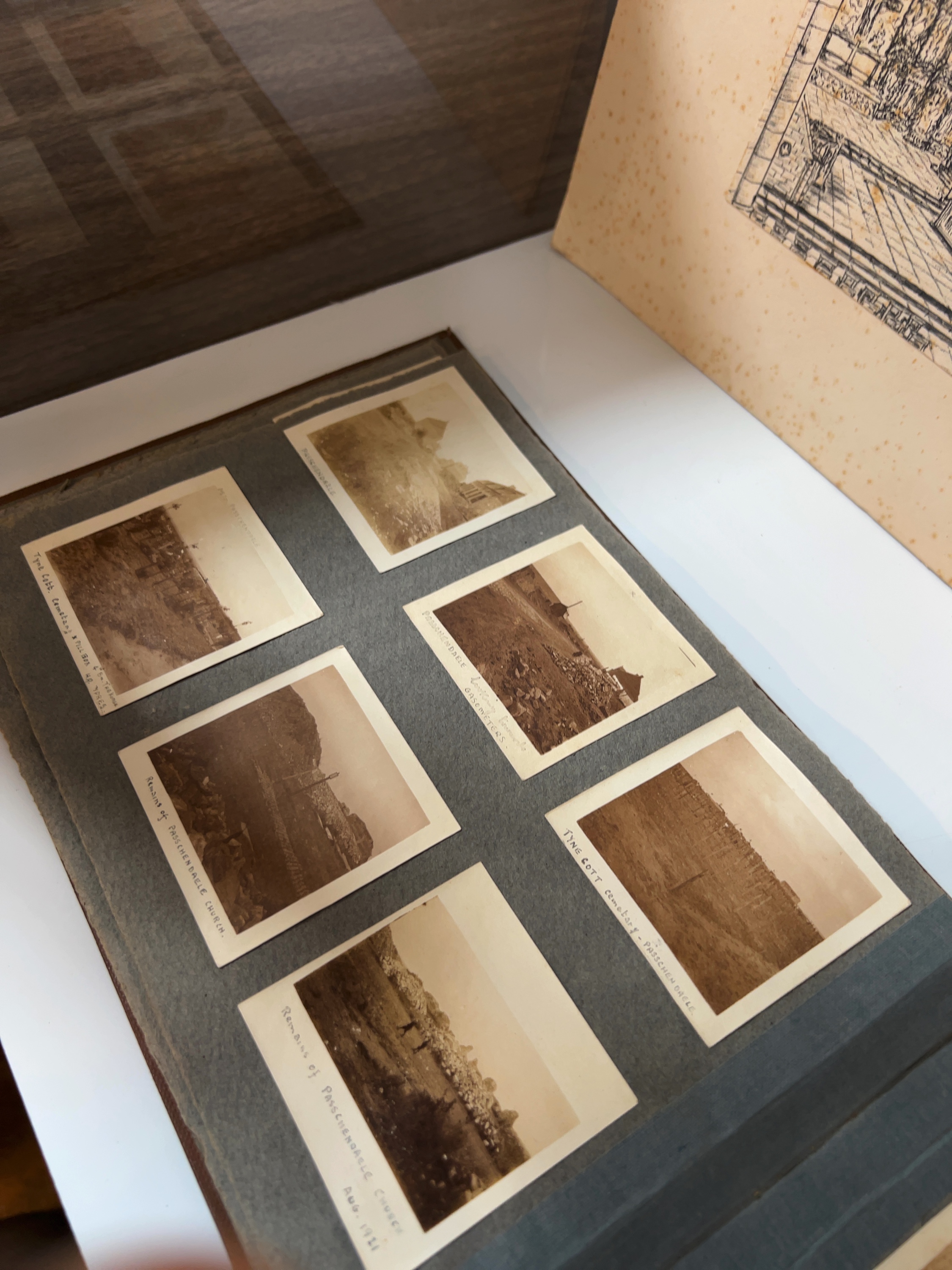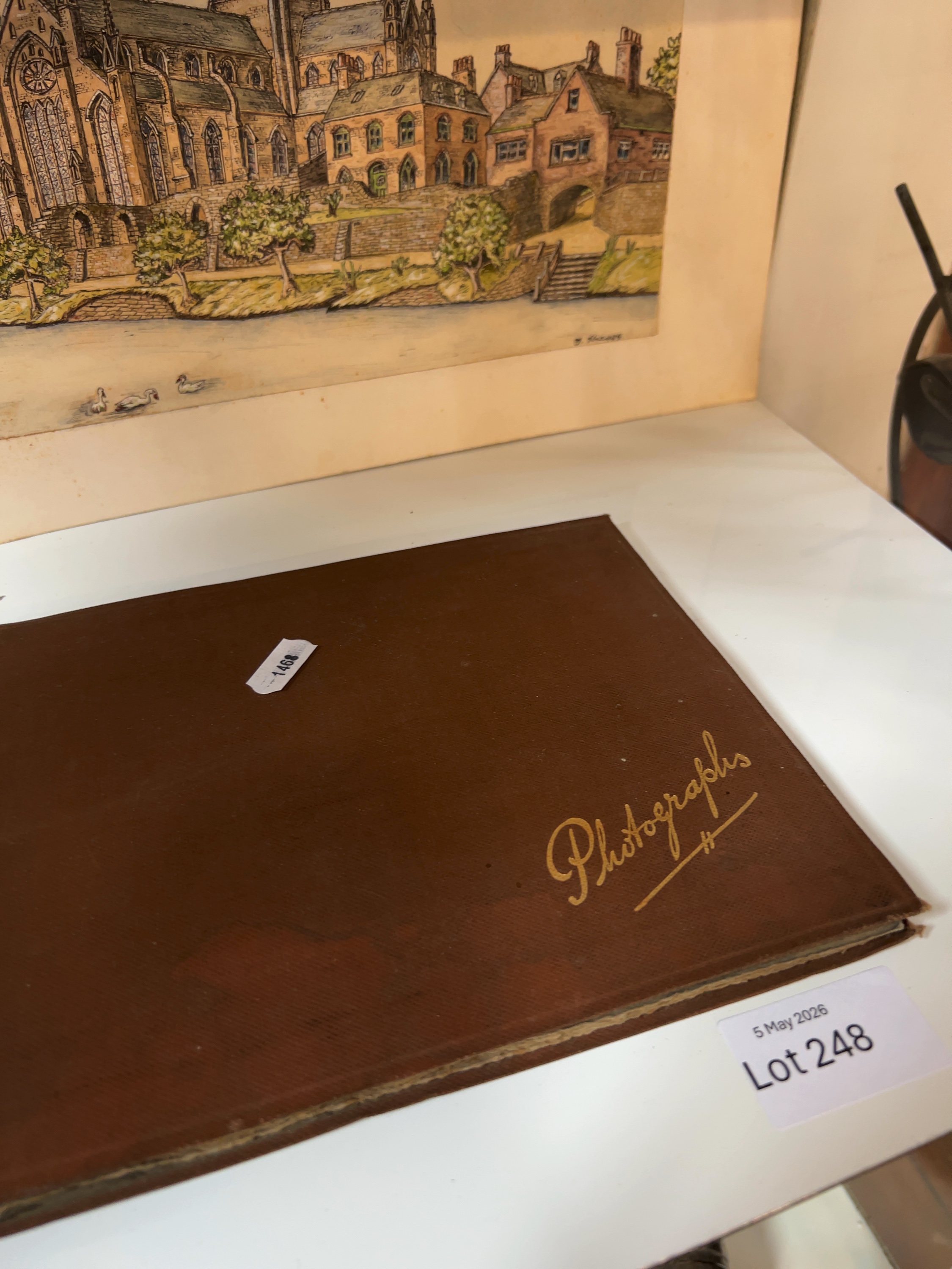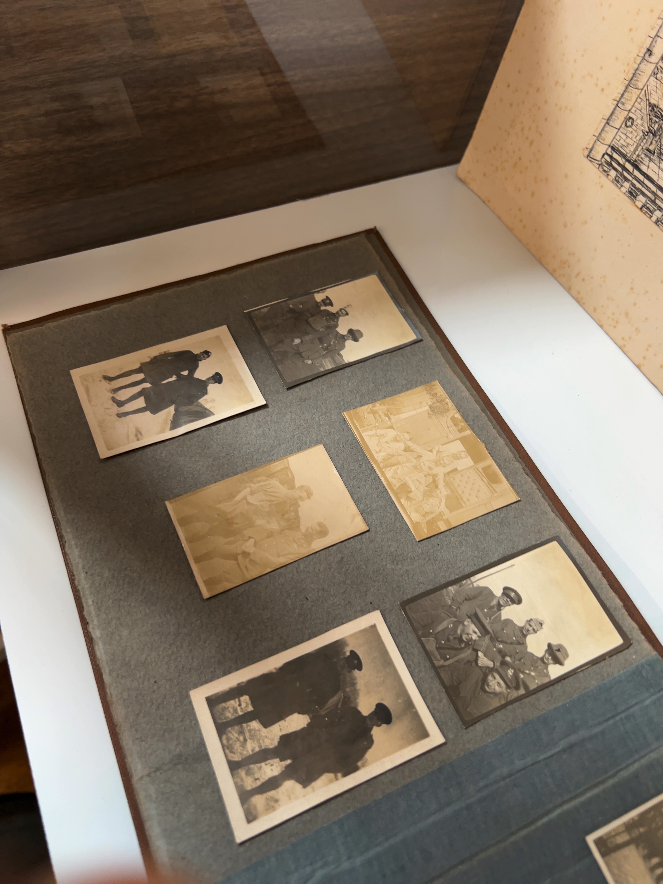 A landscape-format cloth-bound photograph album containing a collection of original silver gelatin and sepia-toned snapshots documenting the Western Front during the First World War and an immediate post-war period pilgrimage.