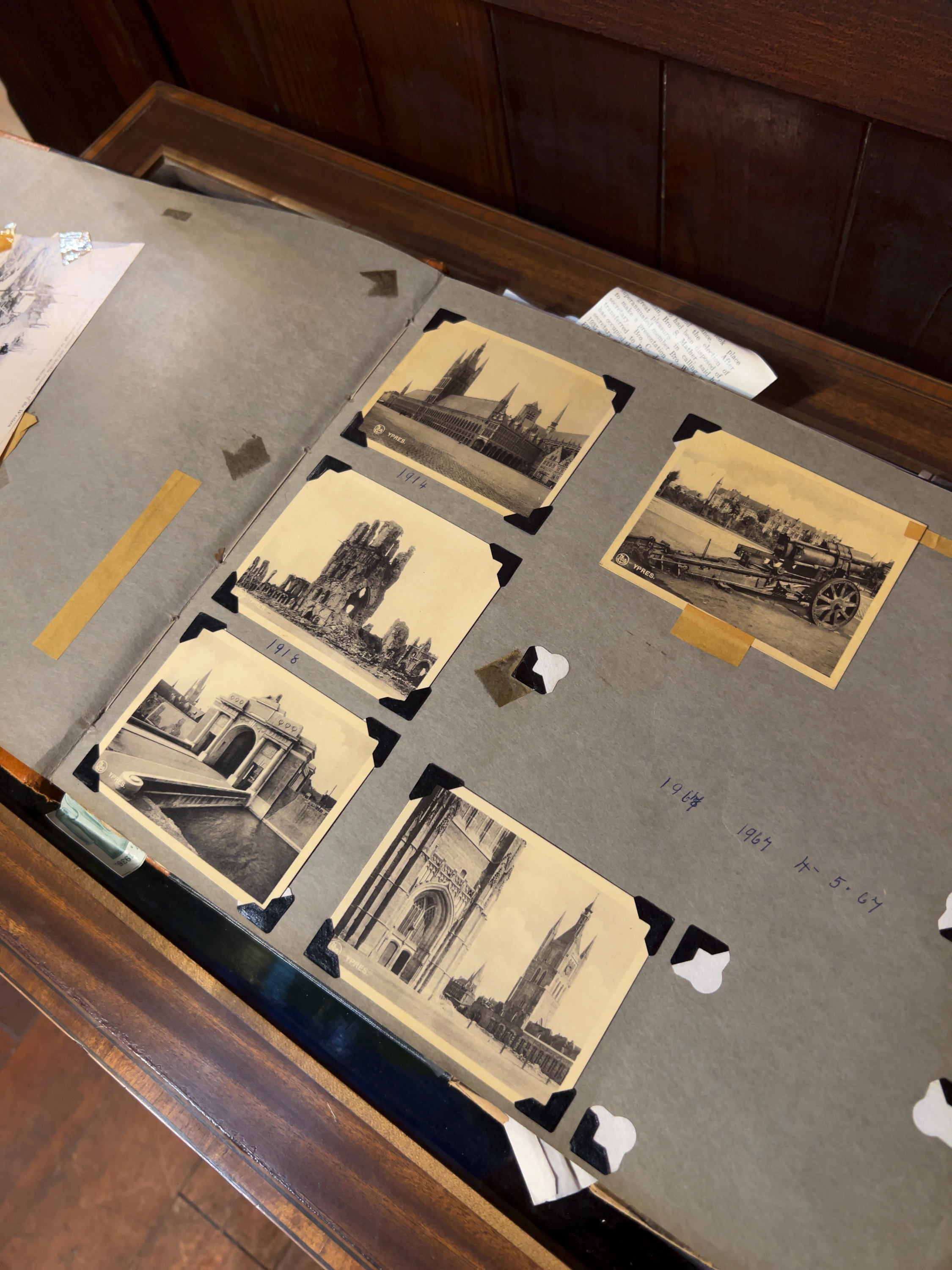 A central feature of the album is a hand-drawn field map of the Ypres Salient, rendered in blue and red ink. The map identifies key locations of the conflict, including Ypres, Potijze, St. Jean, Zonnebeke, Tyne Cot, and Passchendaele. This is accompanied by a series of Ypres topographical postcards illustrating the town and the Cloth Hall before and after the bombardment, as well as the completed Menin Gate memorial. These are annotated with dates spanning 1914, 1918, 1964, and 1967.