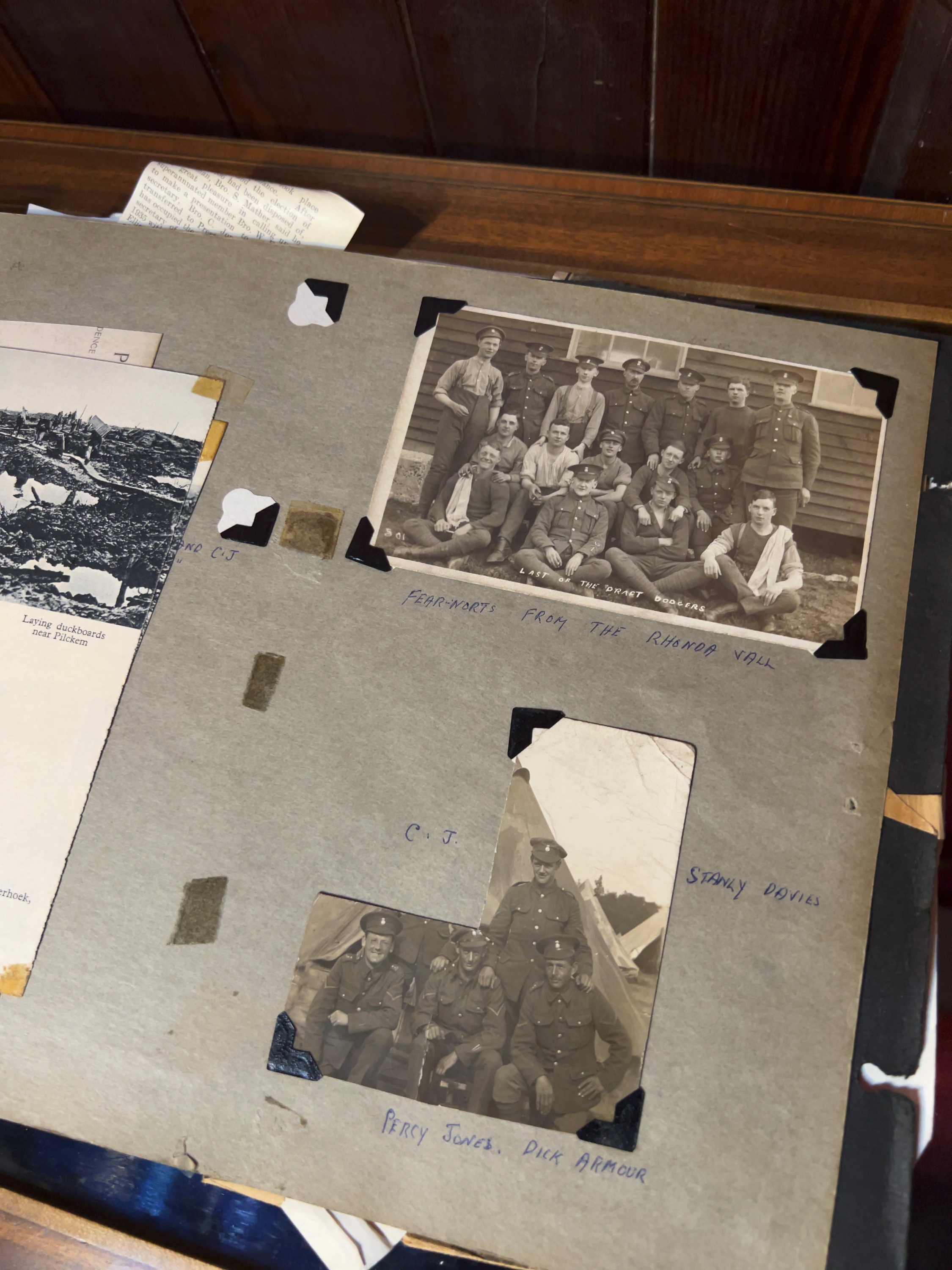 The military photography includes original silver gelatin prints, comprising studio and field portraits. Handwritten captions identify individuals such as Percy Jones, Tommy Morgan, Dick Armour, and Stanly Davies. A notable group photograph of soldiers positioned outside wooden barracks bears the blue ink inscription: Fear-norts from the Rhondda Vall – Last of the Draft Dodgers.
