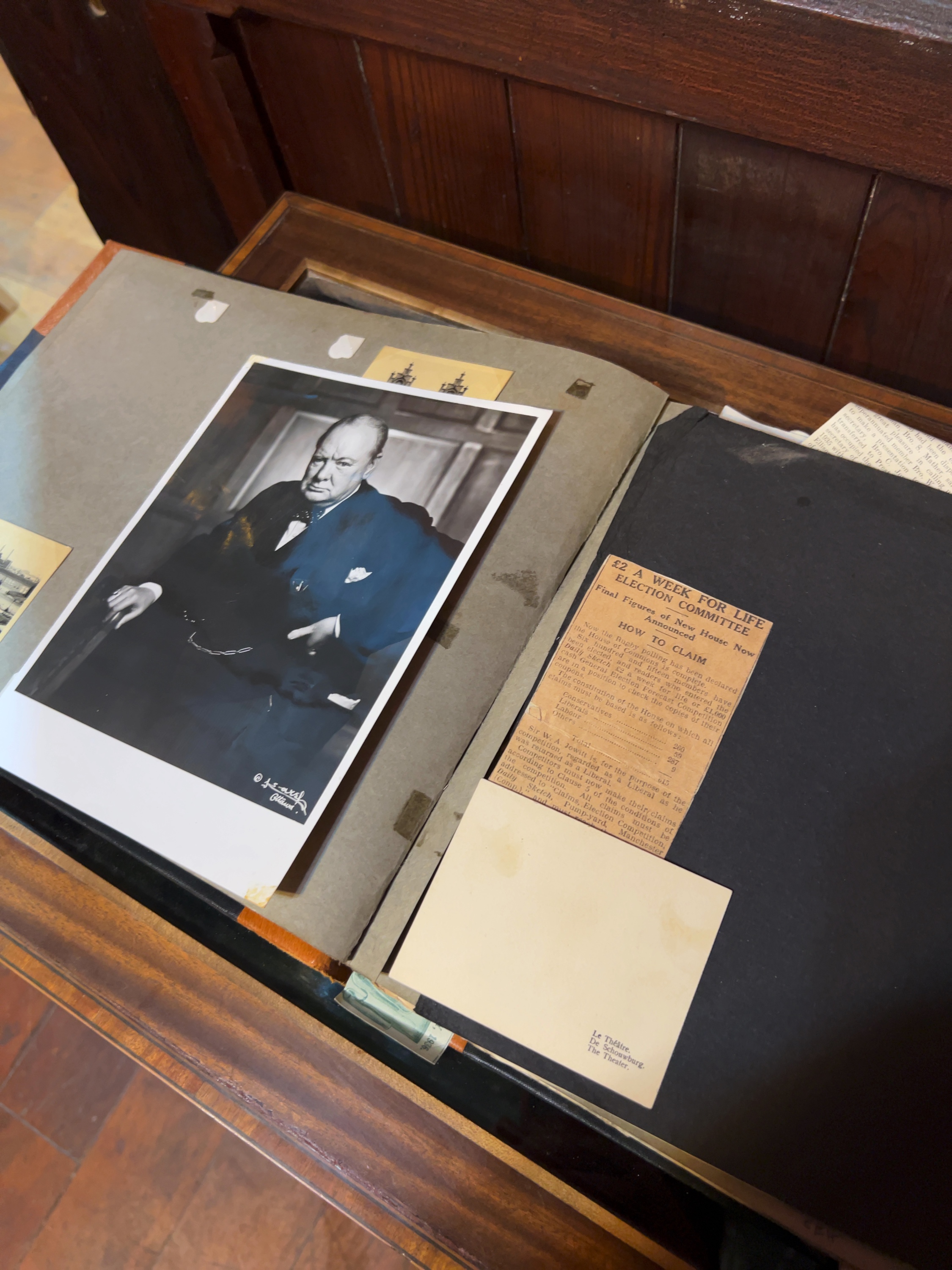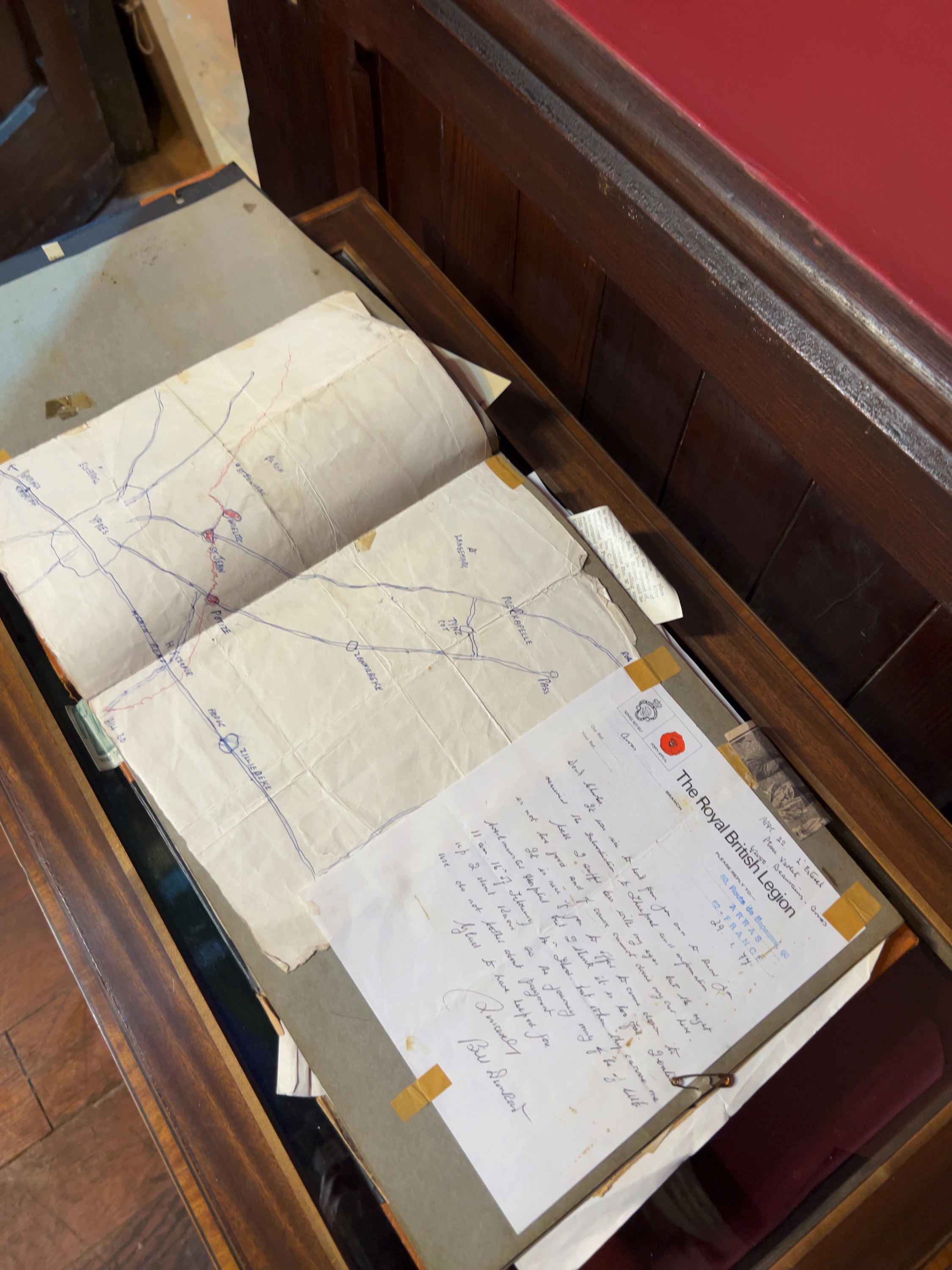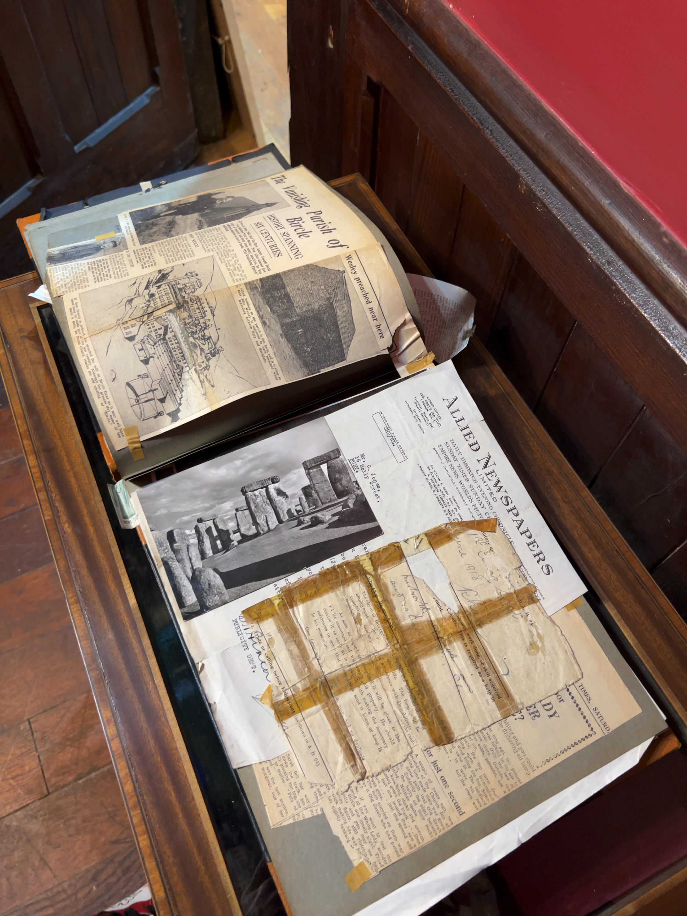 The ephemera includes a single-page letter on Royal British Legion stationery dated 22 April 1977, addressed to Charlie and signed by Bill Dunks, detailing a commemorative pilgrimage to Arras and France. Additional contents include a large monochrome portrait print of Sir Winston Churchill, a newspaper clipping regarding a £2 a Week for Life election committee competition mentioning Sir W.A. Jowitt, and local history articles titled The Vanishing Parish of Birtle and Wesley Preached Near Here. A large-format newspaper page from Allied Newspapers Limited features a photographic study of Stonehenge.