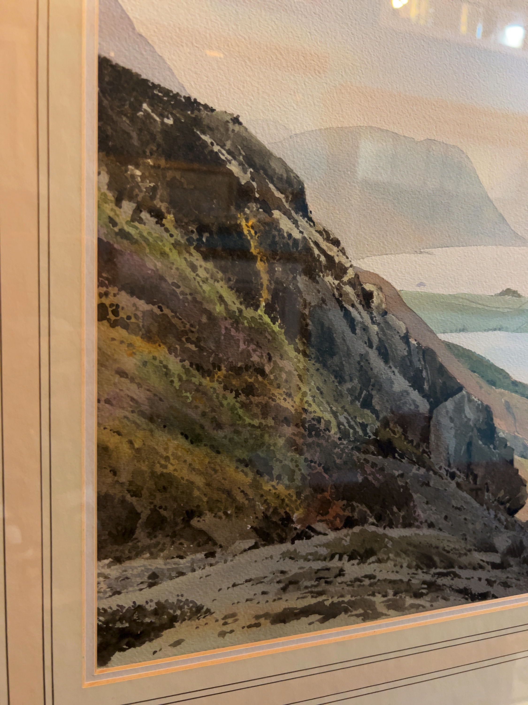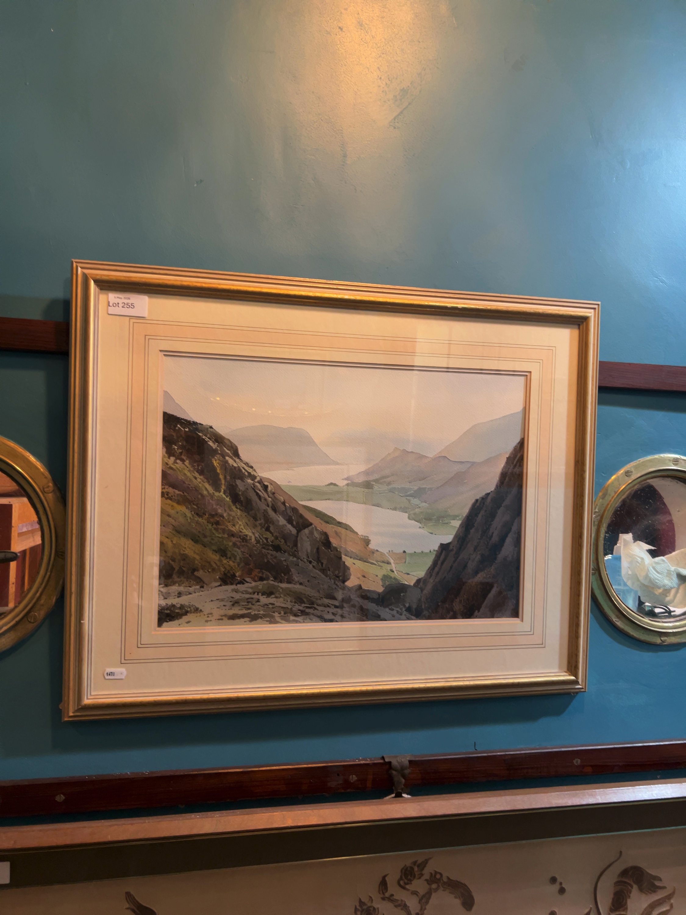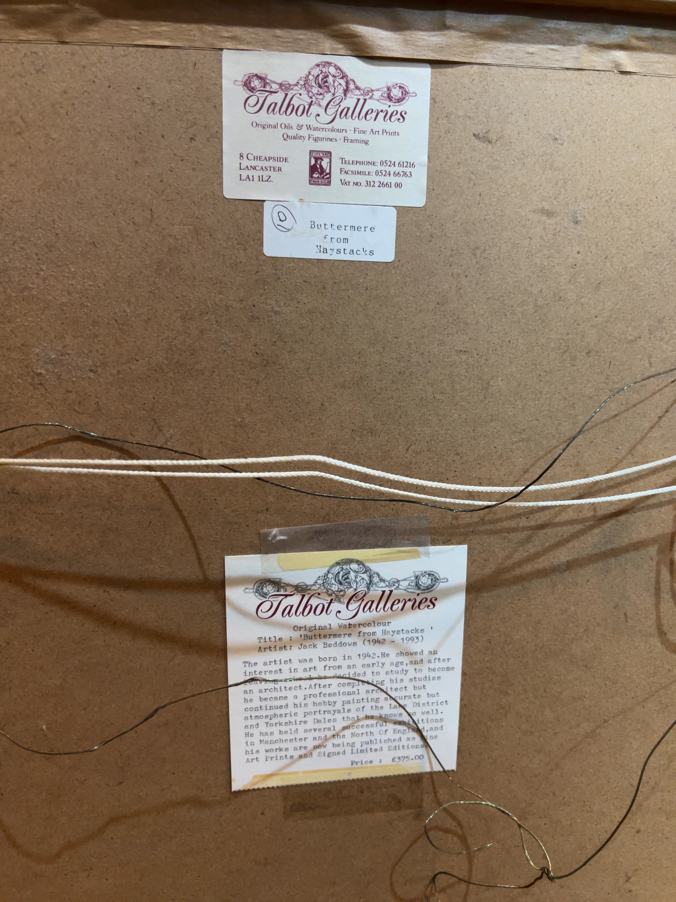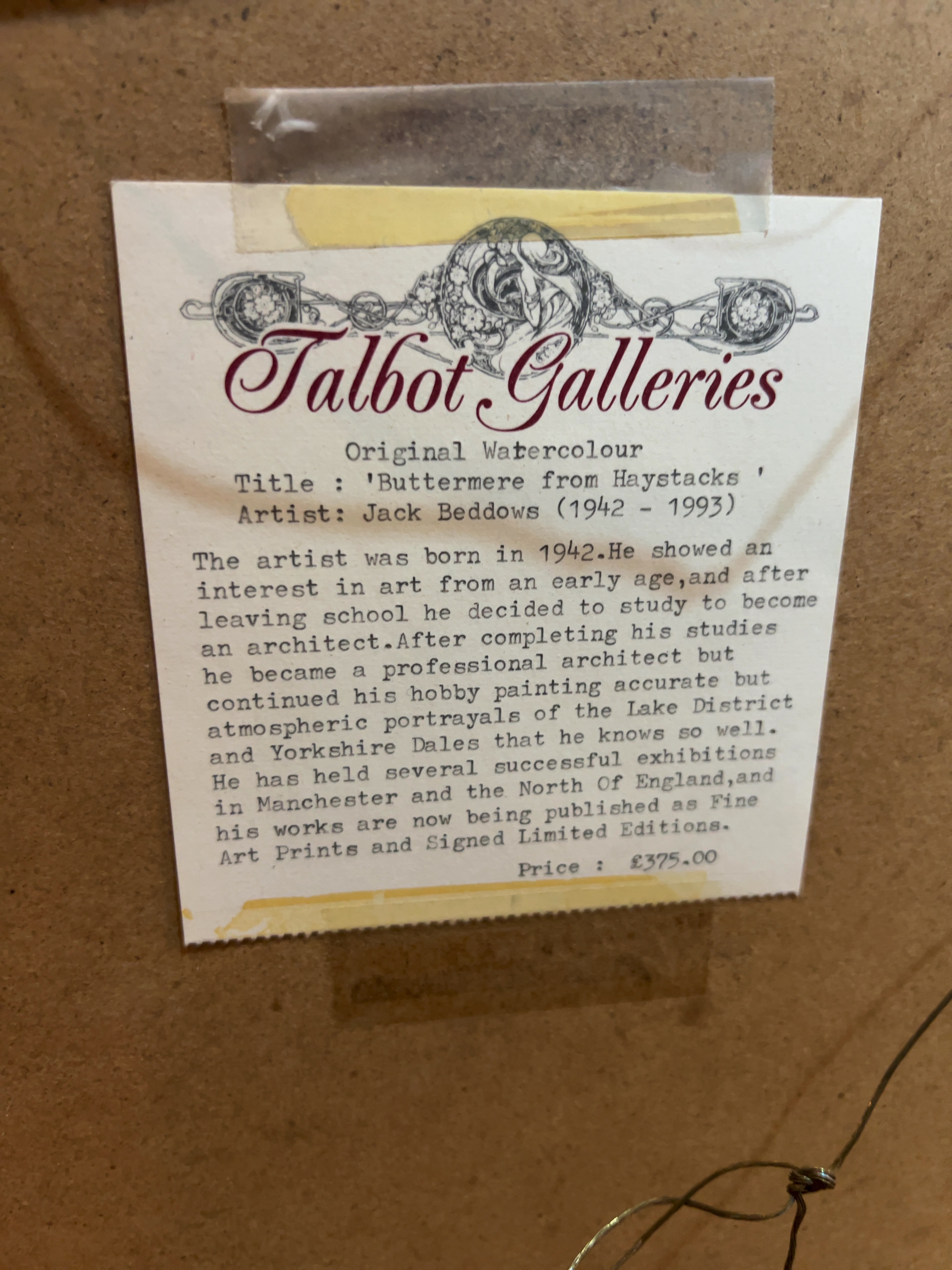 This original watercolour on paper, titled ‘Buttermere from Haystacks’, is by the British artist and architect Jack Beddows. The verso retains two labels from Talbot Galleries, Lancaster. One label provides a detailed biography of the artist, noting his professional background as an architect and his focus on portraying the Lake District and Yorkshire Dales. This label also includes the title, artist’s dates, and a previous retail price of £375.00.