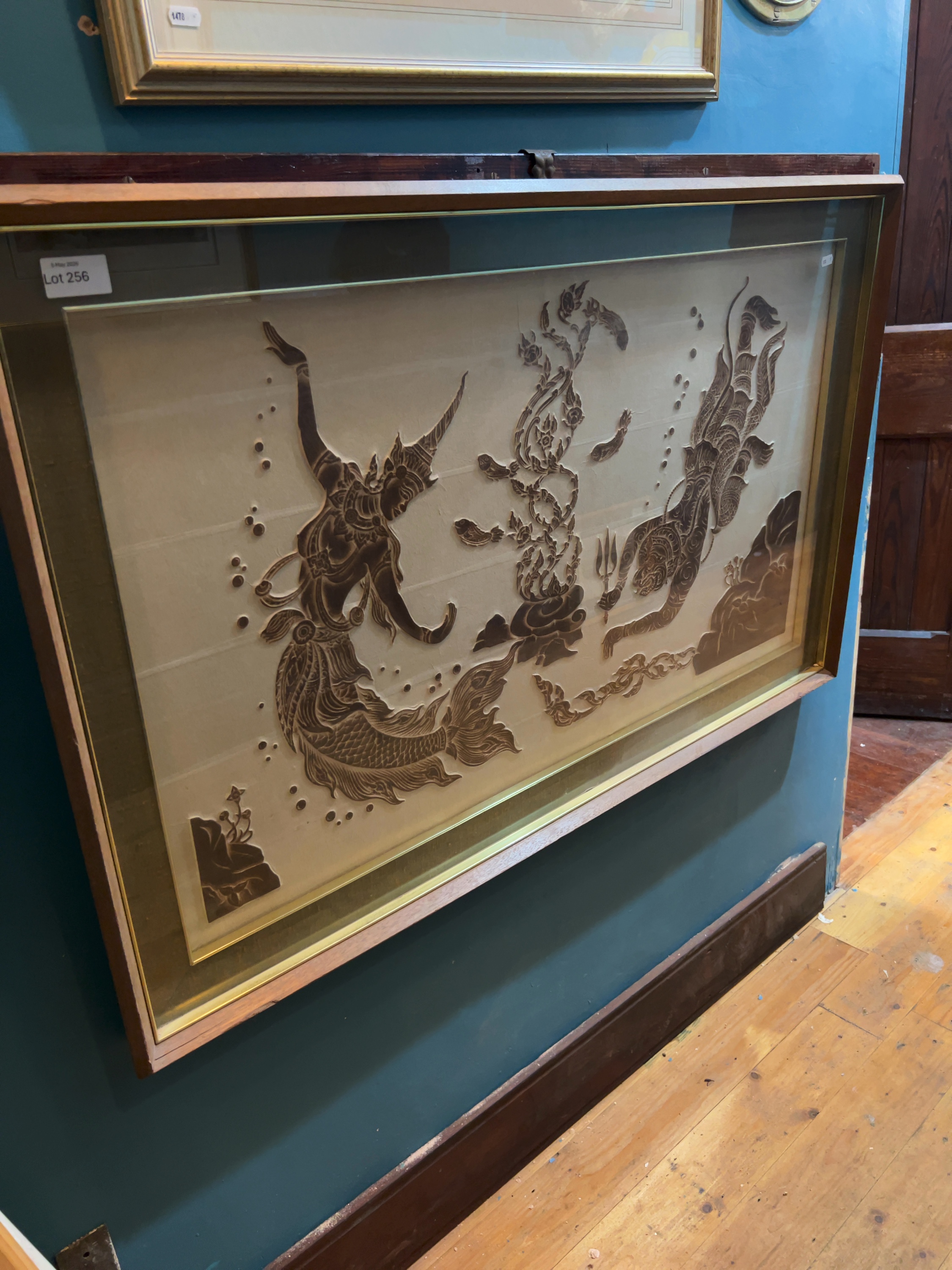 The artwork and mounting appear to be in good condition. The wooden frame shows minor age-related wear, including some light scuffing and small marks to the surface. The backing board shows typical signs of age and handling.