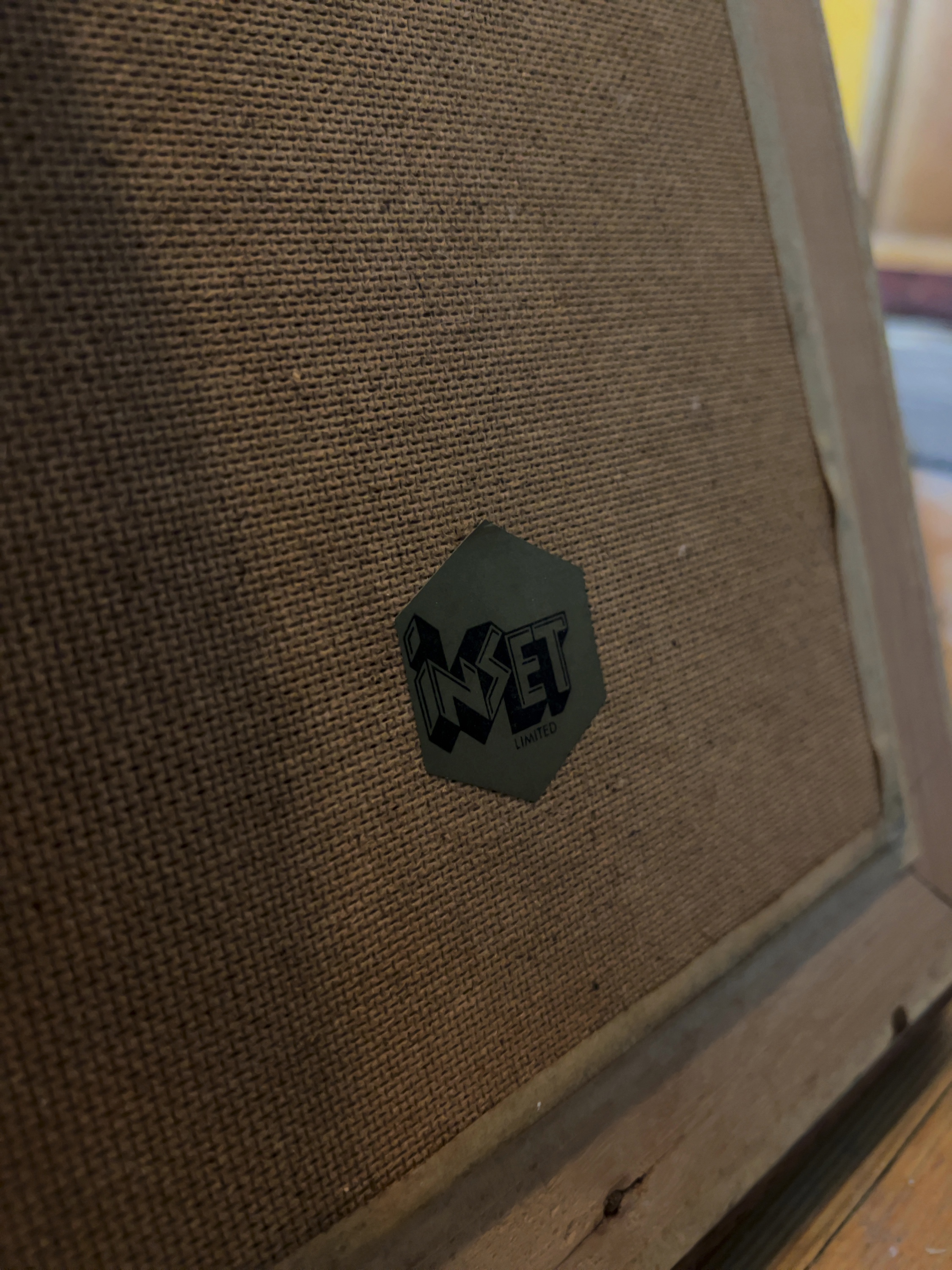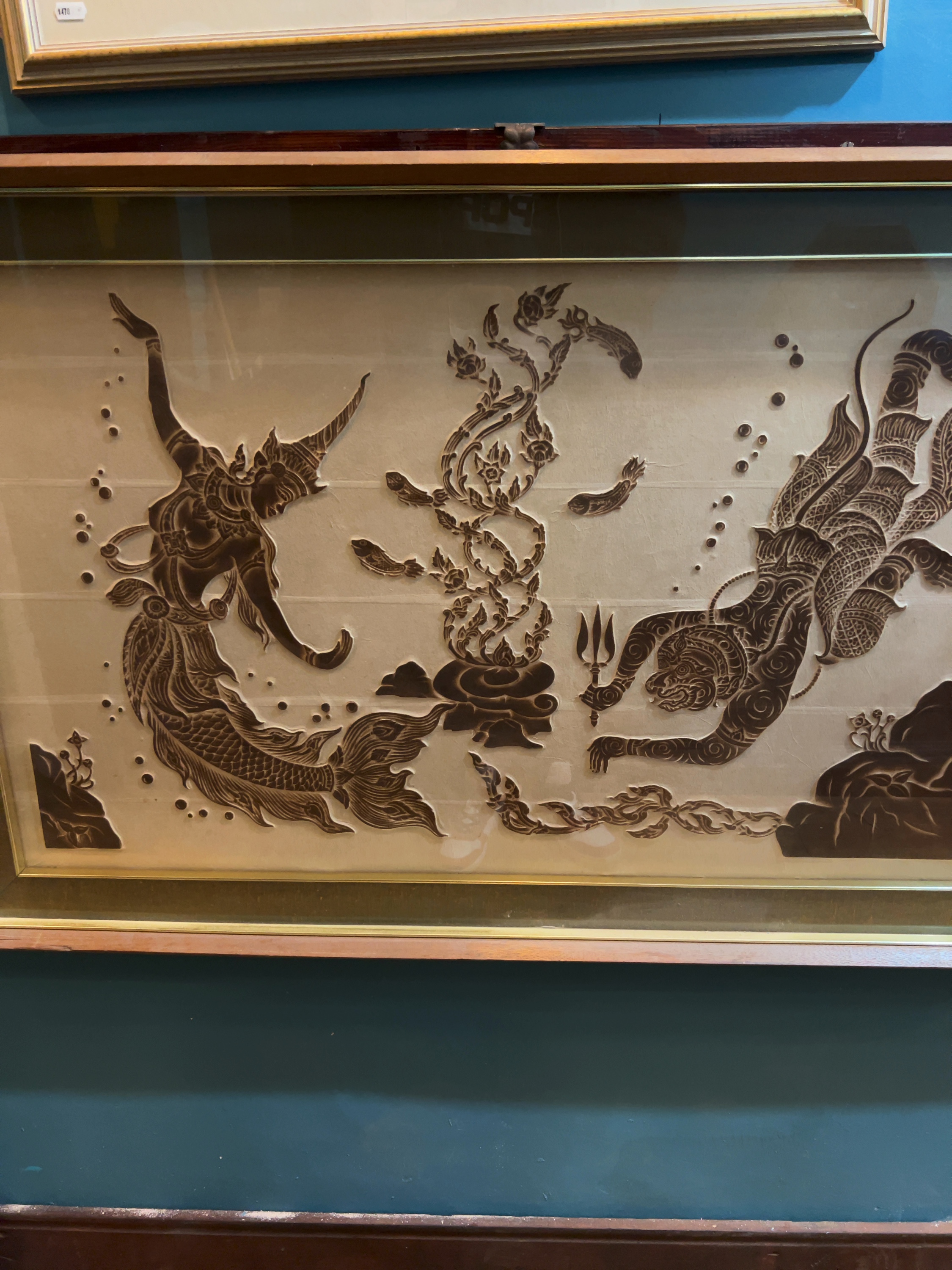 A mid-to-late 20th-century decorative wall plaque produced by Inset Limited. The rectangular low-relief artwork features figures from the Ramakien, the Thai national epic. The reverse of the frame retains an original hexagonal metallic manufacturer label for Inset Limited.