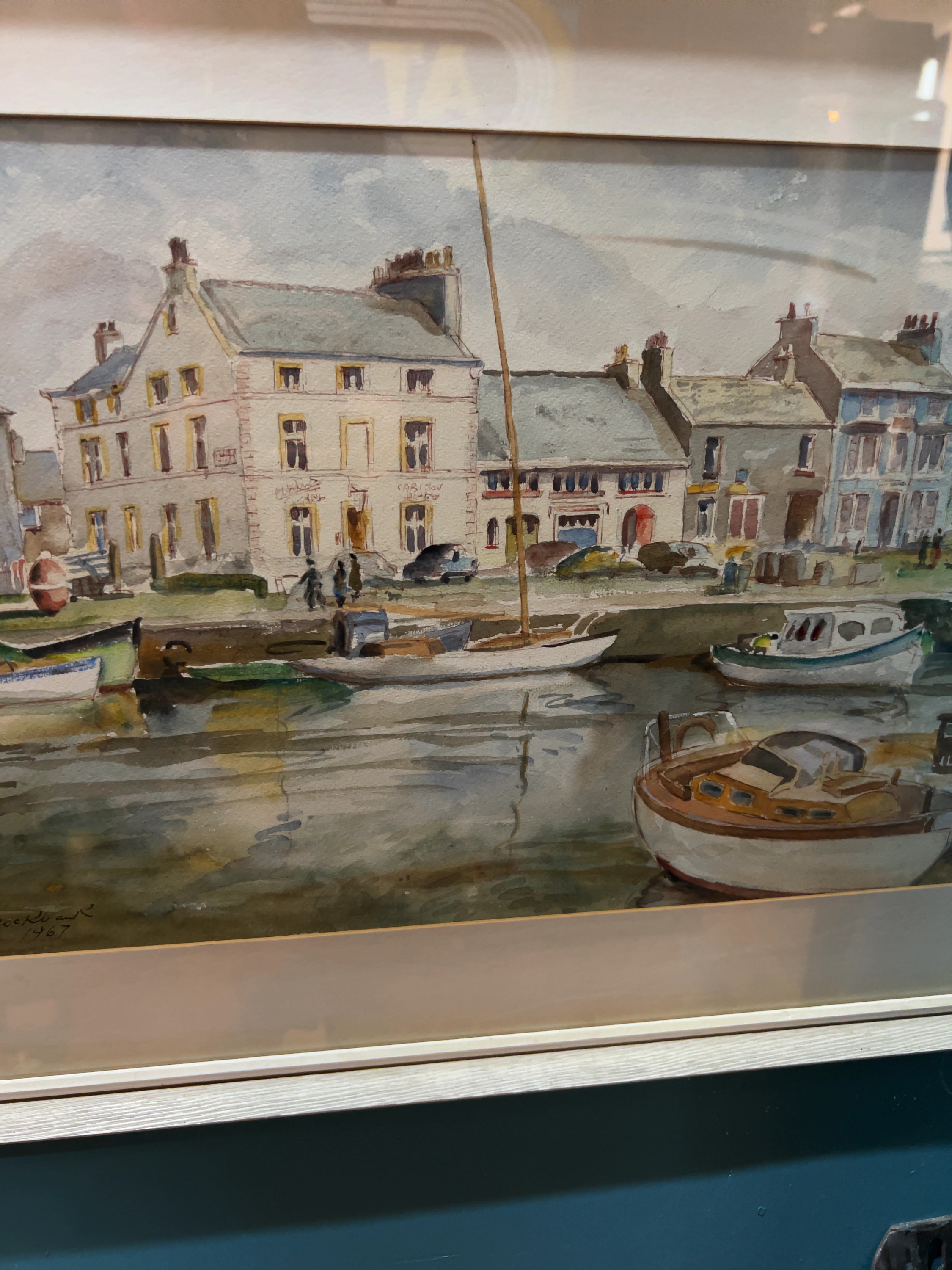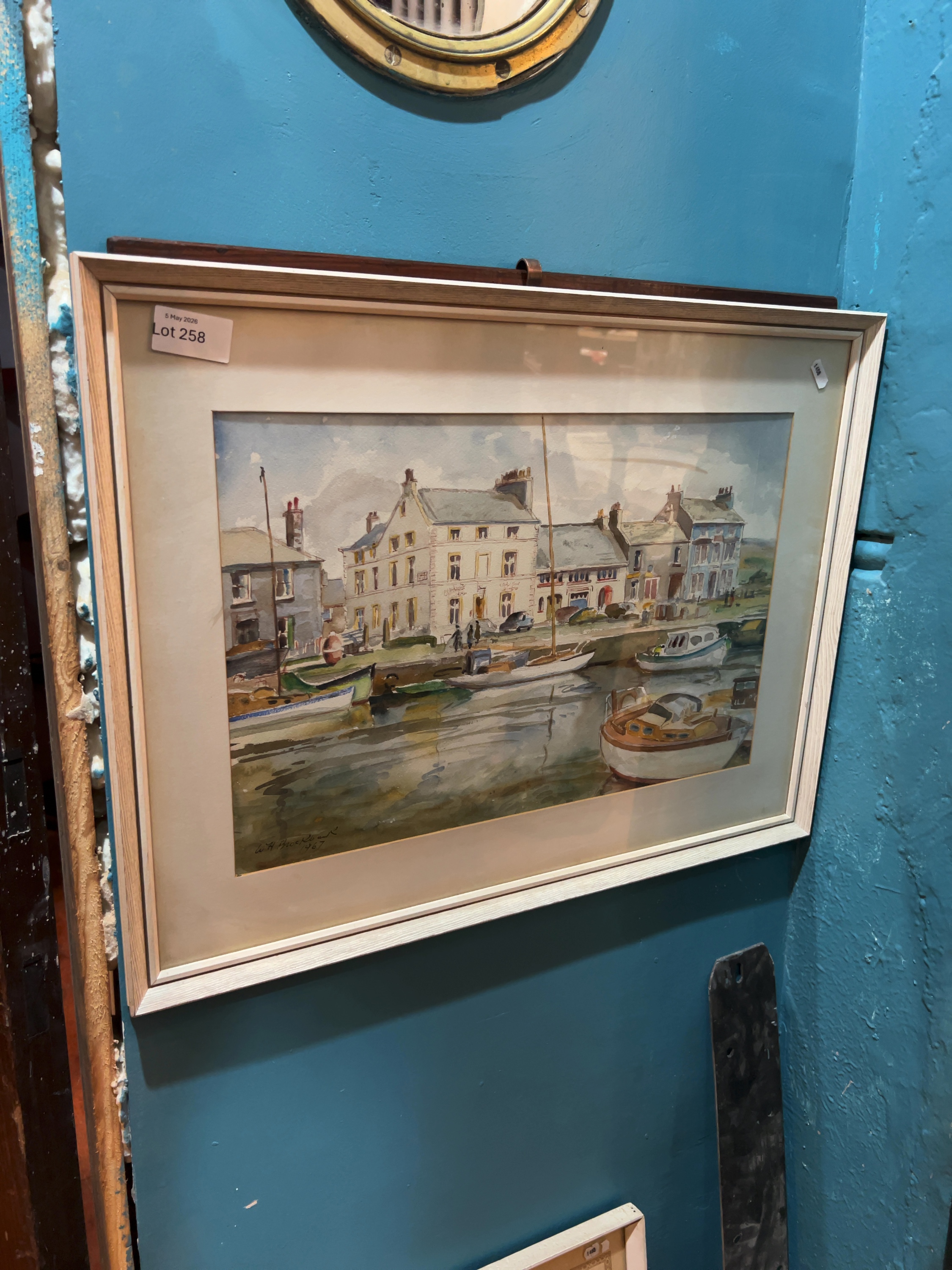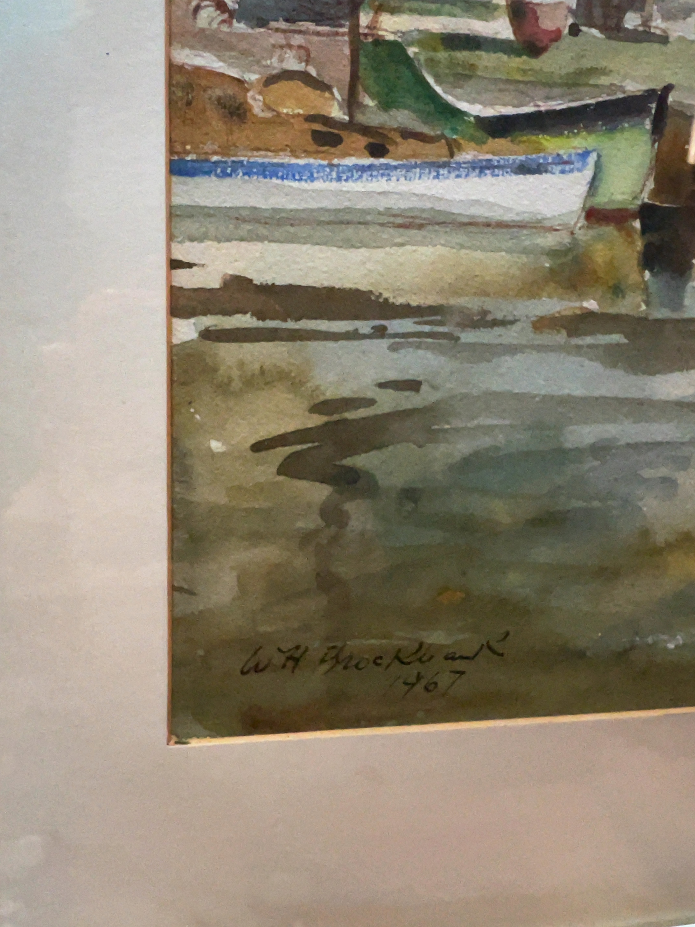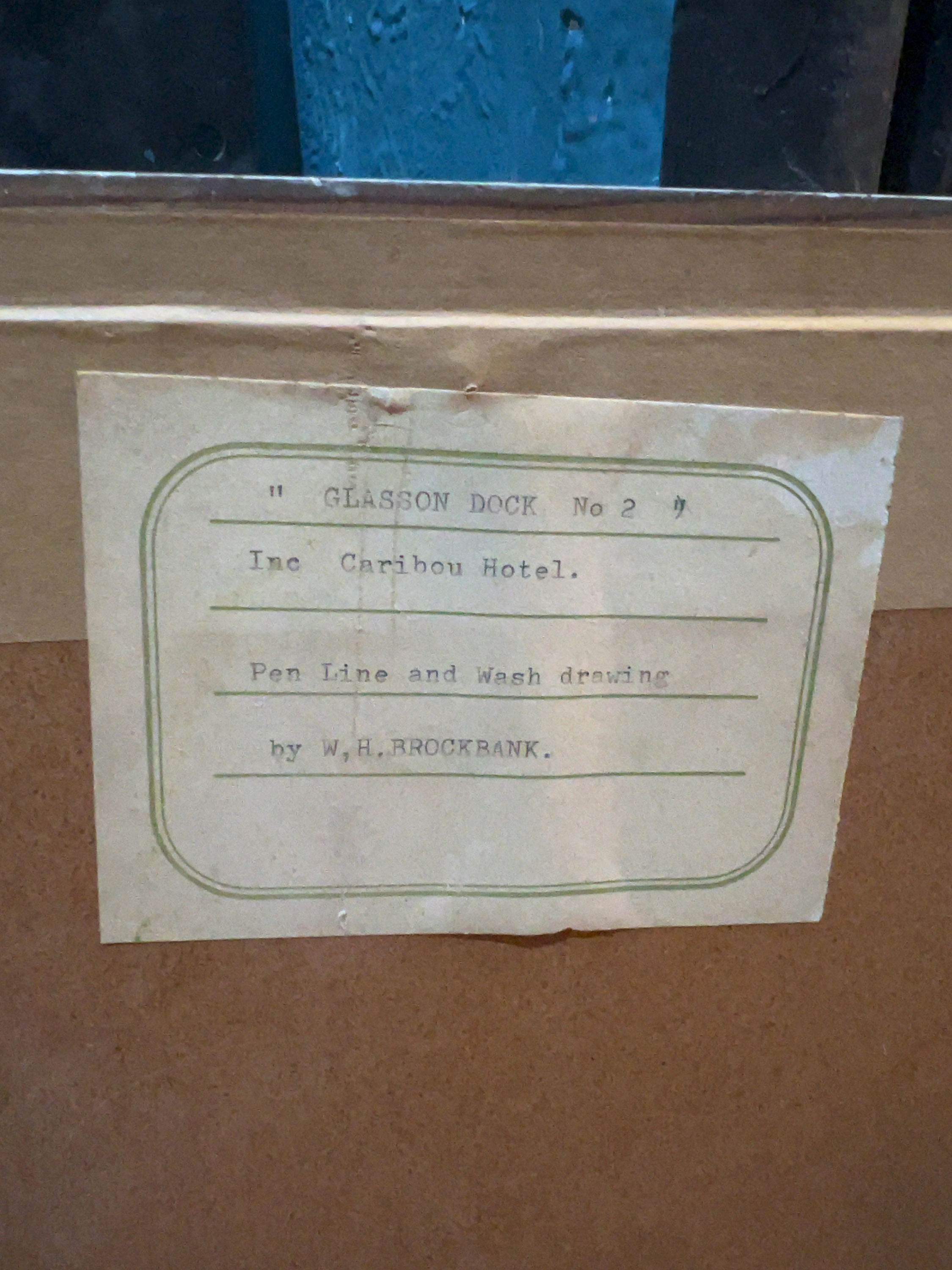 This mid-20th-century topographical scene depicts Glasson Dock in Lancashire, specifically featuring the Caribou Hotel signed and dated W.H. Brockbank 1967 in the lower-left corner. A typed label on the verso provides further documentation, reading: GLASSON DOCK No 2 Inc Caribou Hotel. Pen Line and Wash drawing by W, H. BROCKBANK.
