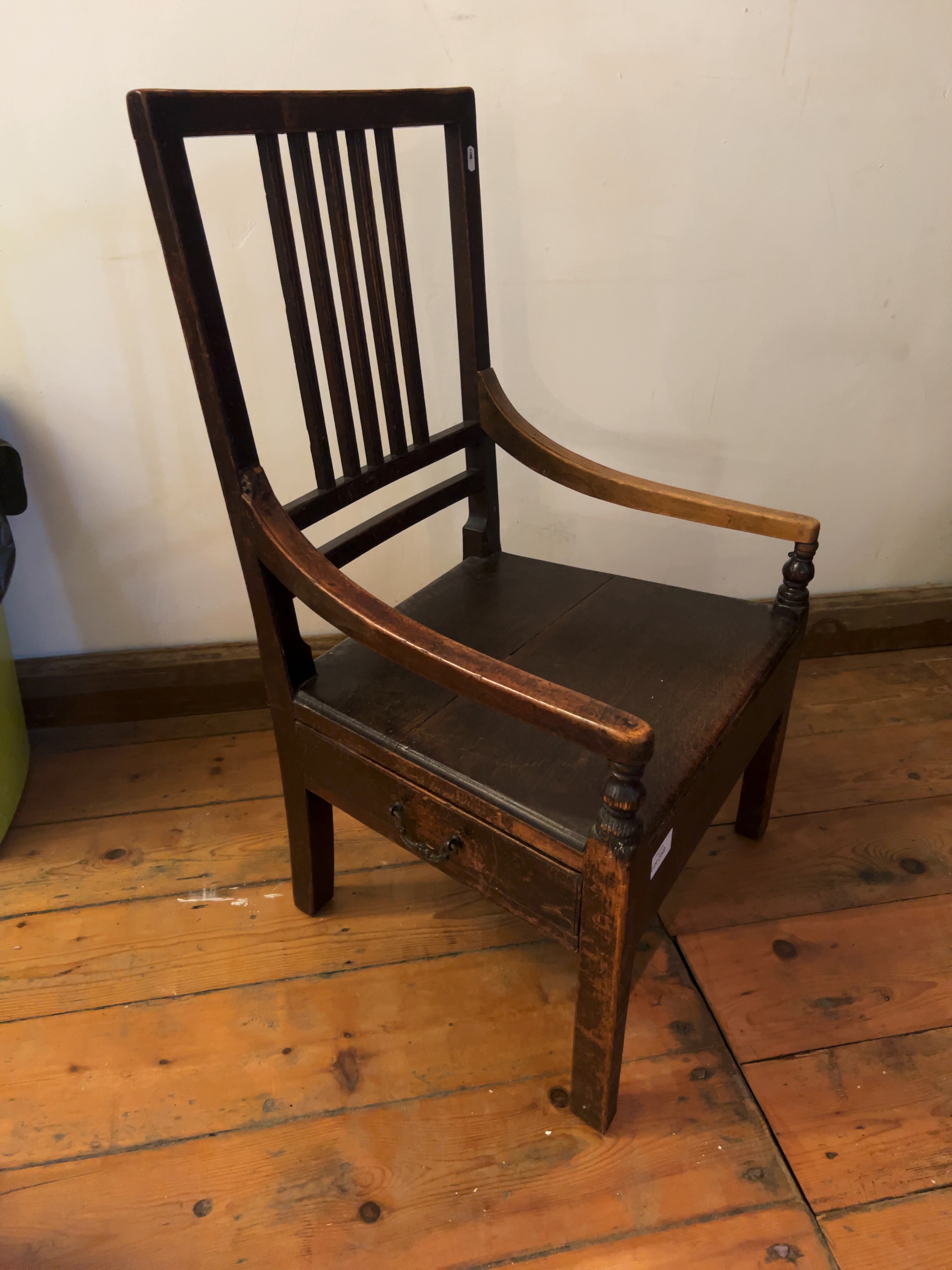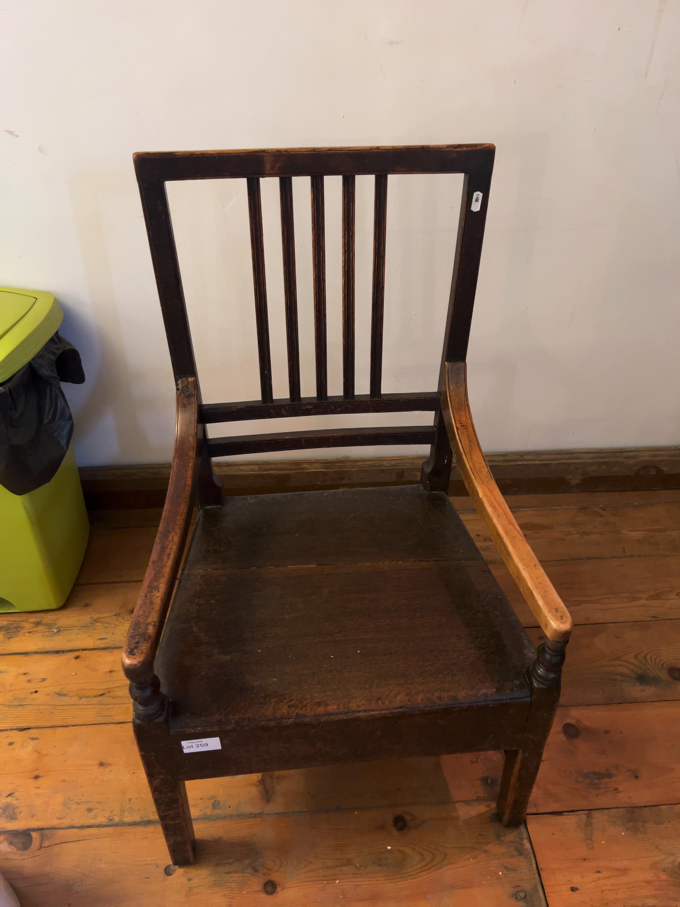 An English provincial oak armchair of box-seat construction, dating from the late 18th or early 19th century. No maker’s marks or stamps are visible on the piece.