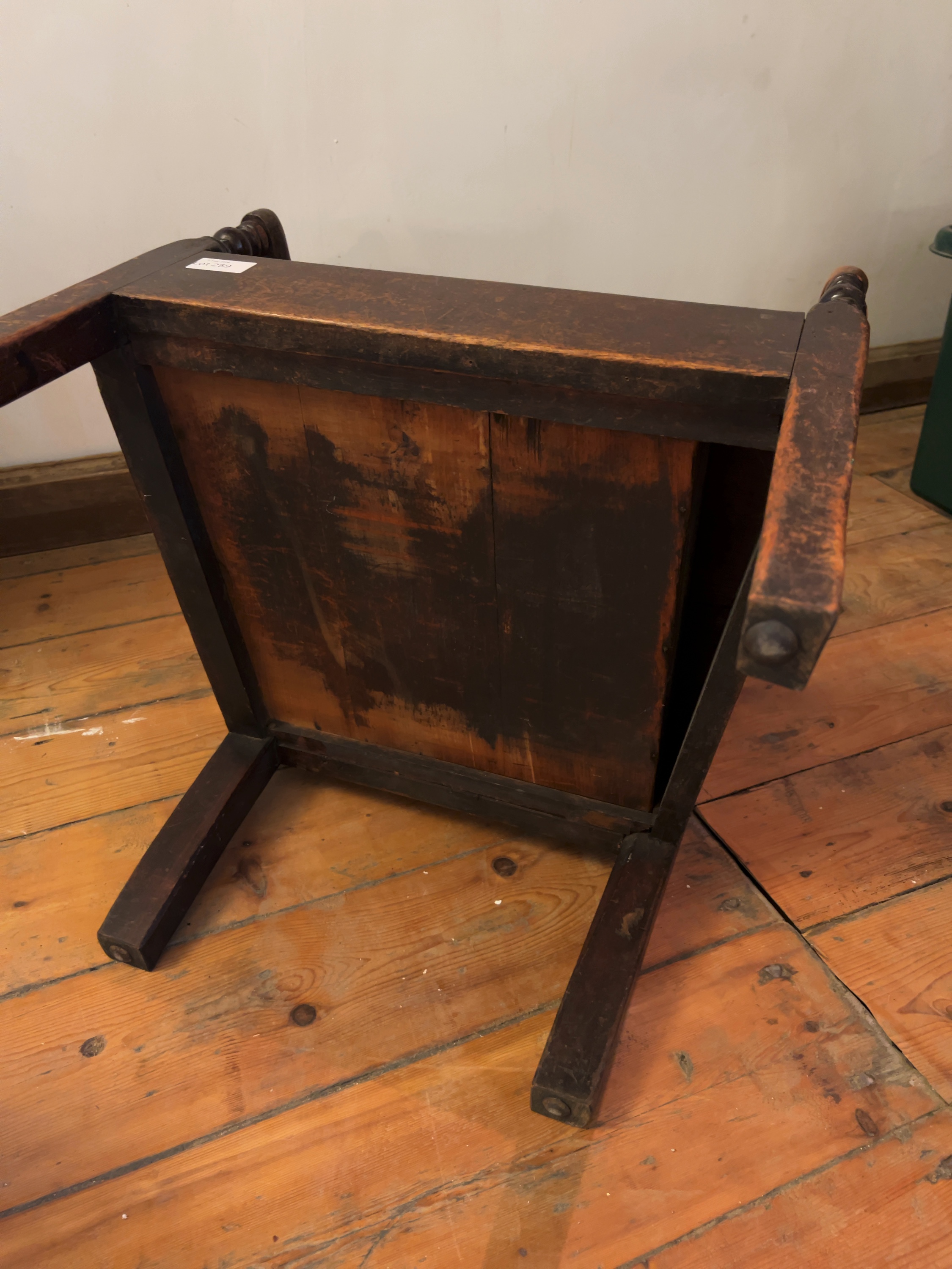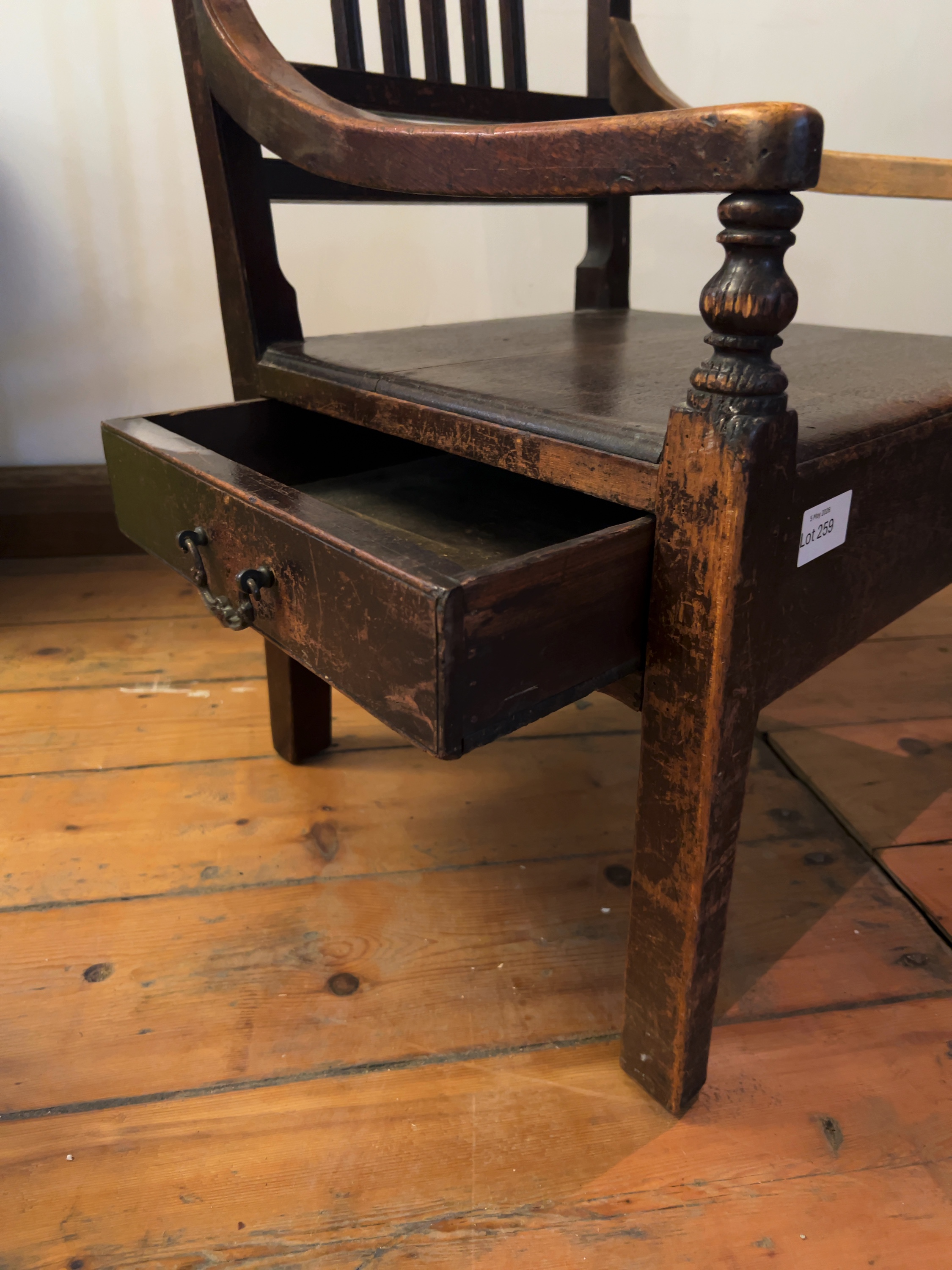 The chair is in worn, unrestored condition. There is significant wear and loss to the dark-stained finish, particularly on the armrests and front legs, where the lighter natural oak is visible. The wooden surfaces show various scuffs, scratches, and small chips commensurate with age and domestic use. The metal drawer handle shows heavy oxidation. There are visible signs of historic woodworm activity, particularly on the lower legs and apron. The drawer is functional but shows wear to the internal runners and base.