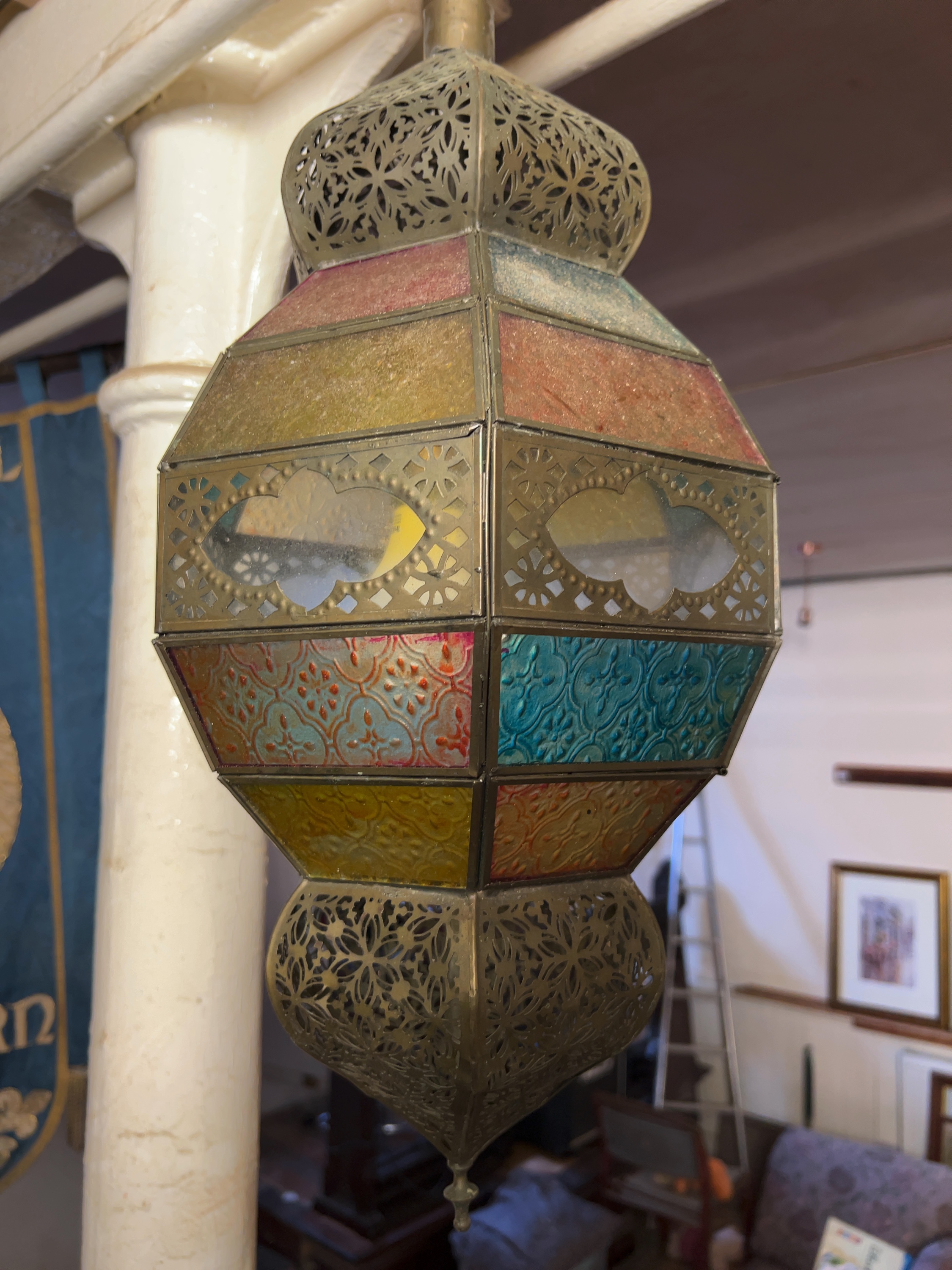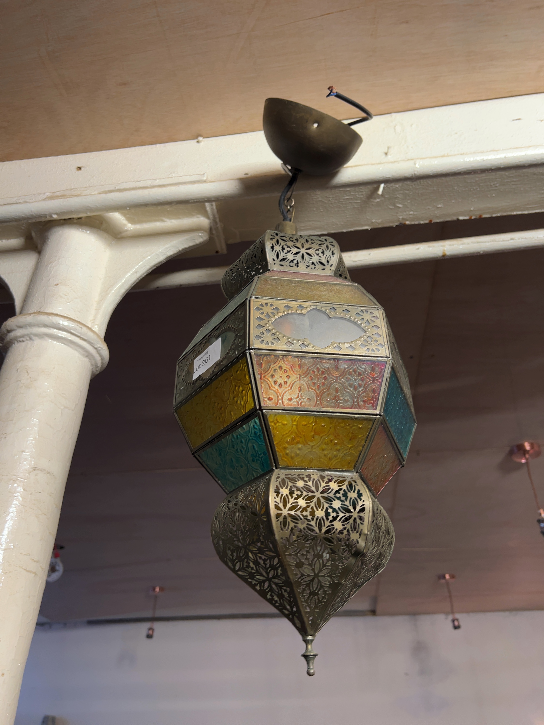 A Moroccan-style hanging pendant lantern of multi-faceted form. The piece is unmarked and currently bears a rectangular white auction lot label marked Lot 261 to one glass panel.