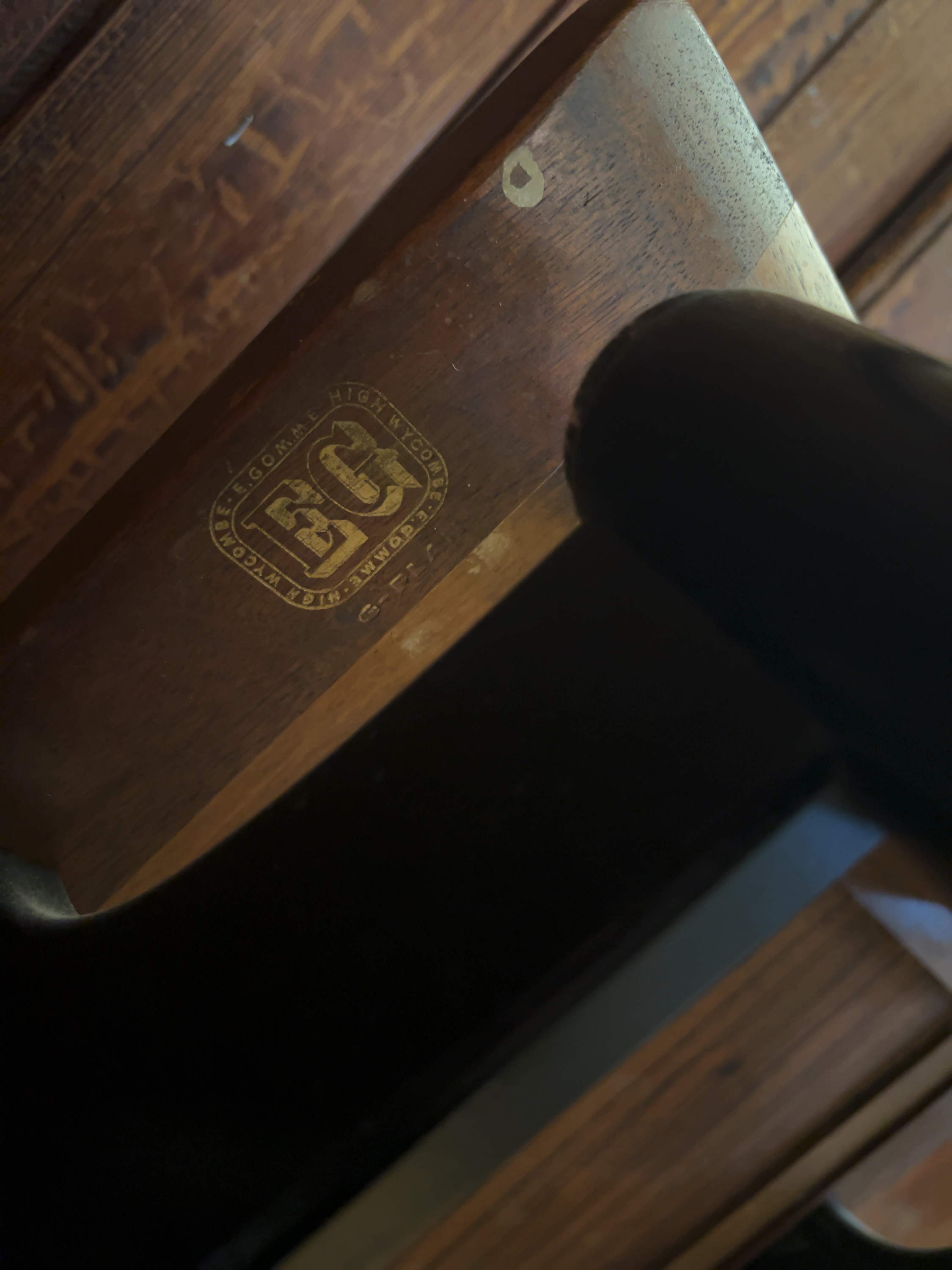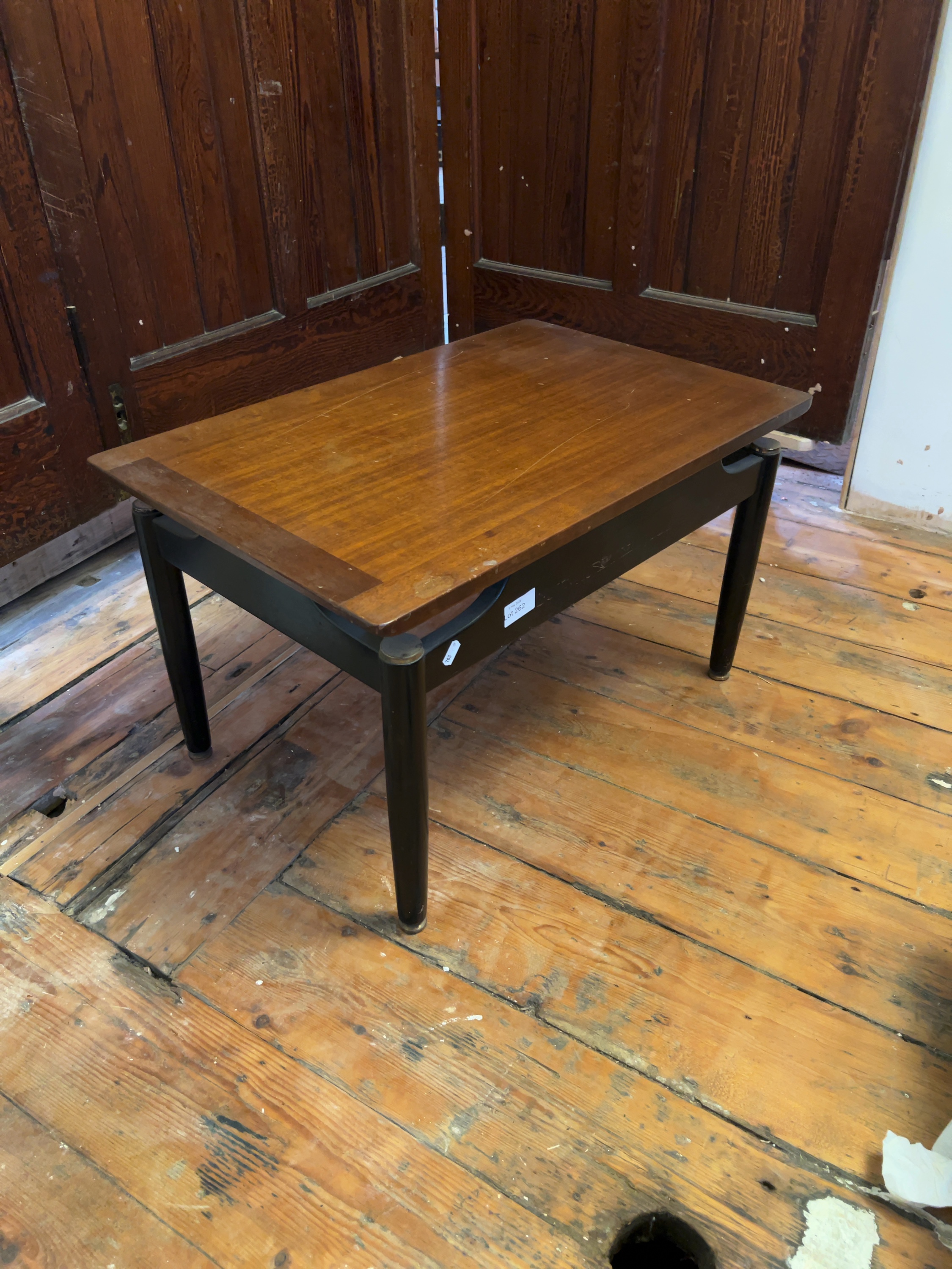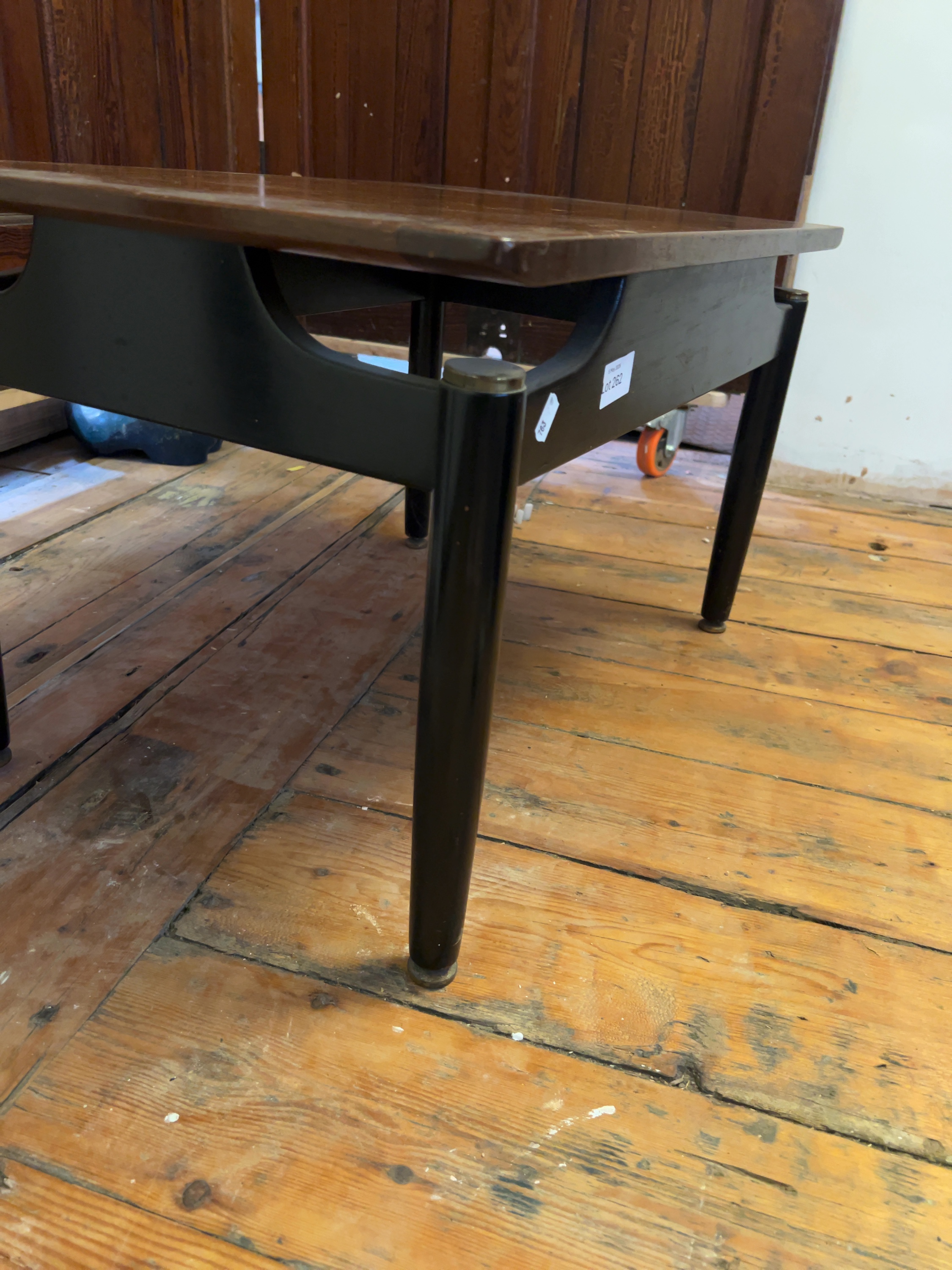 A mid-century modern coffee table from the Tola and Black range, often referred to as Librenza, manufactured by G-Plan in Tola wood (African Mahogany) veneer. Bearing a gold-stamped circular logo for E. Gomme Ltd. of High Wycombe, featuring the stylised letters EG and the words E. GOMME, HIGH WYCOMBE, and G-PLAN.