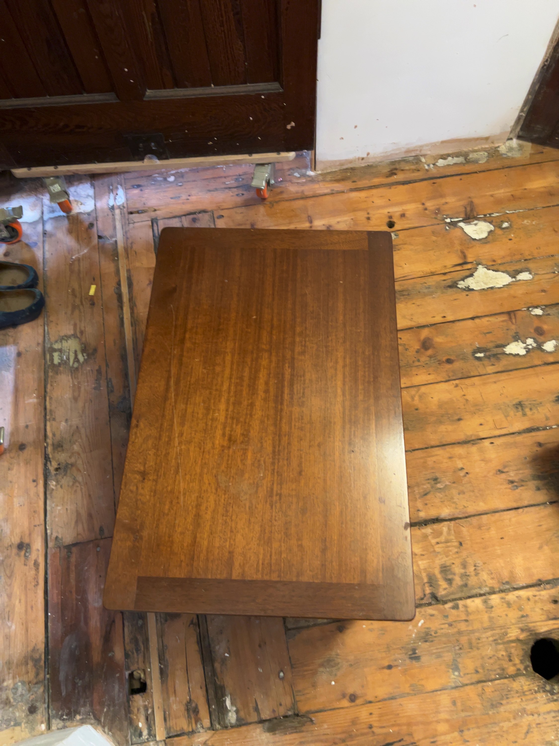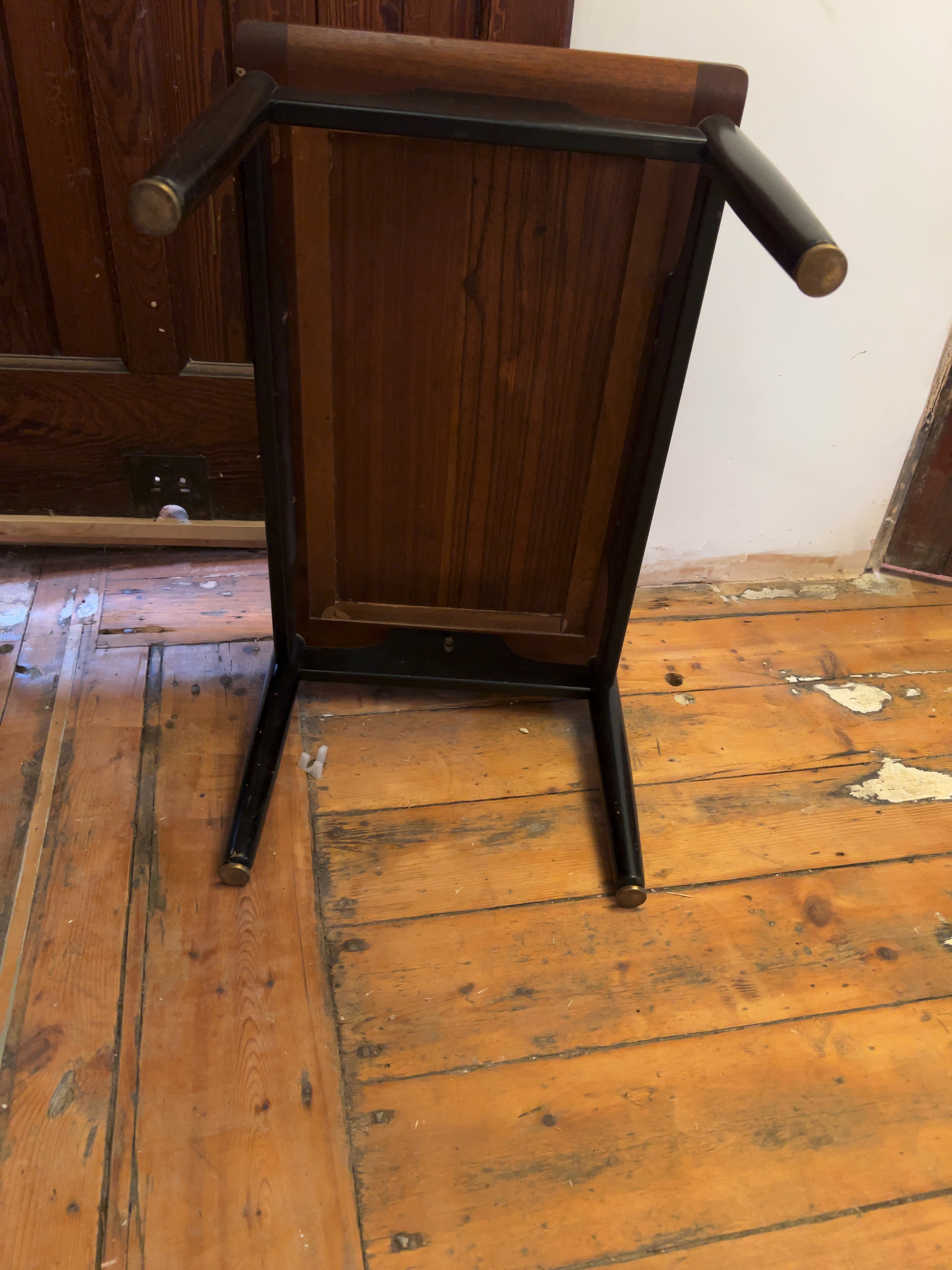 The table presents in used vintage condition consistent with its age. The veneered top shows several surface scratches and areas of wear to the finish. The ebonised frame and legs exhibit minor scuffs and paint loss, particularly around the edges and feet. The brass ferrules show a natural aged patina. Auction lot stickers are present on the frame.
