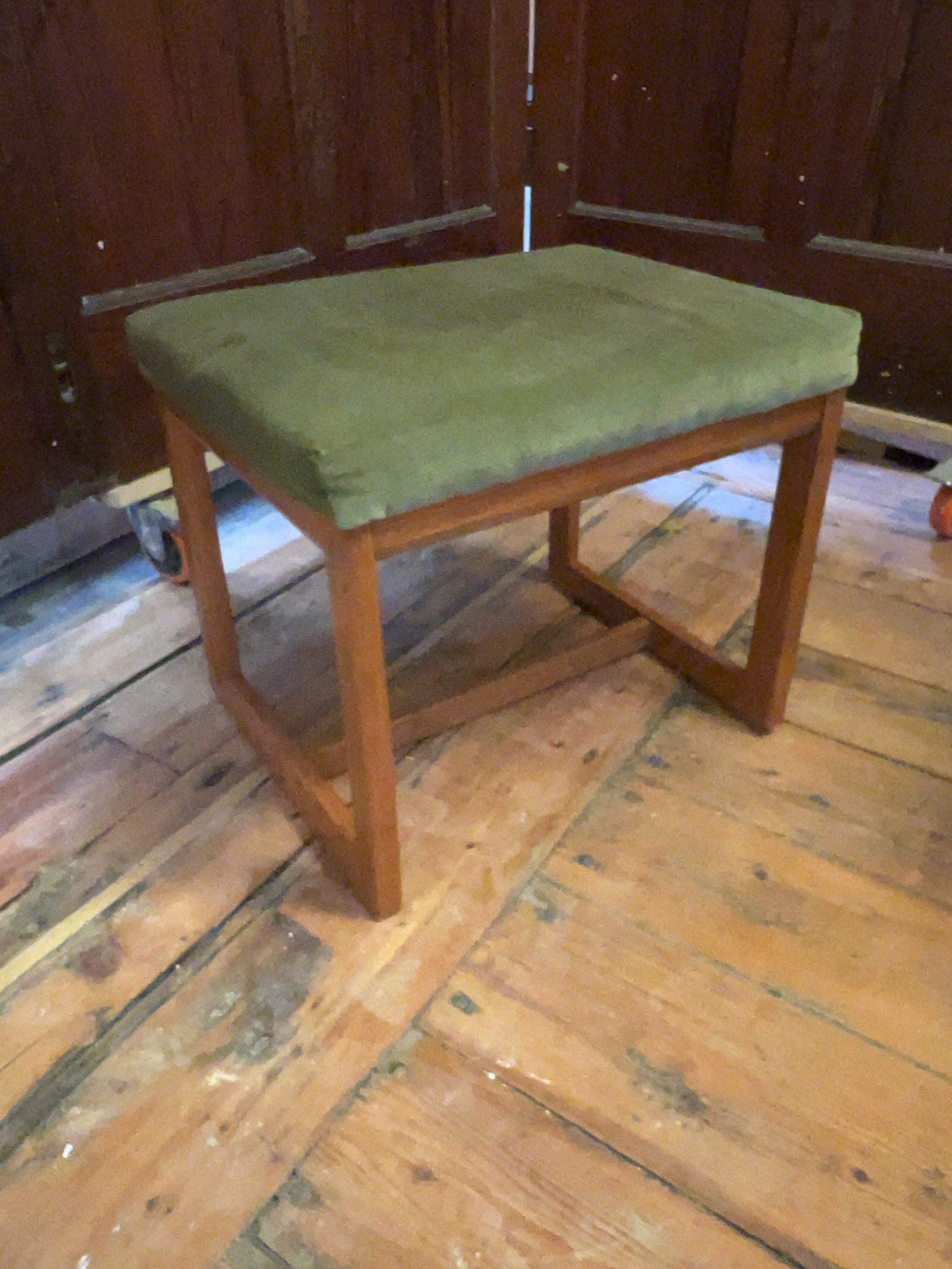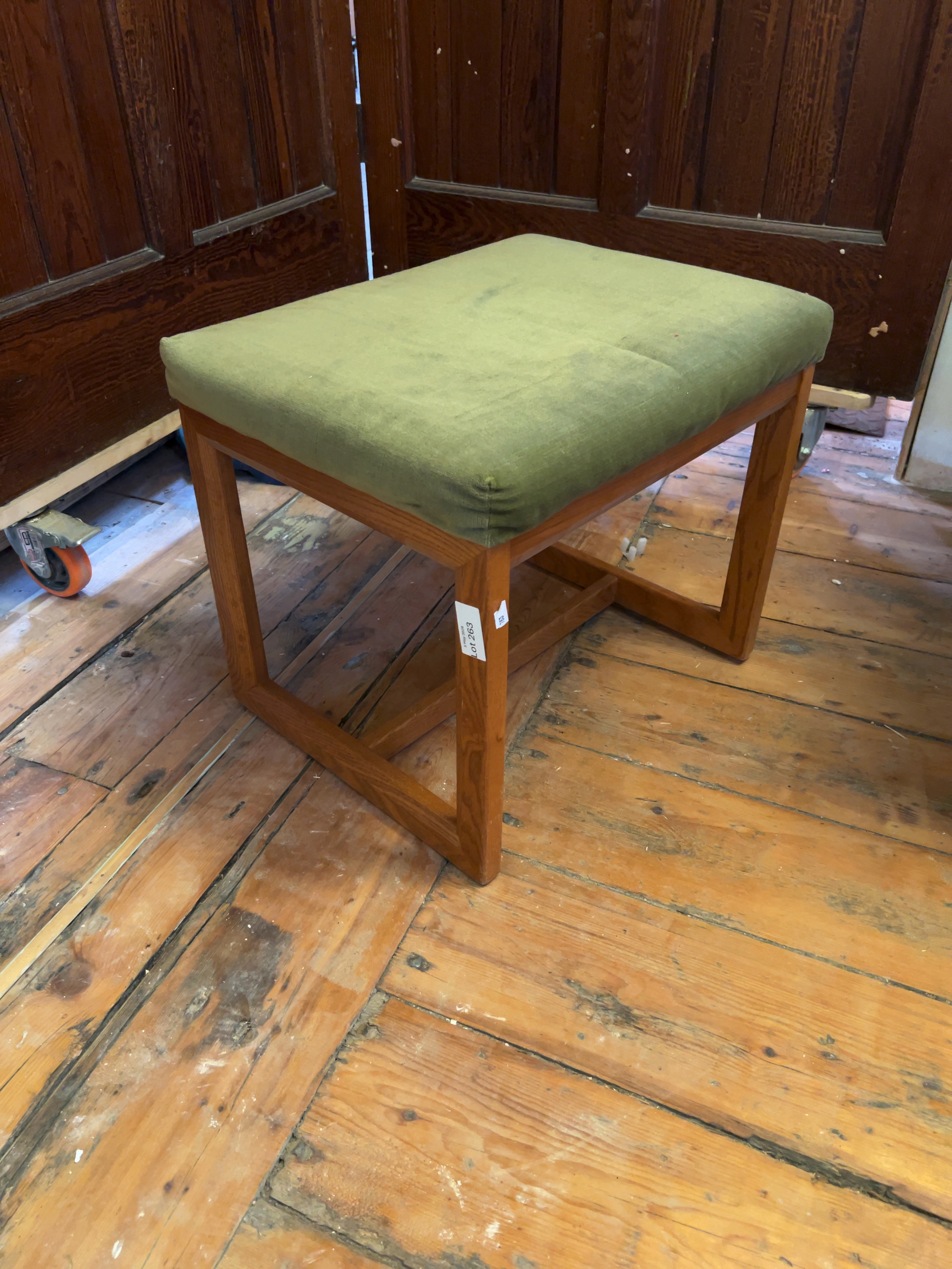 The stool is in good vintage condition. The teak frame shows minor surface wear and light scuffing consistent with age and use. The upholstery remains intact but displays some light marking and pile-crush to the top surface. A paper auction lot sticker is currently attached to one leg.