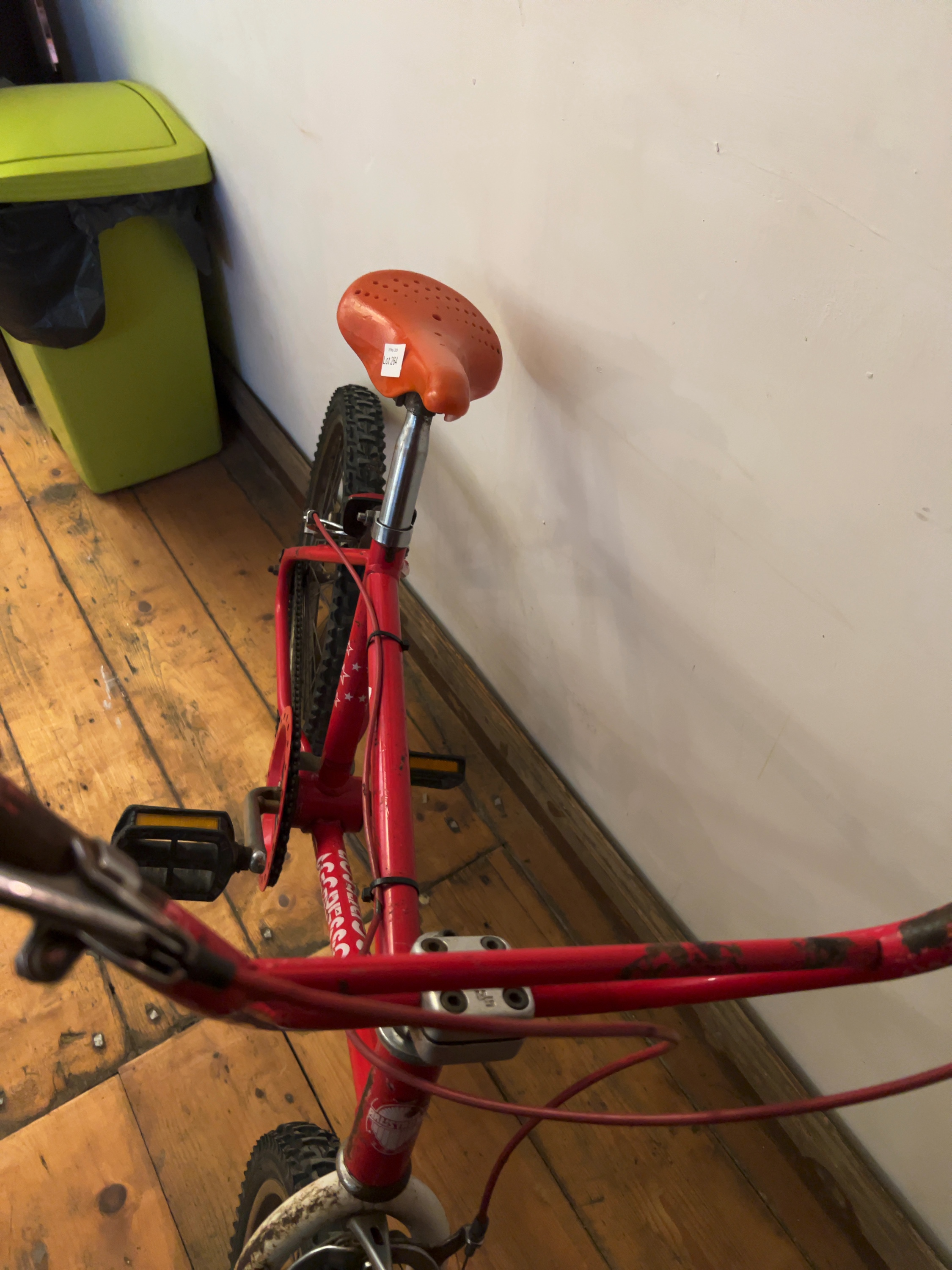 The bicycle is offered in an as-found condition suitable for restoration. There is significant visible surface rust and pitting to the white front forks, chrome-plated seat post, and handlebar stem. The red paintwork shows numerous scratches, chips, and areas of wear across the frame. The orange plastic seat exhibits surface grime and general signs of age. The mechanical functionality of the brakes and drivetrain has not been tested.