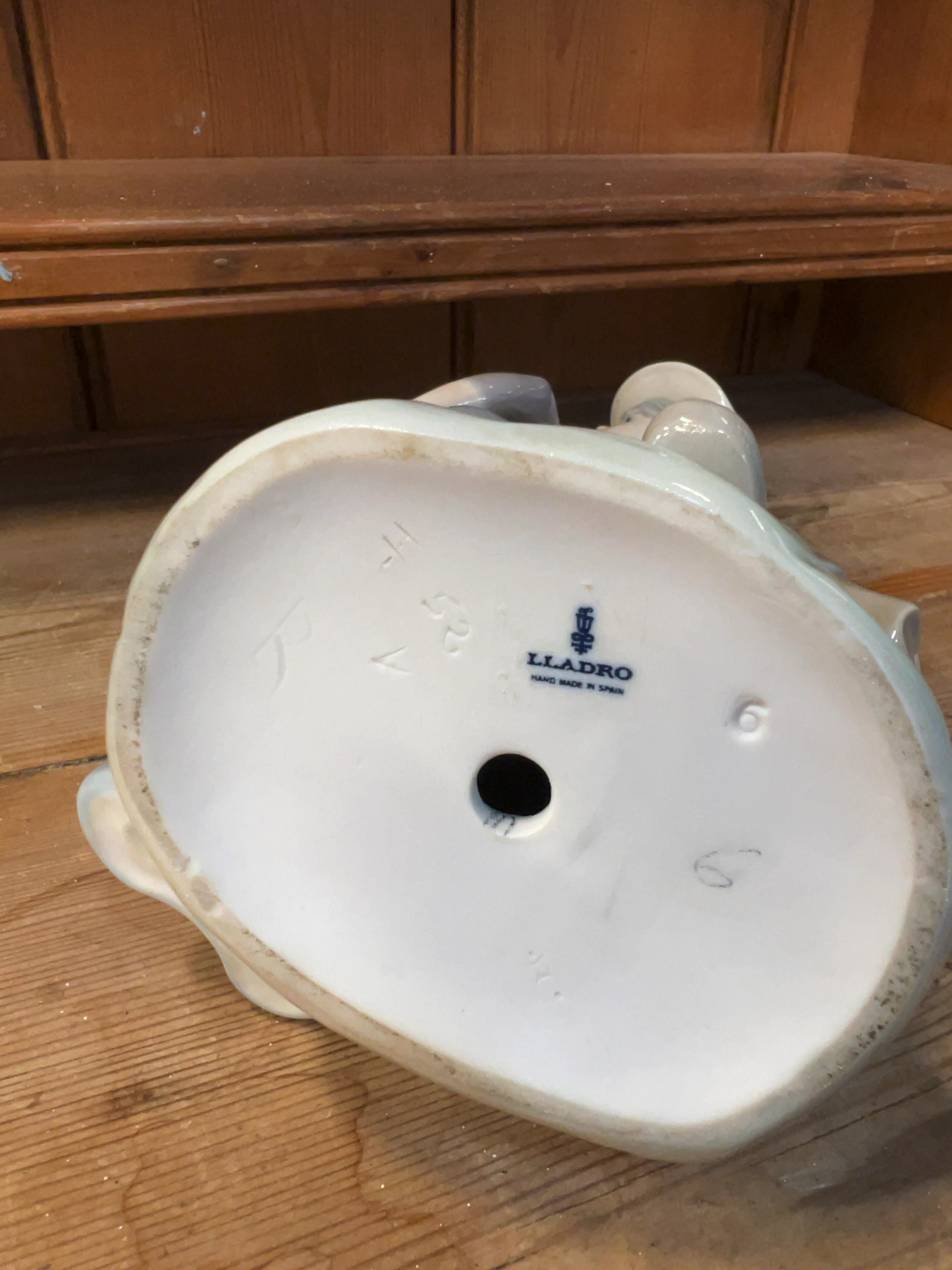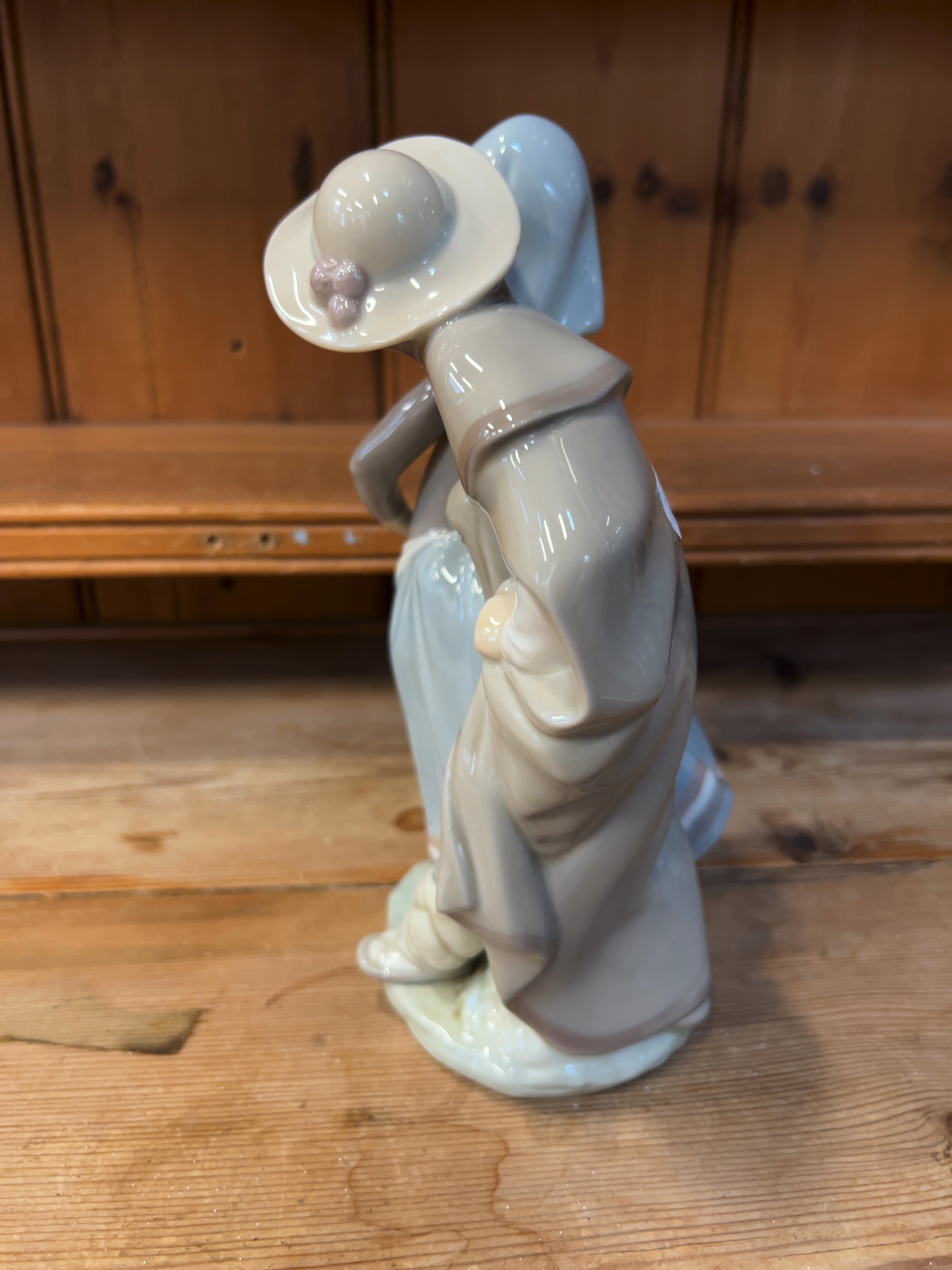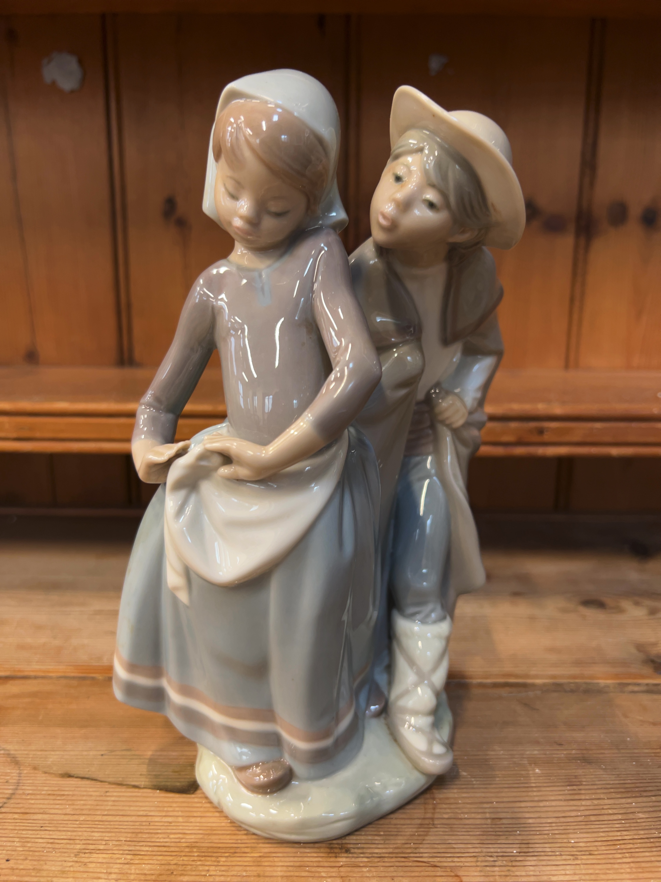 A Spanish glazed porcelain figurine by Lladro, titled A Kiss to Remember (also known as Bashful Couple). Designed by Salvador Debón and identified by model numbers 4869 or 1188, depicts a young rustic couple in a romantic pose.The underside of the base bears the blue printed Lladro bell-flower logo and the words LLADRO HAND MADE IN SPAIN. Several incised marks are also present, including H-52, V, R, 6, and a further 6.