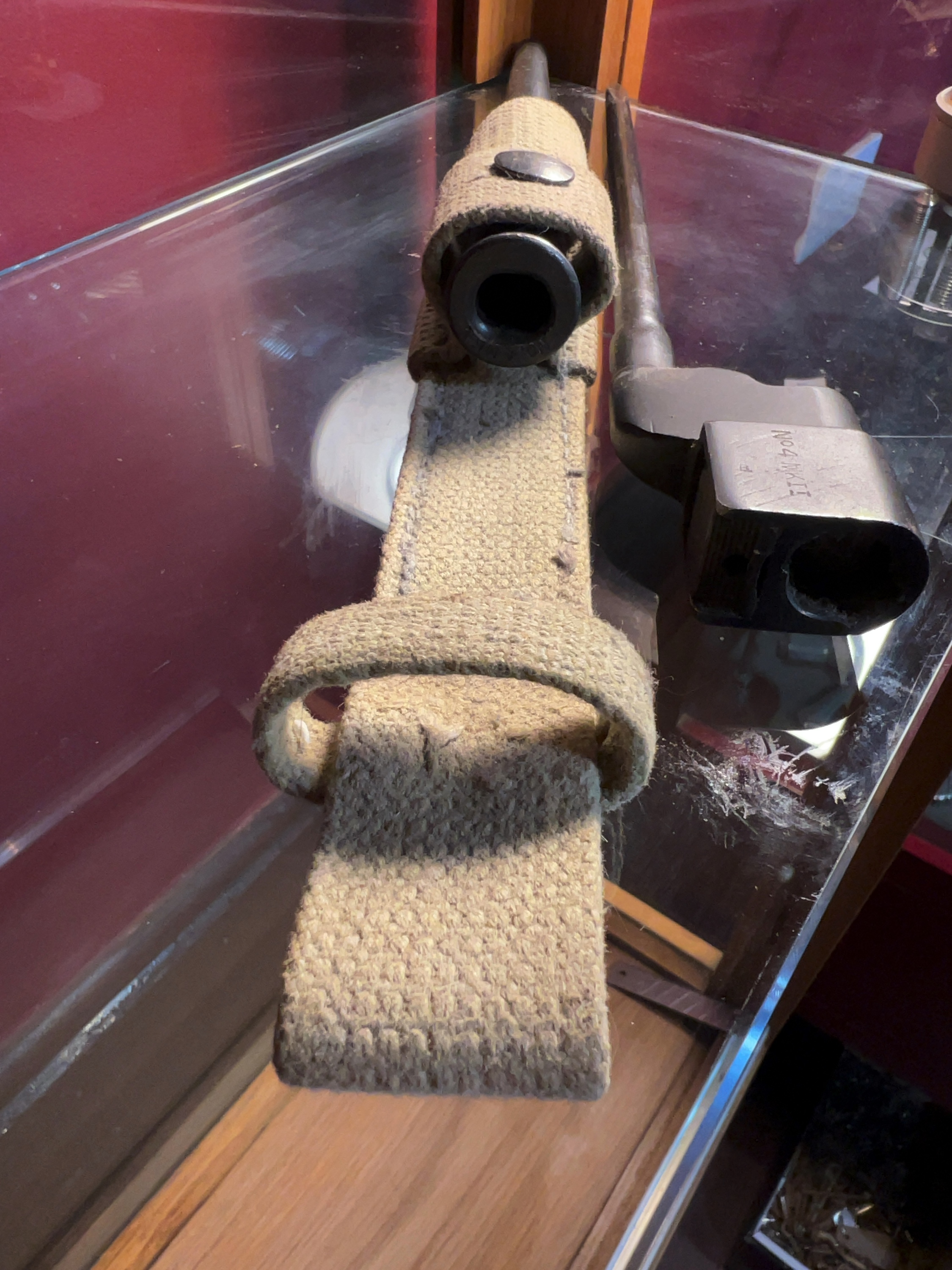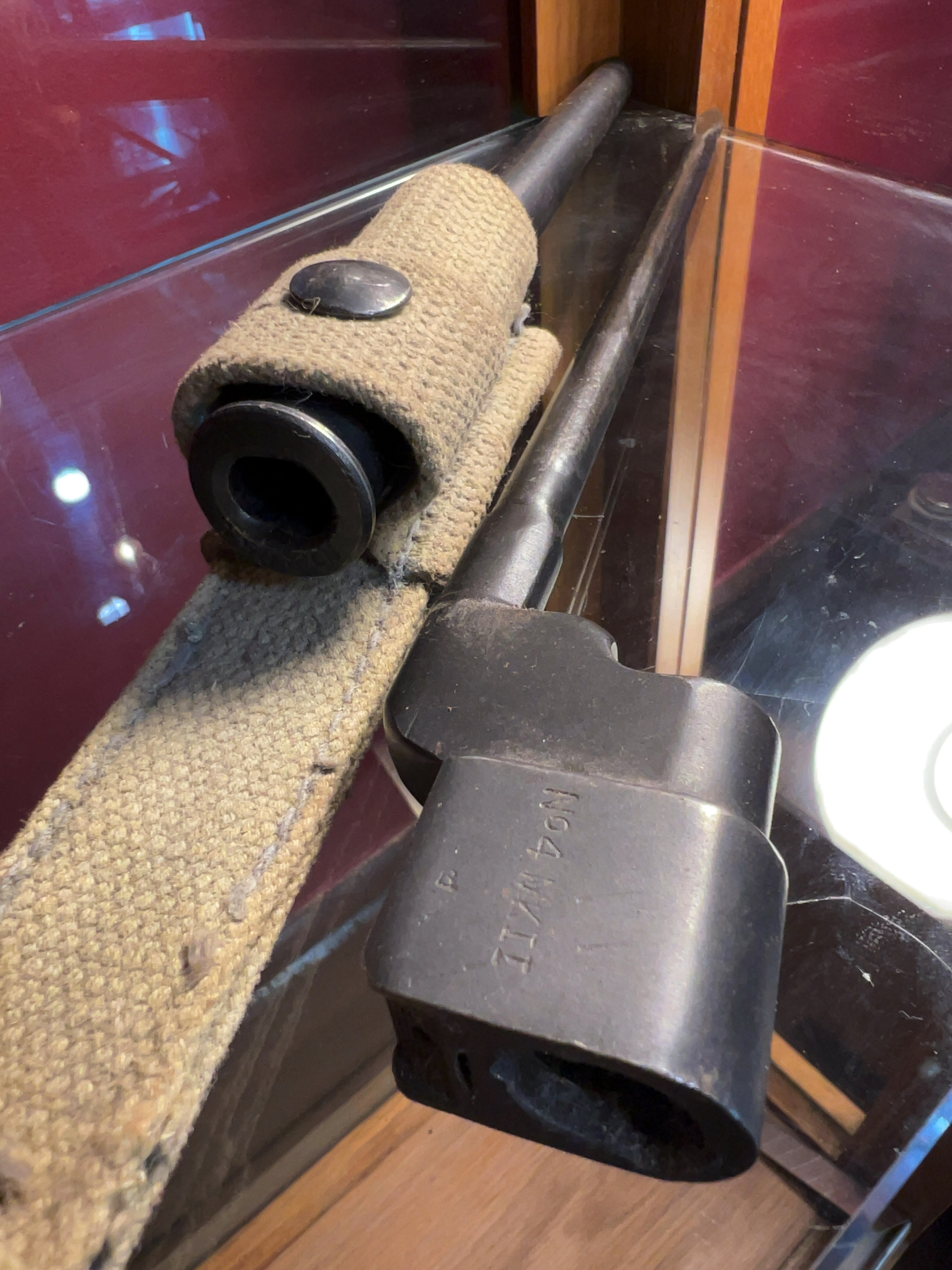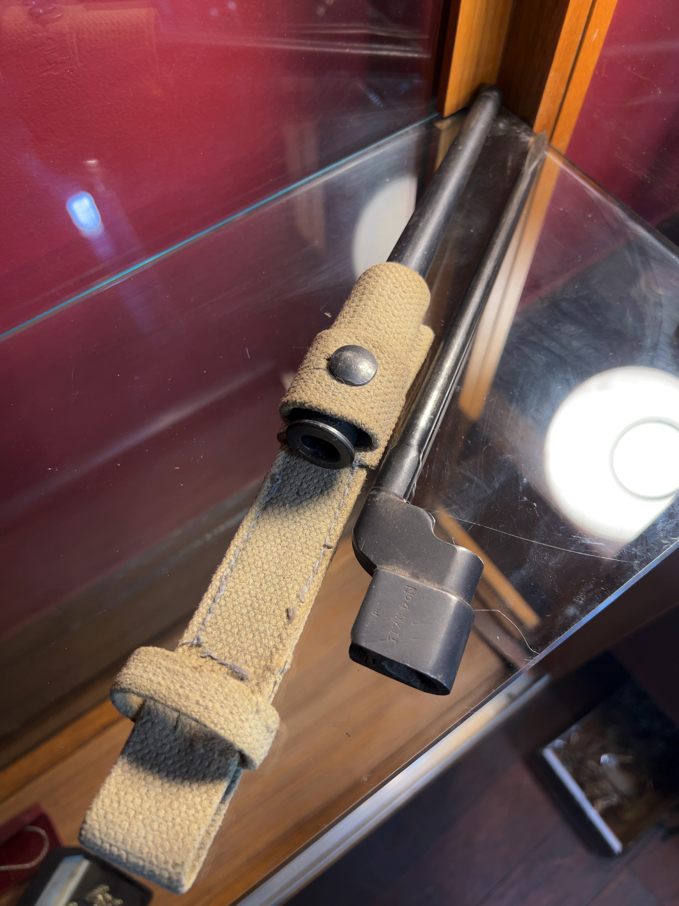 The bayonet retains a substantial amount of its original blackened finish over the silver body. There is evidence of typical age-related wear and minor surface marks on the socket mount. The metal scabbard remains in good condition with the finish largely intact. The khaki webbing frog shows signs of period service use, including light fraying at the edges and minor soiling, but remains structurally sound with a functional press-stud.