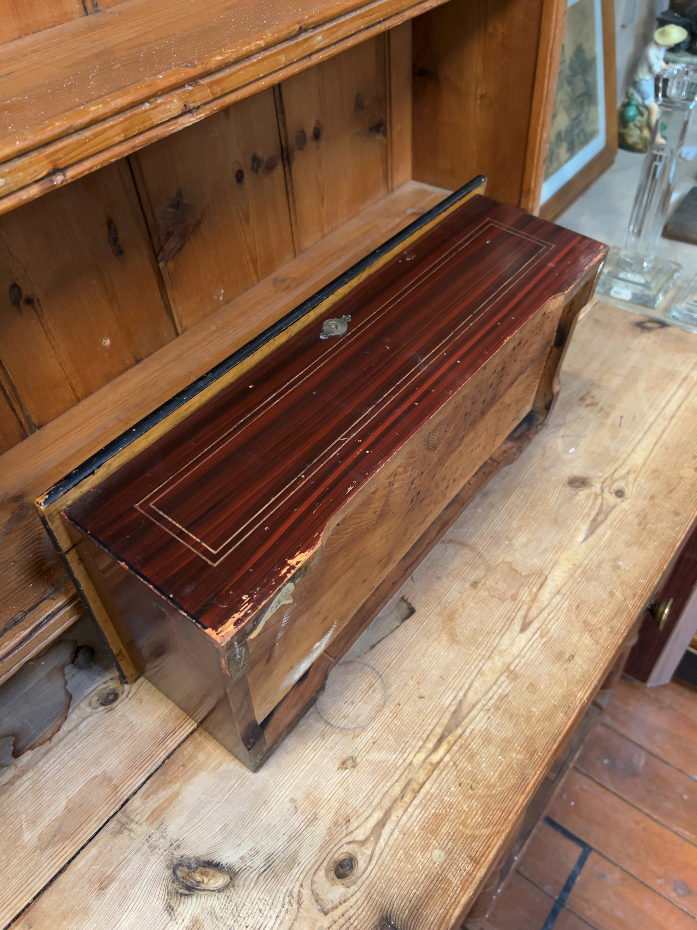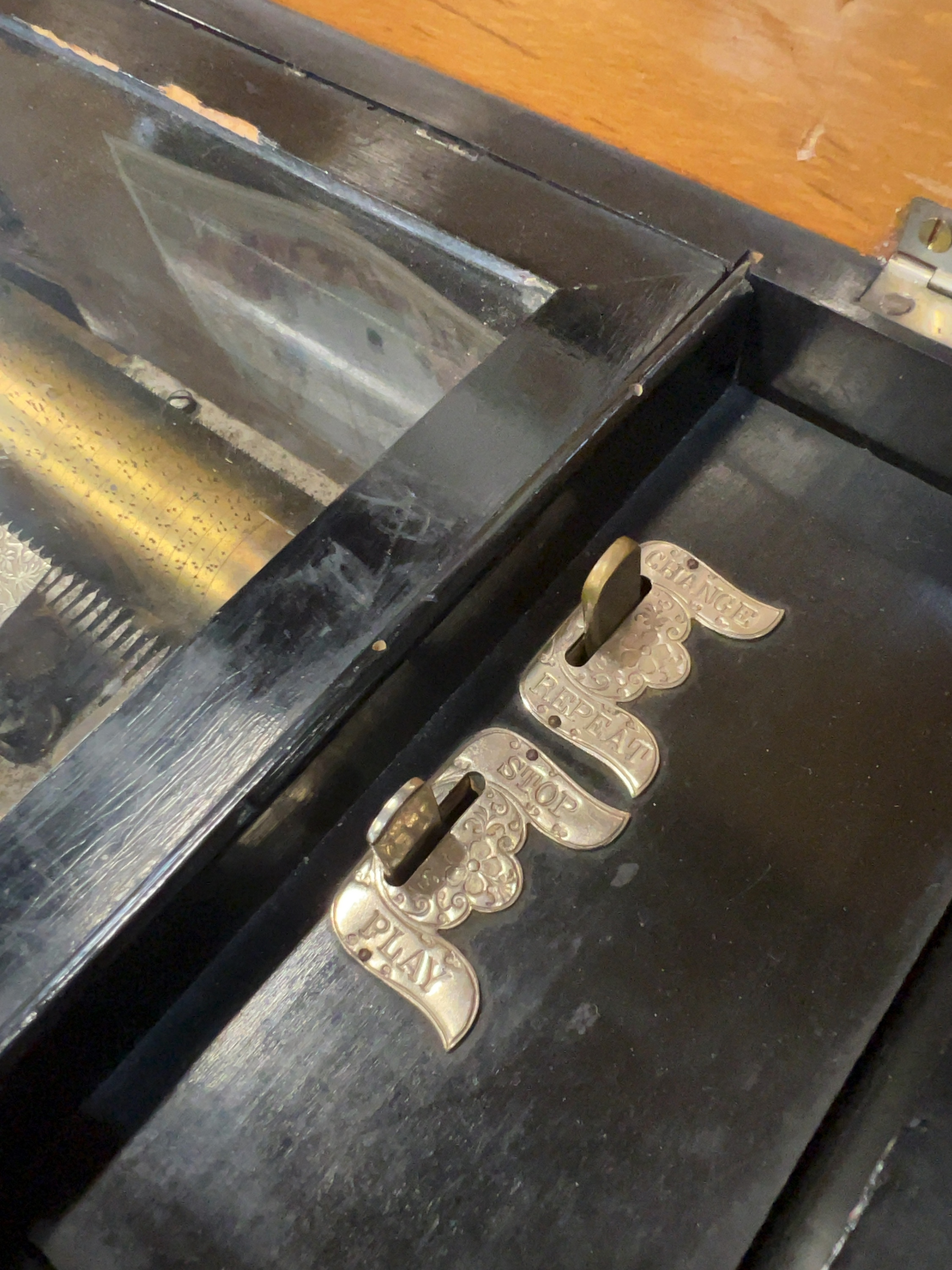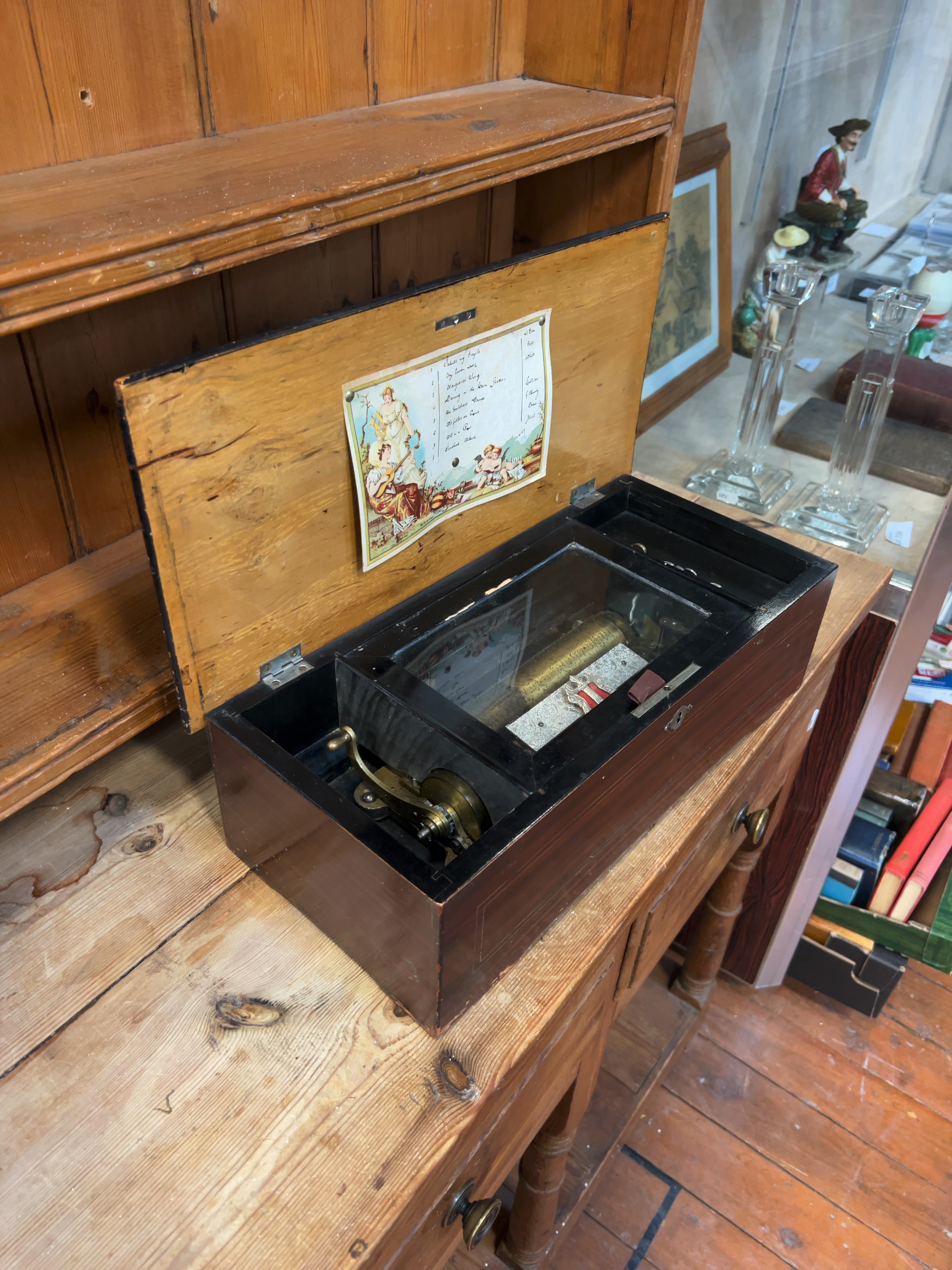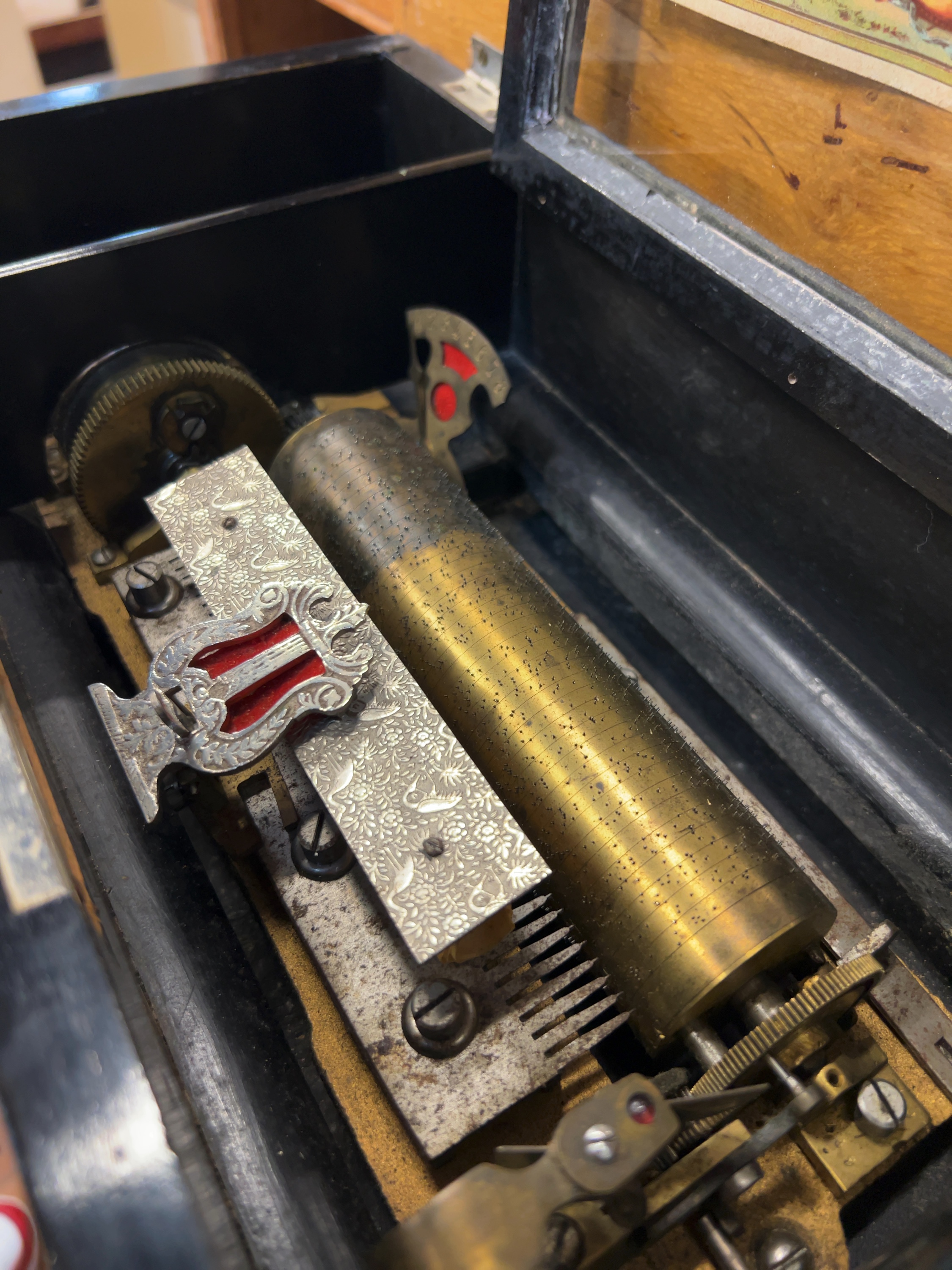The exterior wooden case shows signs of age-related wear, including surface scuffs, scratches, and minor veneer losses, particularly concentrated around the lower edges and corners. The interior glass cover is present. The metal components of the movement exhibit some surface oxidation and tarnish consistent with age. The lithographed tune sheet is intact and legible, though it shows minor staining and pinholes at the corners. The mechanism is reported to be in working condition.
