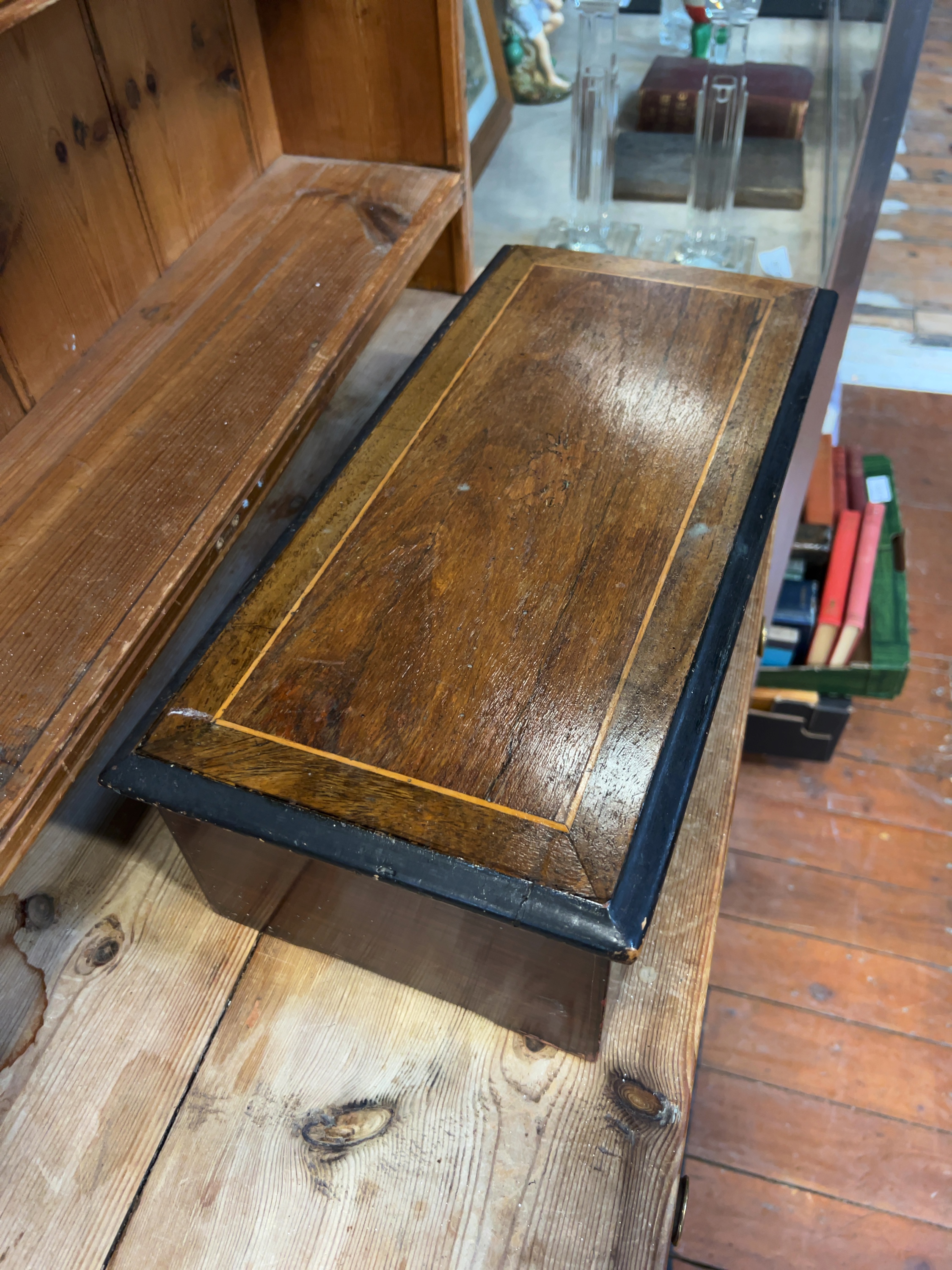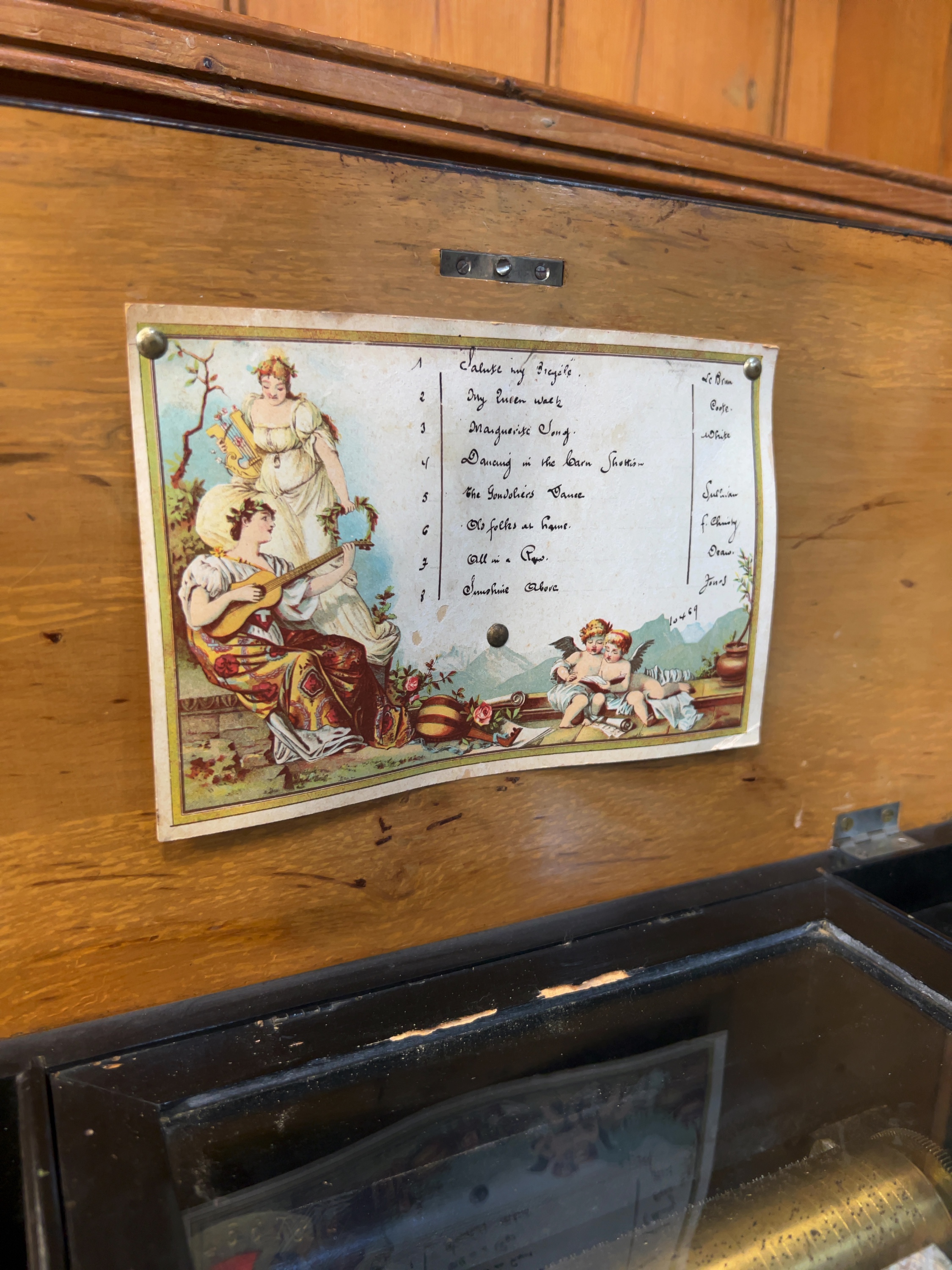 An antique cylinder music box of Swiss origin, dating to the late 19th century. A colourful lithographed tune sheet is affixed to the underside of the lid, listing eight melodies including Salut my Bicycle by Le Brun, The Gondoliers Dance by Sullivan, and Old folks at home by F. Christy. A handwritten serial number 10469 is visible on the tune sheet. This item is in working condition.