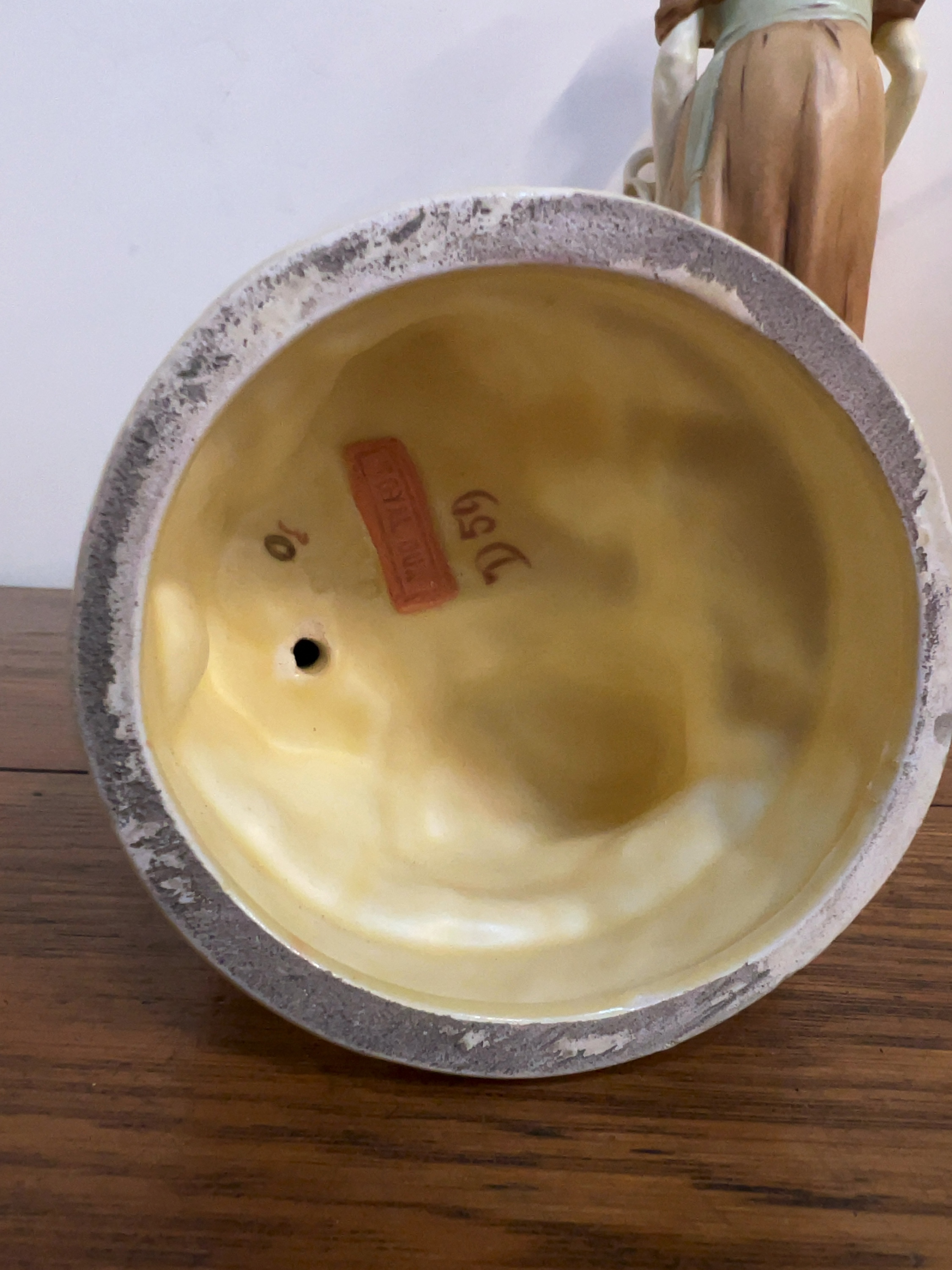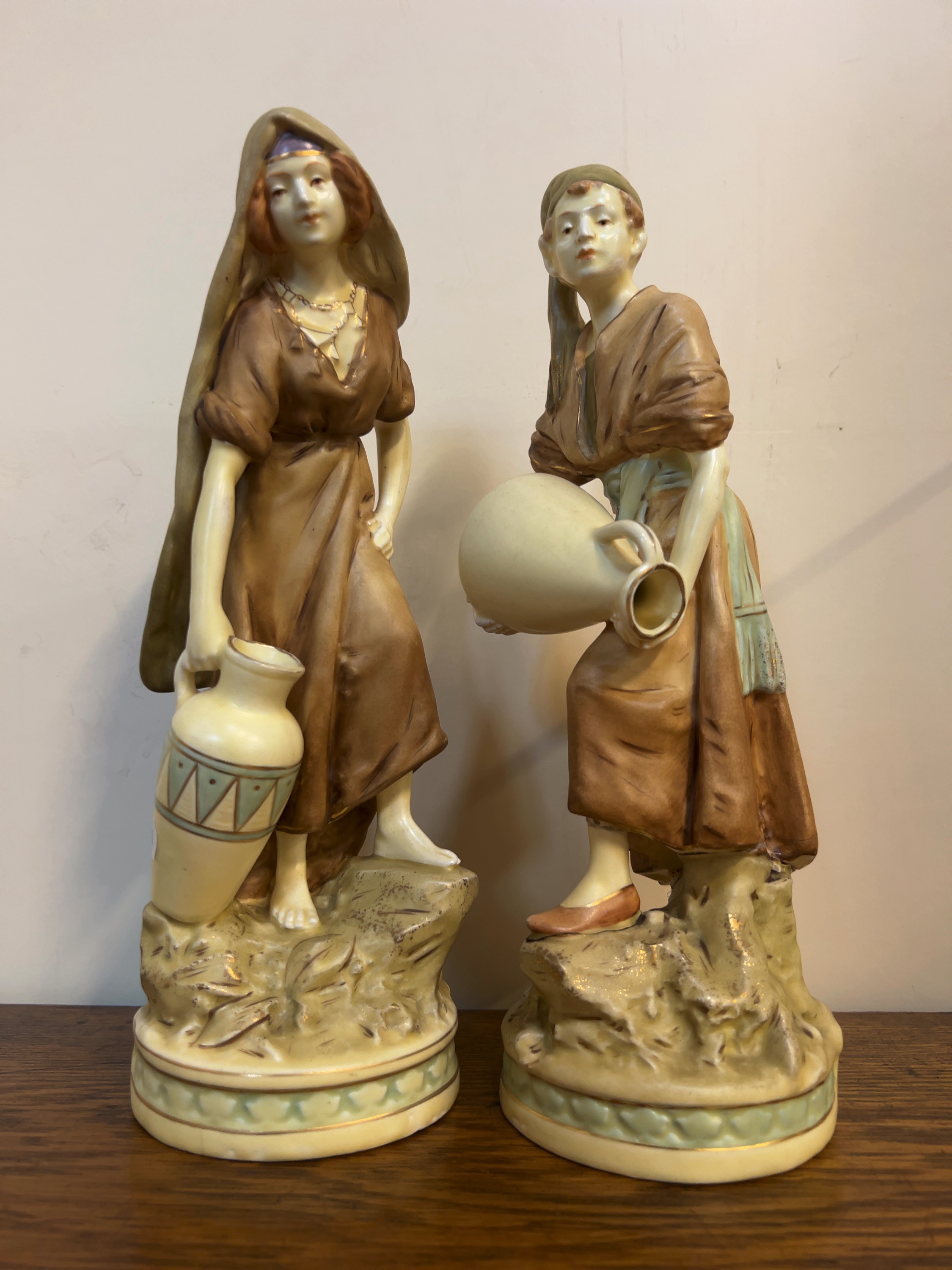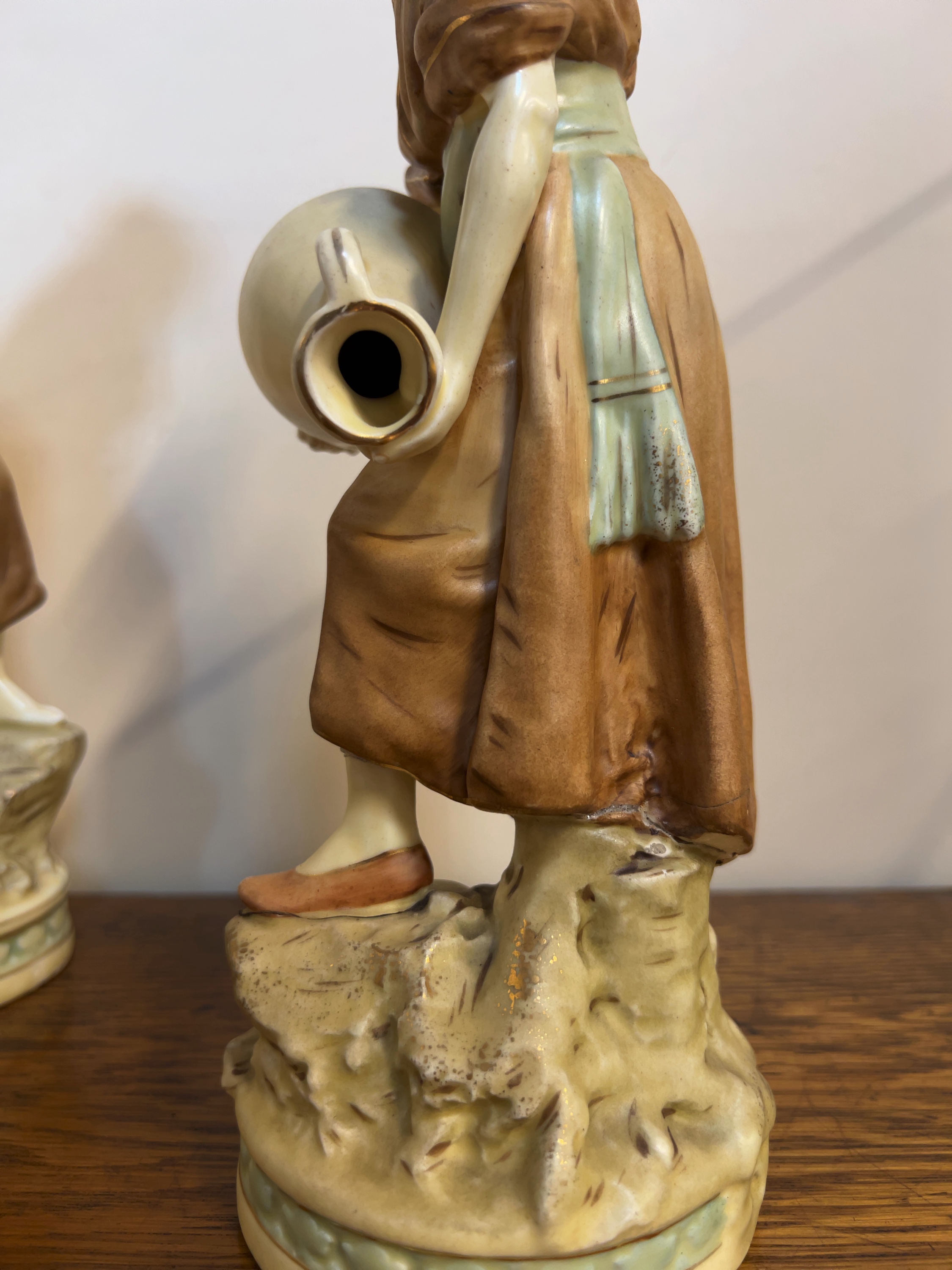 The figures are in fair to good condition. The stooping figure has a significant horizontal crack across the lower portion of the tunic, which appears to be a repaired break. There is minor rubbing and loss to the gilded highlights on the rims of the water jars and around the circular bases. A small white adhesive label remains on the reverse of the standing figure\'s base.
