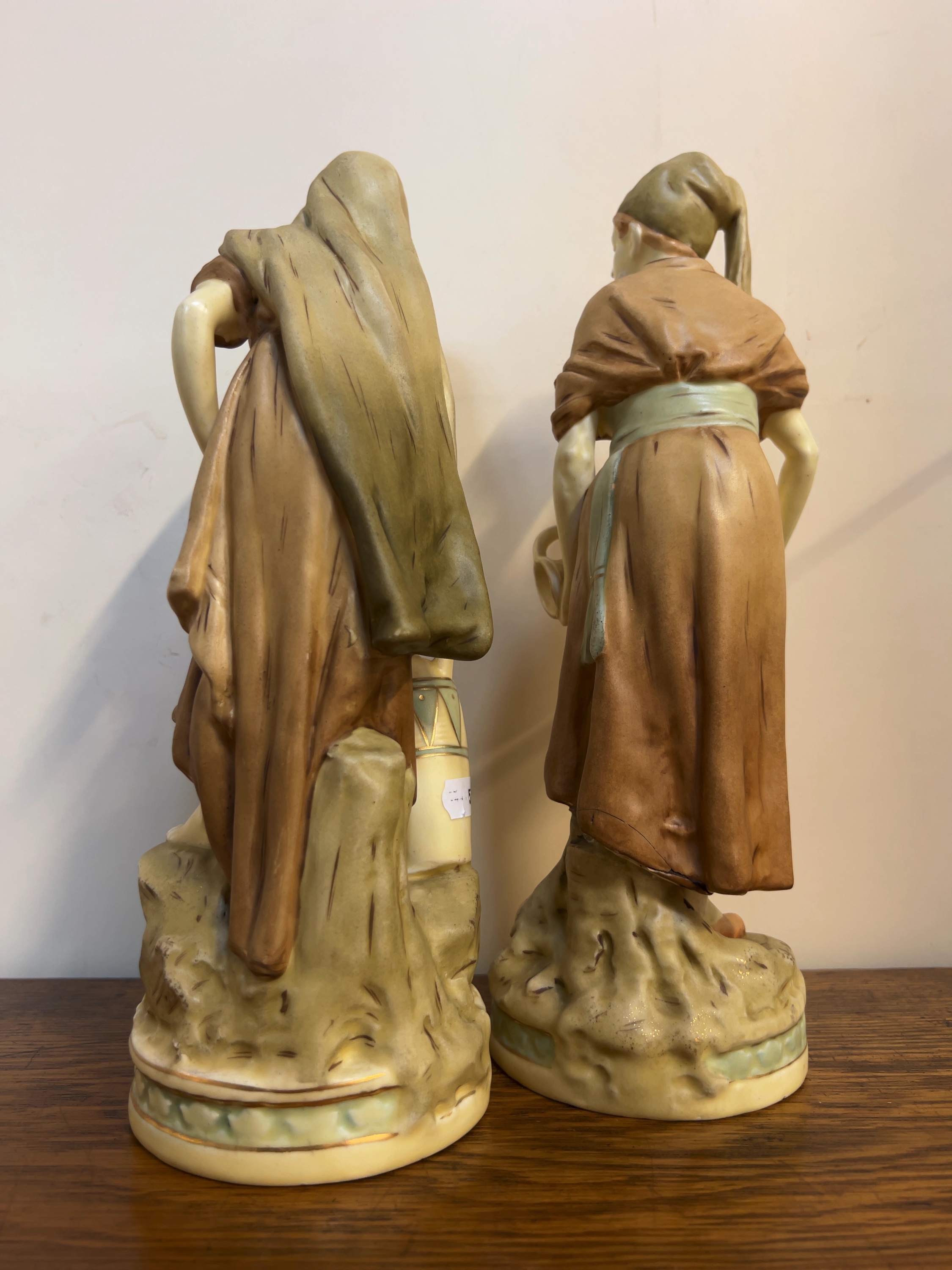 A pair of Royal Dux bisque porcelain figurines depicting Middle Eastern water carriers in traditional rustic attire. The base of one figure features the applied pink clay triangle mark impressed with Royal Dux Bohemia. Hand-painted marks including D 59 and 0/ are also present on the underside.