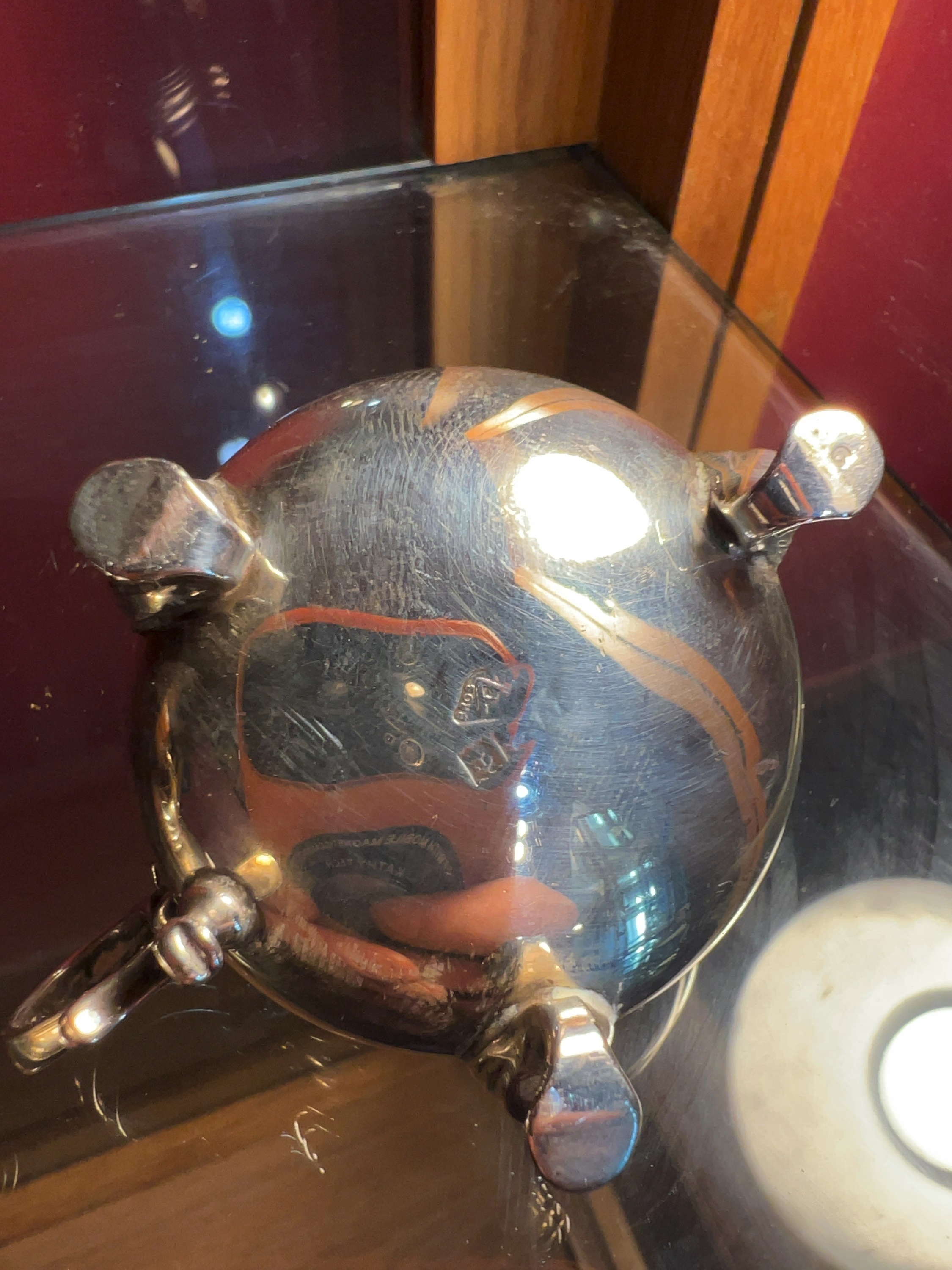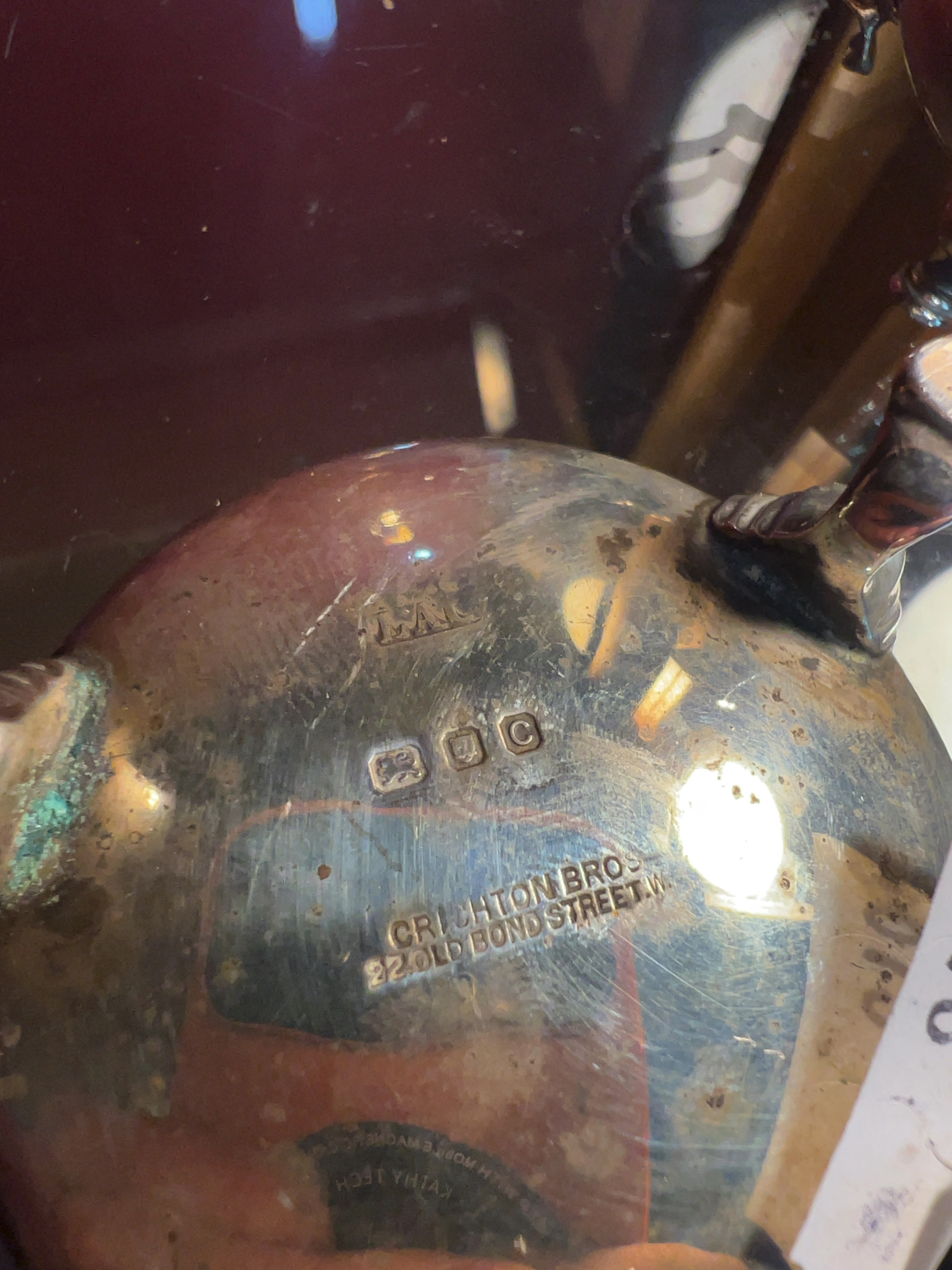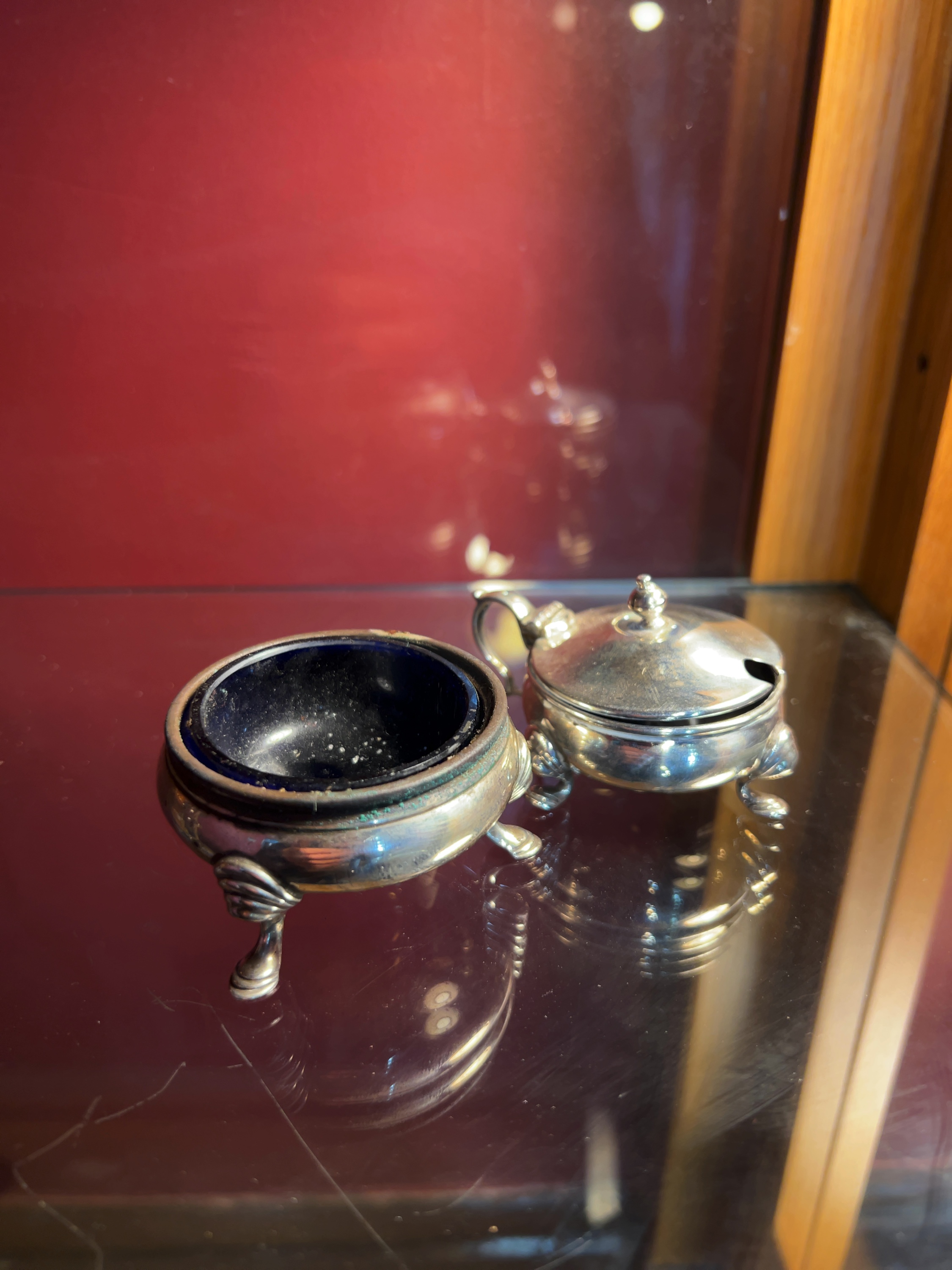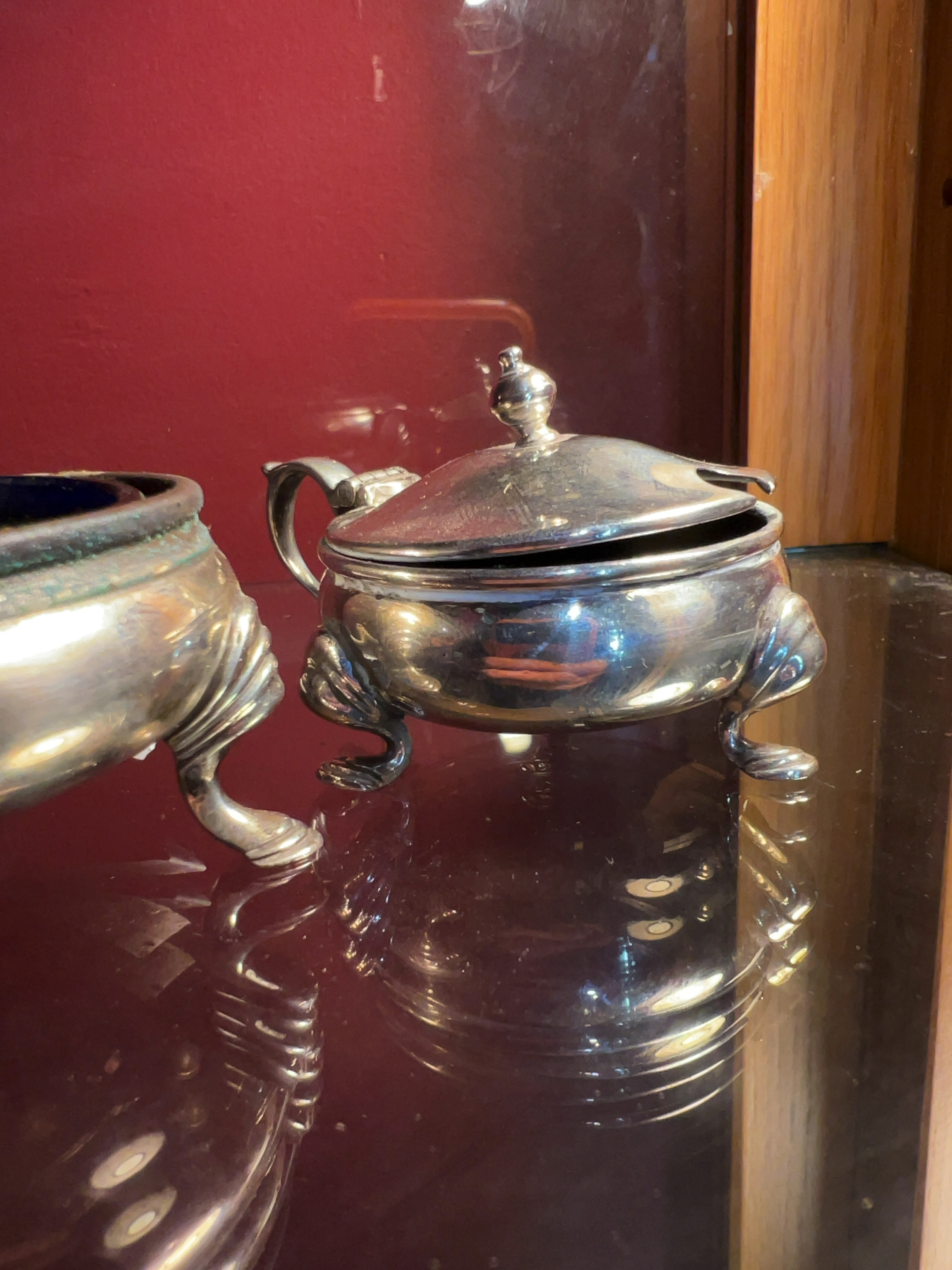 A George V sterling silver condiment set manufactured by Lionel Alfred Crichton and retailed by Crichton Bros, comprising an open salt cellar and a mustard pot. Both pieces are designed in the early Georgian revival style with squat, bulbous bodies raised on three hoof-style feet. The mustard pot features a scroll handle and a hinged lid topped with a ball finial. The salt cellar contains a removable cobalt blue glass liner. The undersides of both items bear the following struck hallmarks: the maker mark LAC for Lionel Alfred Crichton, the lion passant indicating .925 sterling silver, the leopard head for the London Assay Office, and the lowercase date letter c for the year 1918. The pieces are also stamped with the retailer mark CRICHTON BROS 22 OLD BOND STREET. W.