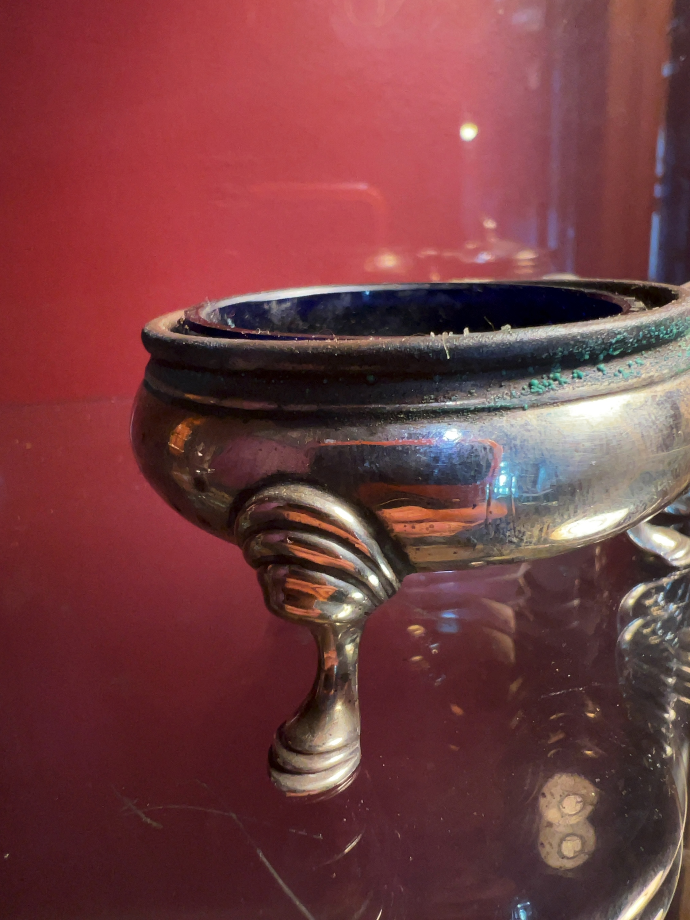 The silver surfaces show moderate tarnish throughout. There is visible green verdigris oxidation around the interior rims of both pots. The cobalt blue glass liner is in good condition without visible chips or cracks. The mustard pot is missing its accompanying spoon.