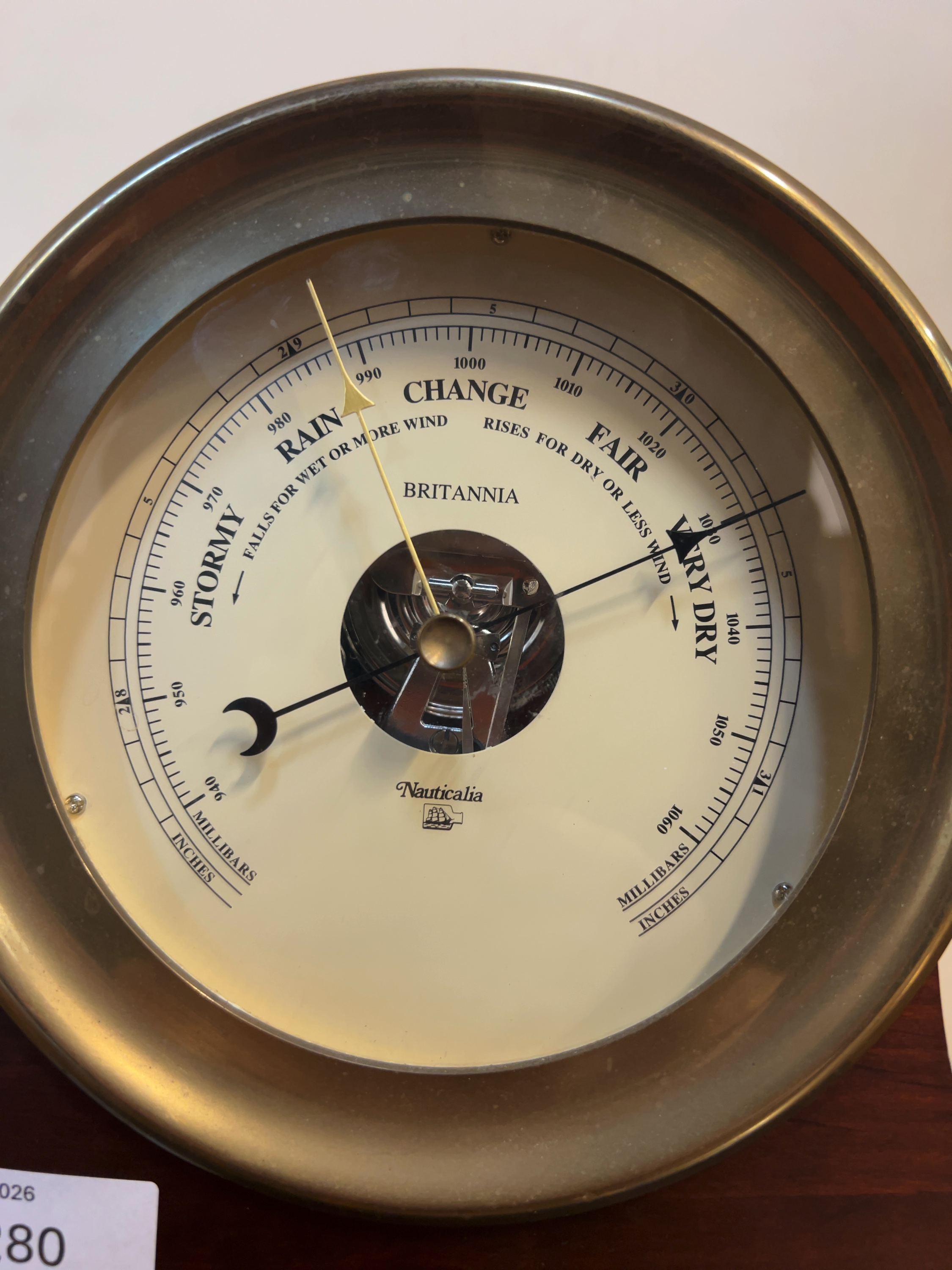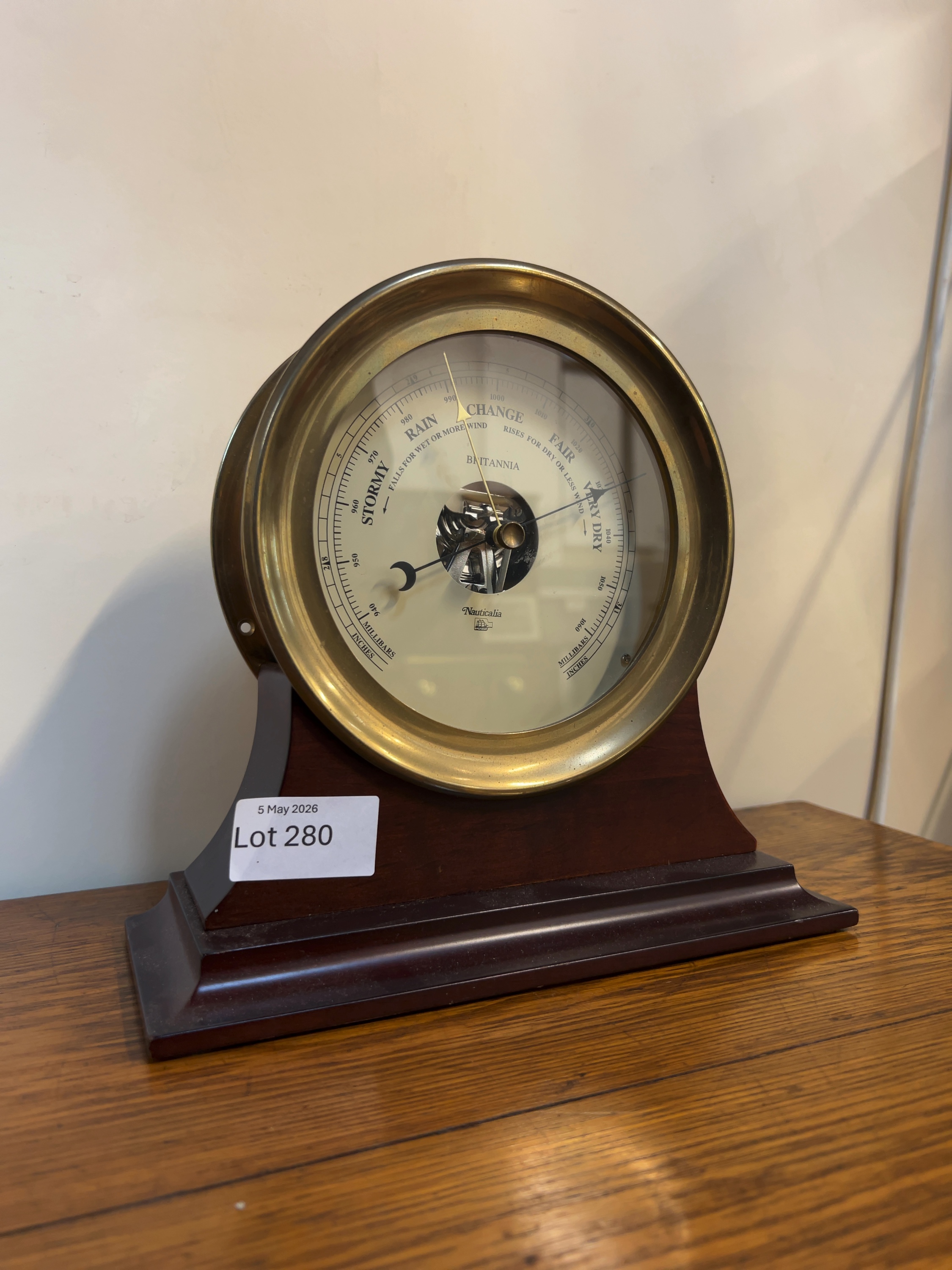 This desk-top aneroid barometer is produced by the UK retailer Nauticalia, belonging to the Britannia range.