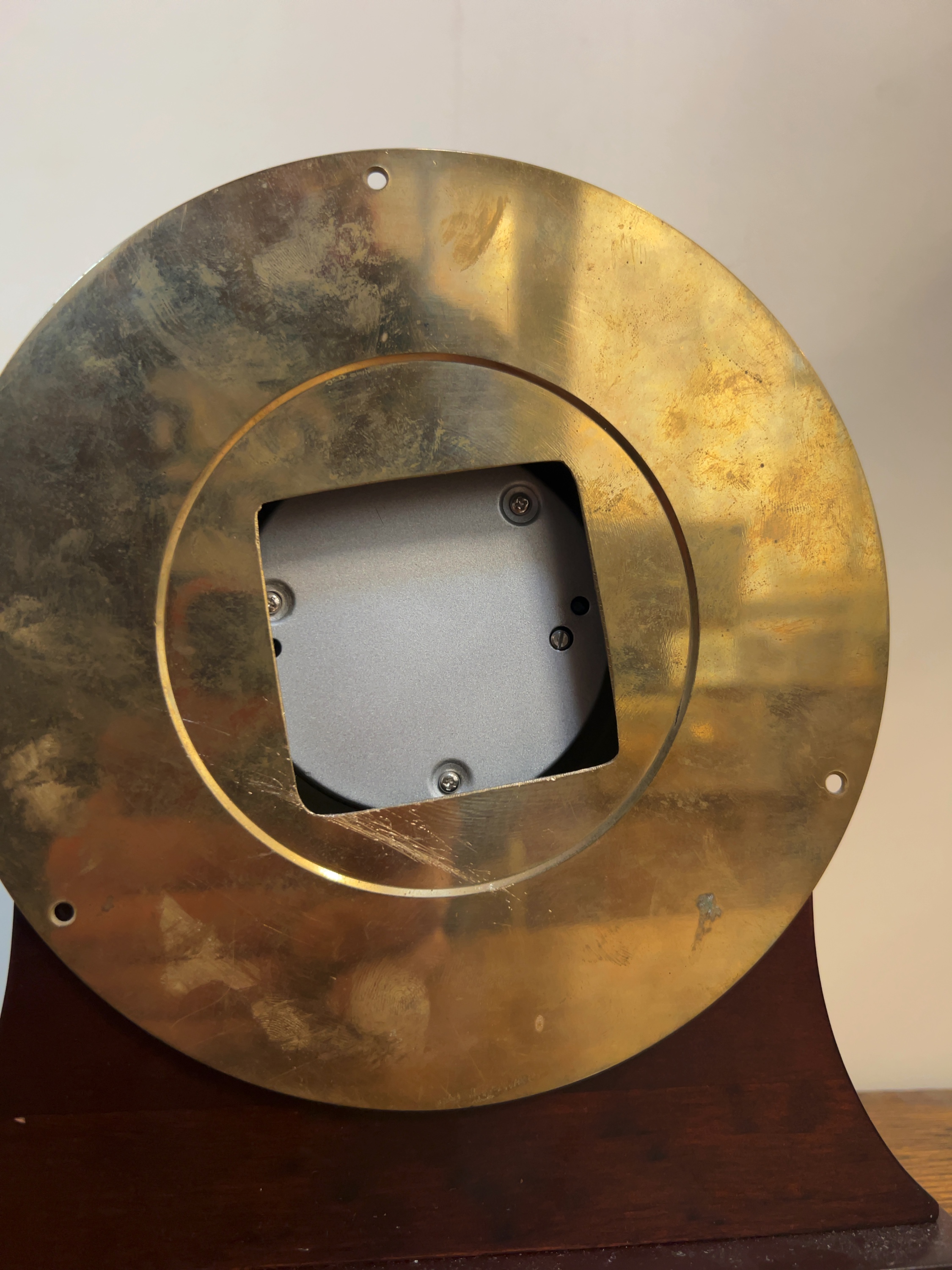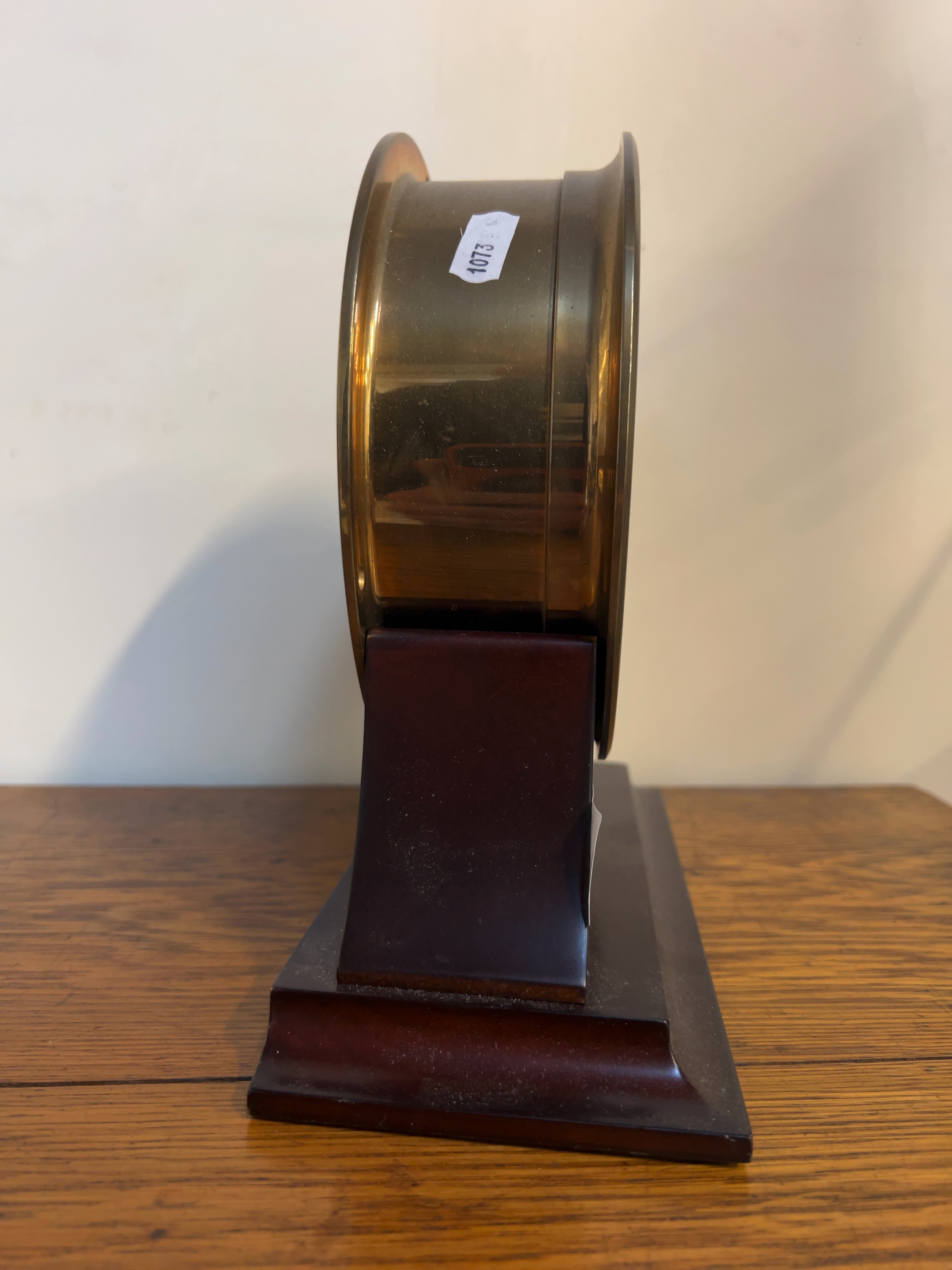 The brass case shows some light surface tarnish and minor scratches consistent with age and use. The wooden base exhibits light dust and some minor scuffs to the finish. The mechanical movement is untested and its accuracy is not guaranteed.