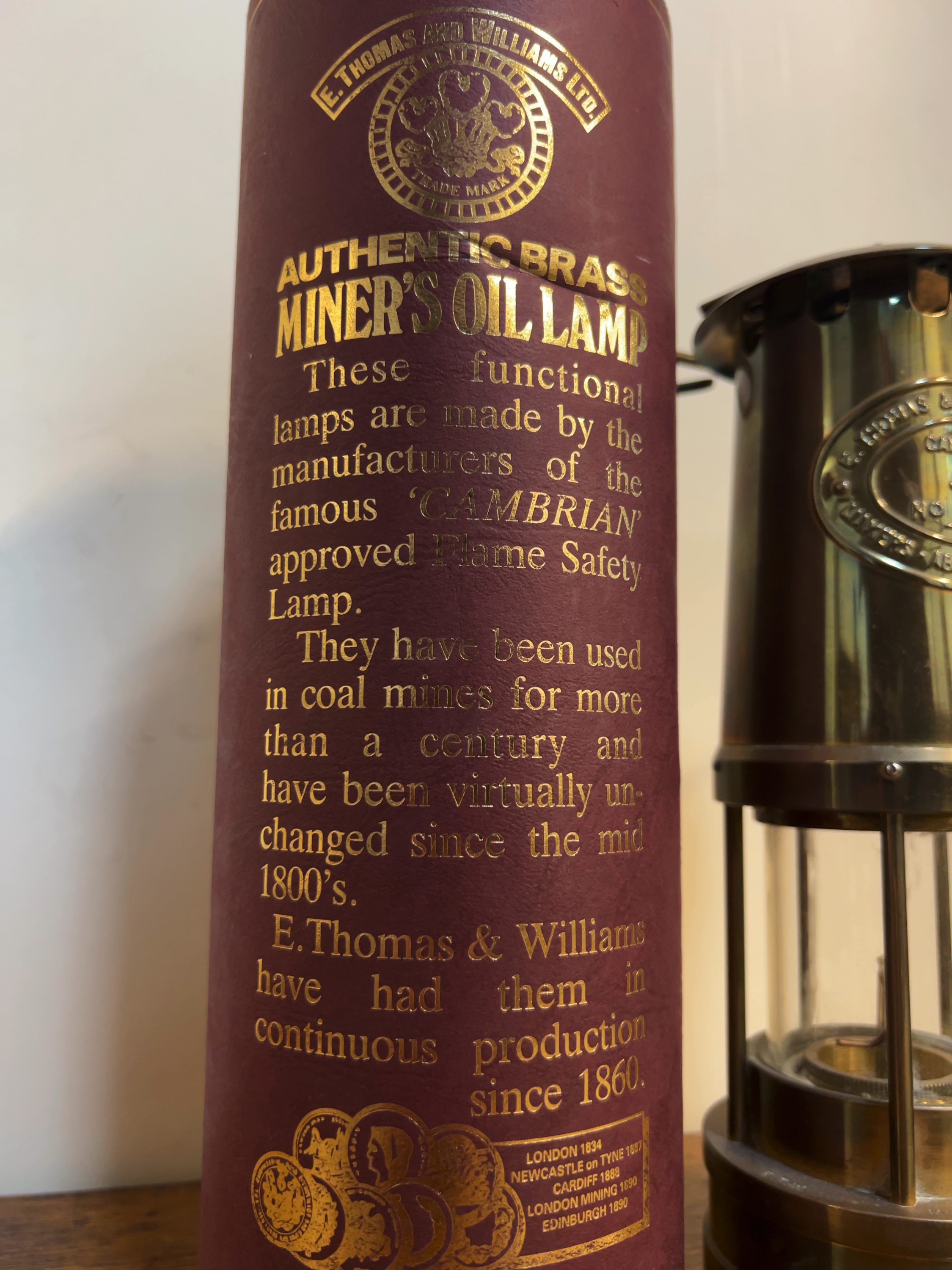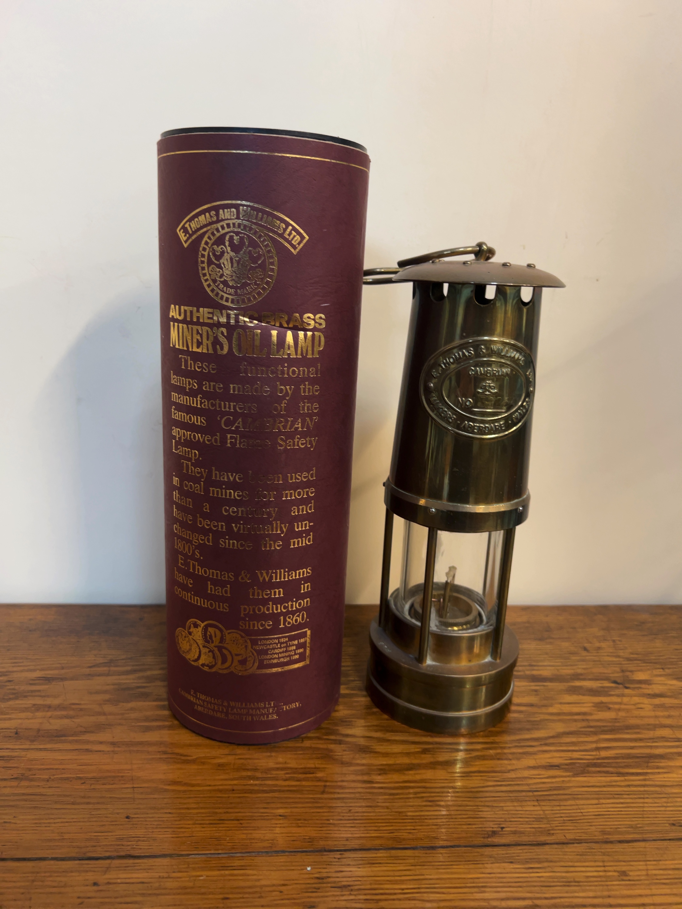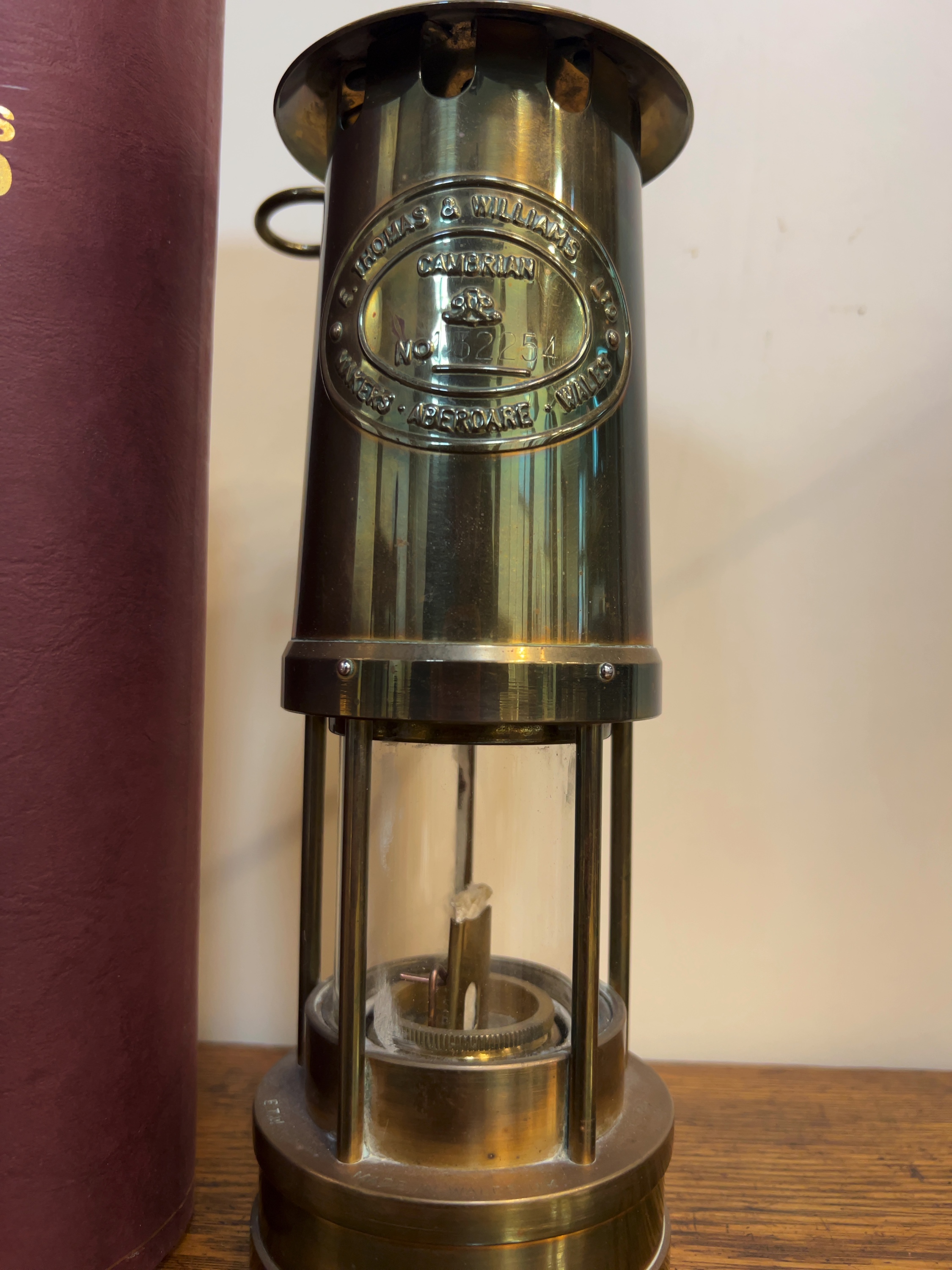 An E. Thomas and Williams Ltd. Cambrian type flame safety lamp manufactured in Aberdare, Wales with oval brass identification plaque is riveted to the upper chimney, embossed with the following text: E. THOMAS & WILLIAMS LTD., CAMBRIAN, a central crown motif above serial number NO. 152254, and MAKERS · ABERDARE · WALES. The lamp is accompanied by its original burgundy-coloured cardboard presentation tube with gold-tone printed lettering.