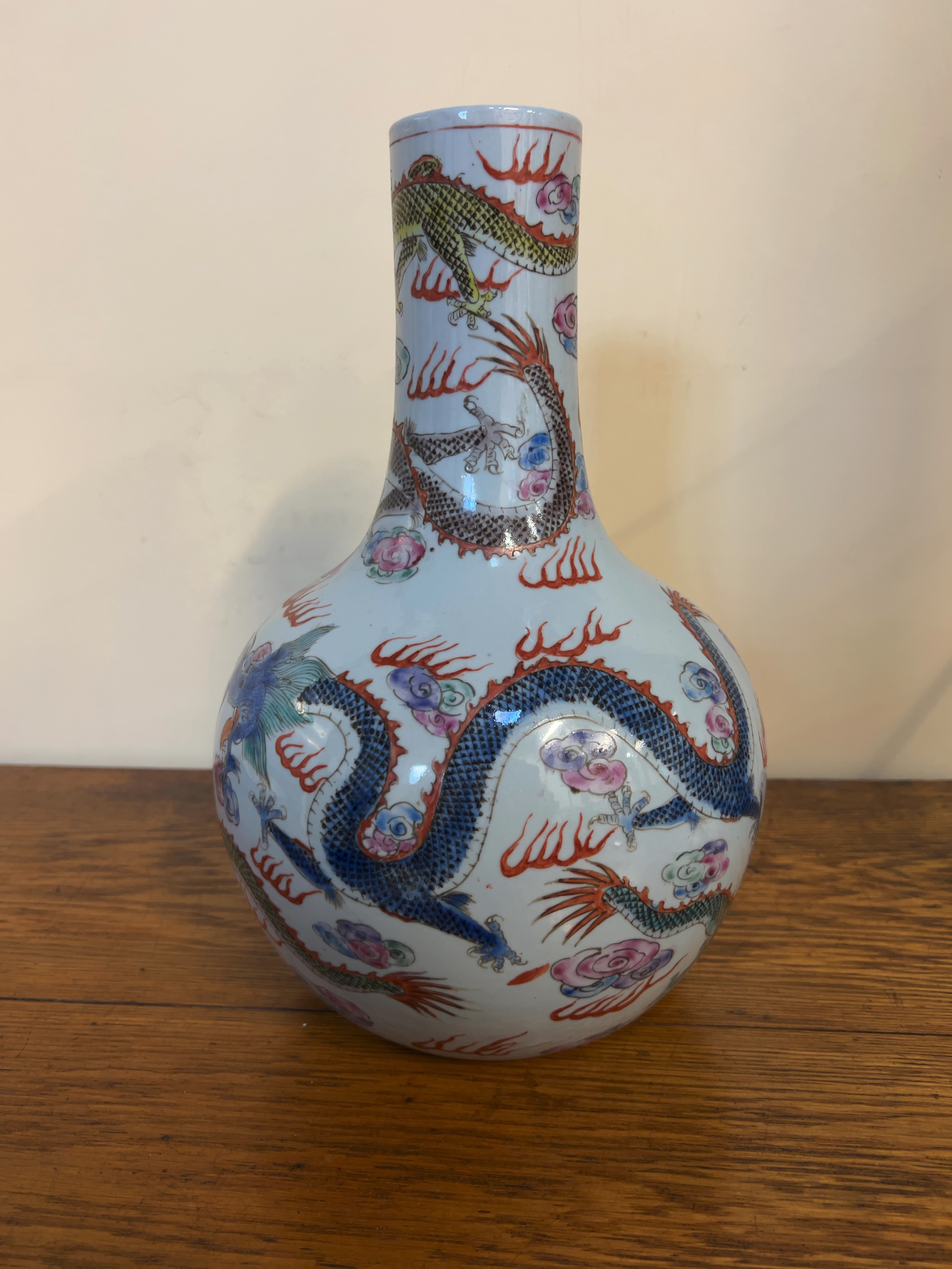 A Chinese porcelain bottle-form vase with a globular body and a tall cylindrical neck. The base features a six-character mark in iron-red overglaze arranged in vertical columns: 大清乾隆年製 (Da Qing Qianlong Nian Zhi), which translates to Great Qing, Qianlong Period, Made. The style of the enamelling and the execution of the mark indicate this is an apocryphal mark, likely dating the piece to the 20th century.