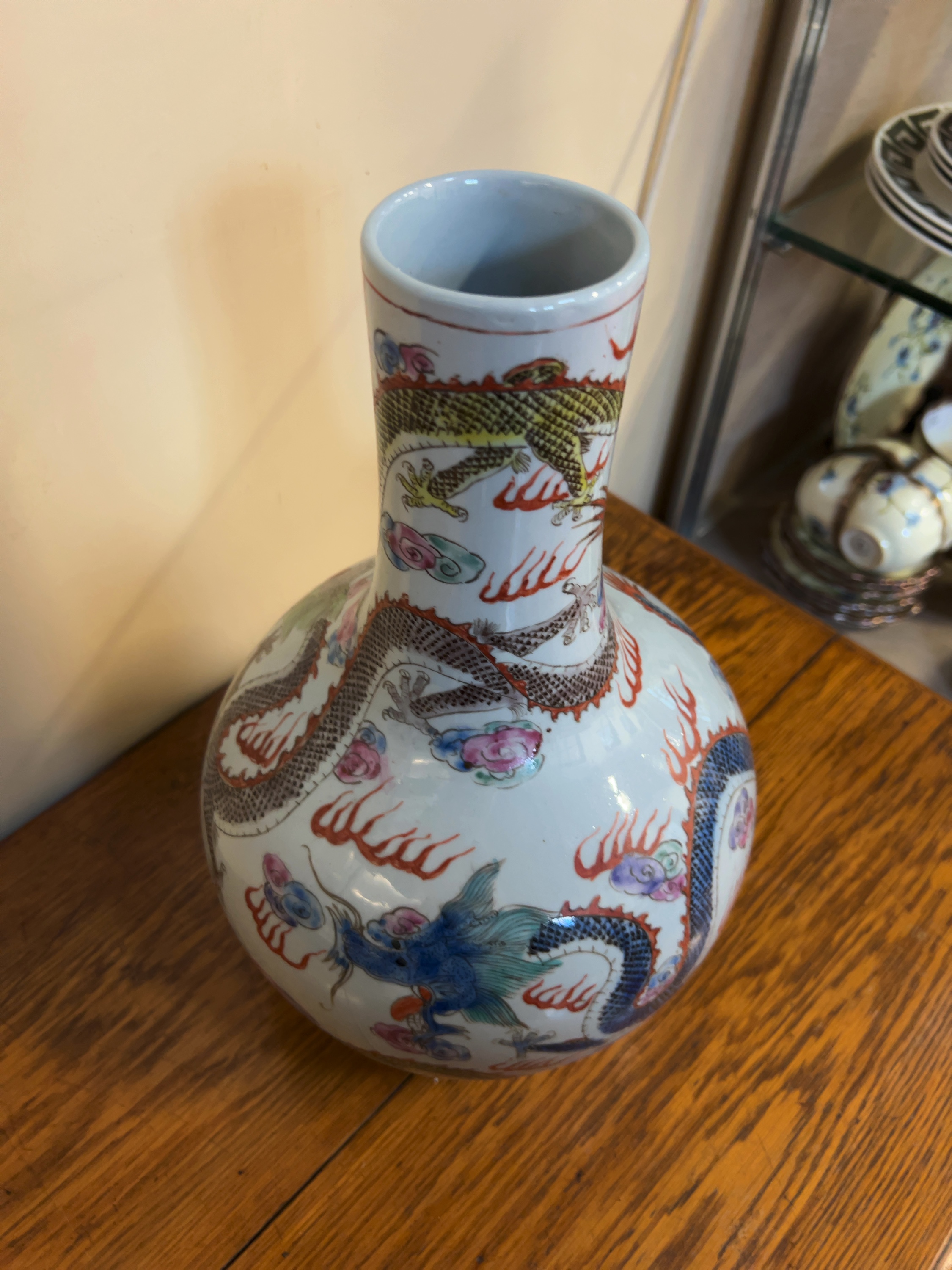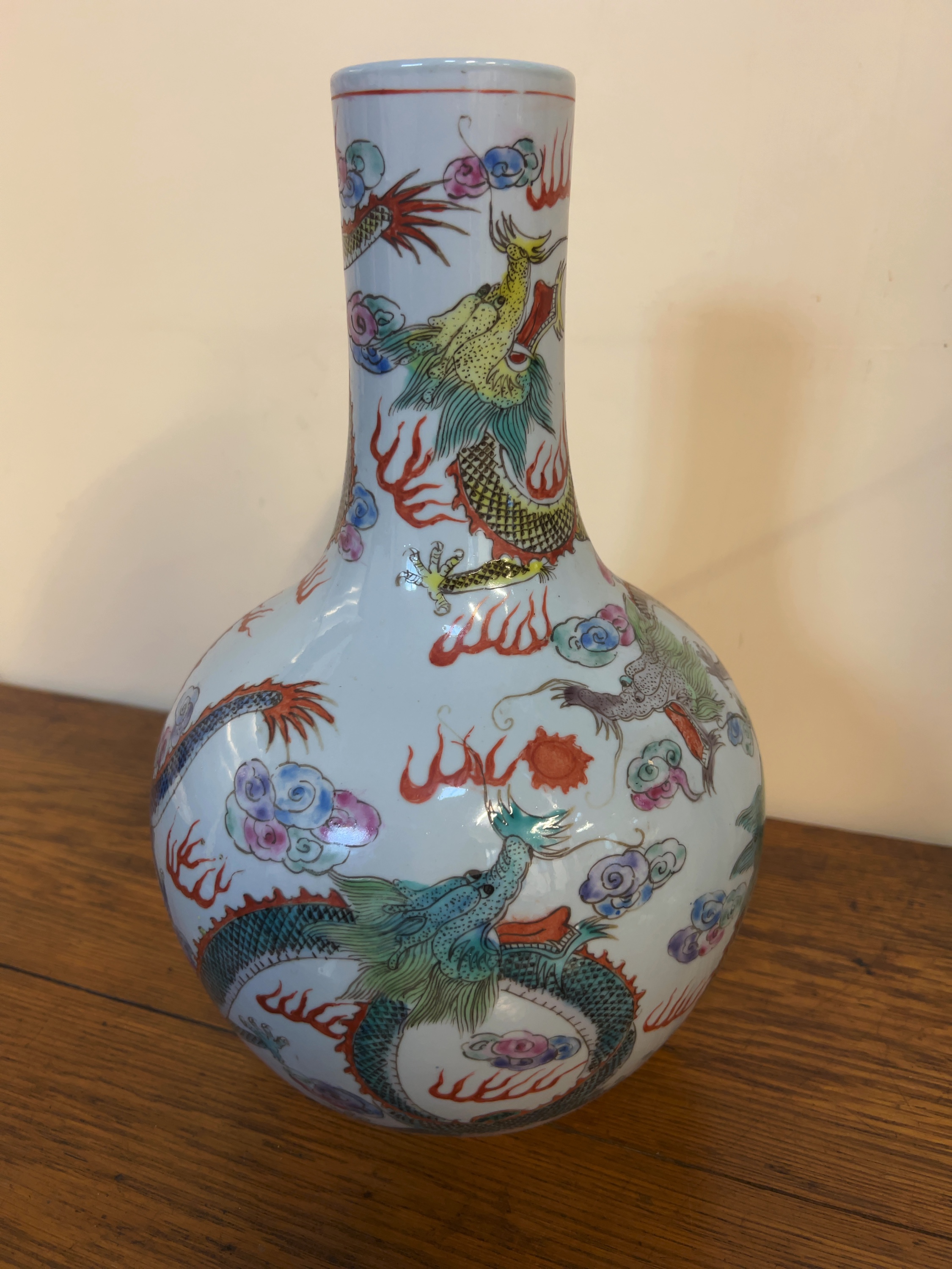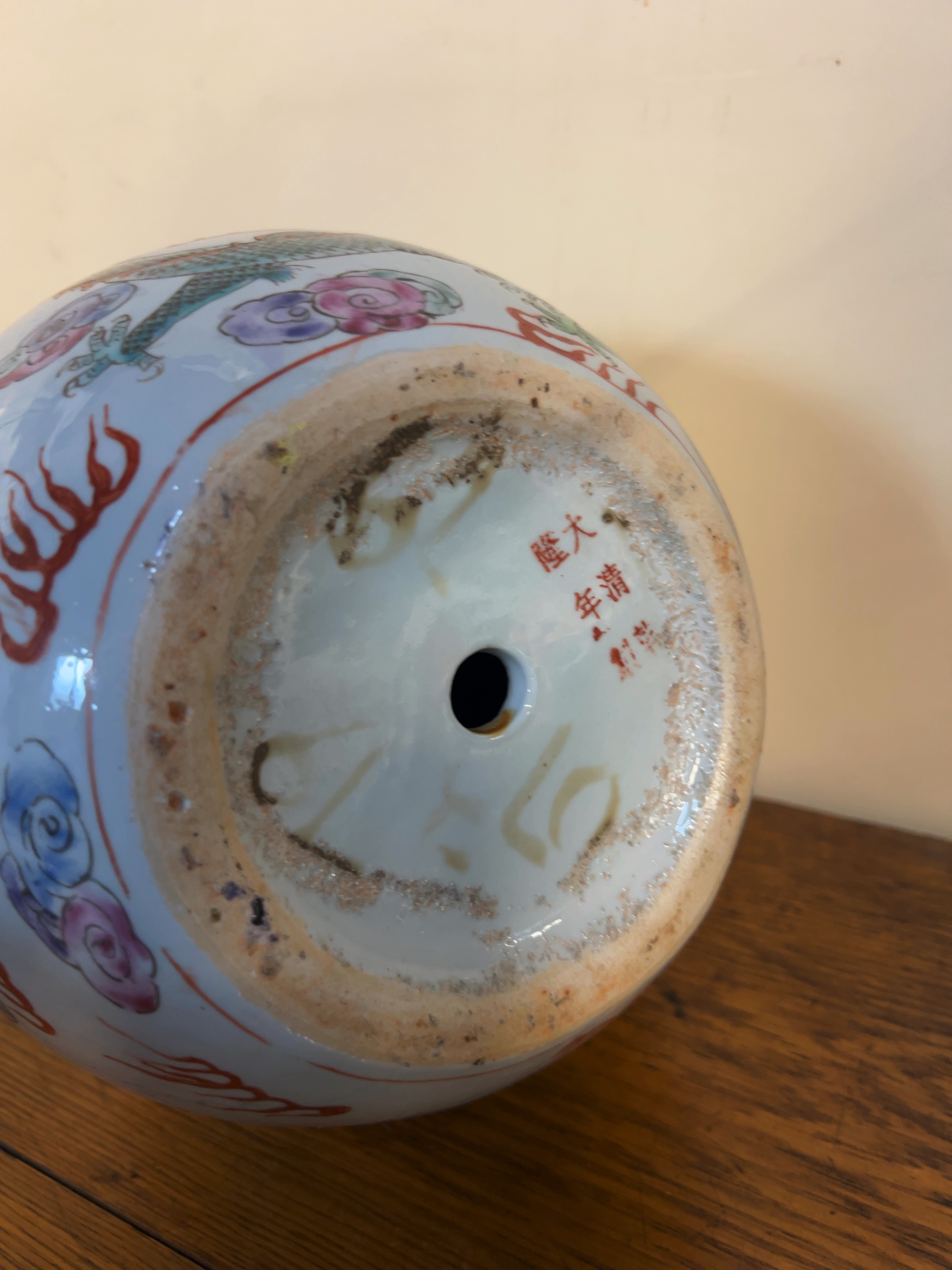 The vase has a hole drilled through the centre of the base, indicating it was previously converted for use as a lamp base. There is accumulated grime and surface wear to the unglazed foot rim. The overglaze enamel decoration is largely intact with minor surface wear consistent with age and use. No visible chips, cracks, or restorations are apparent.