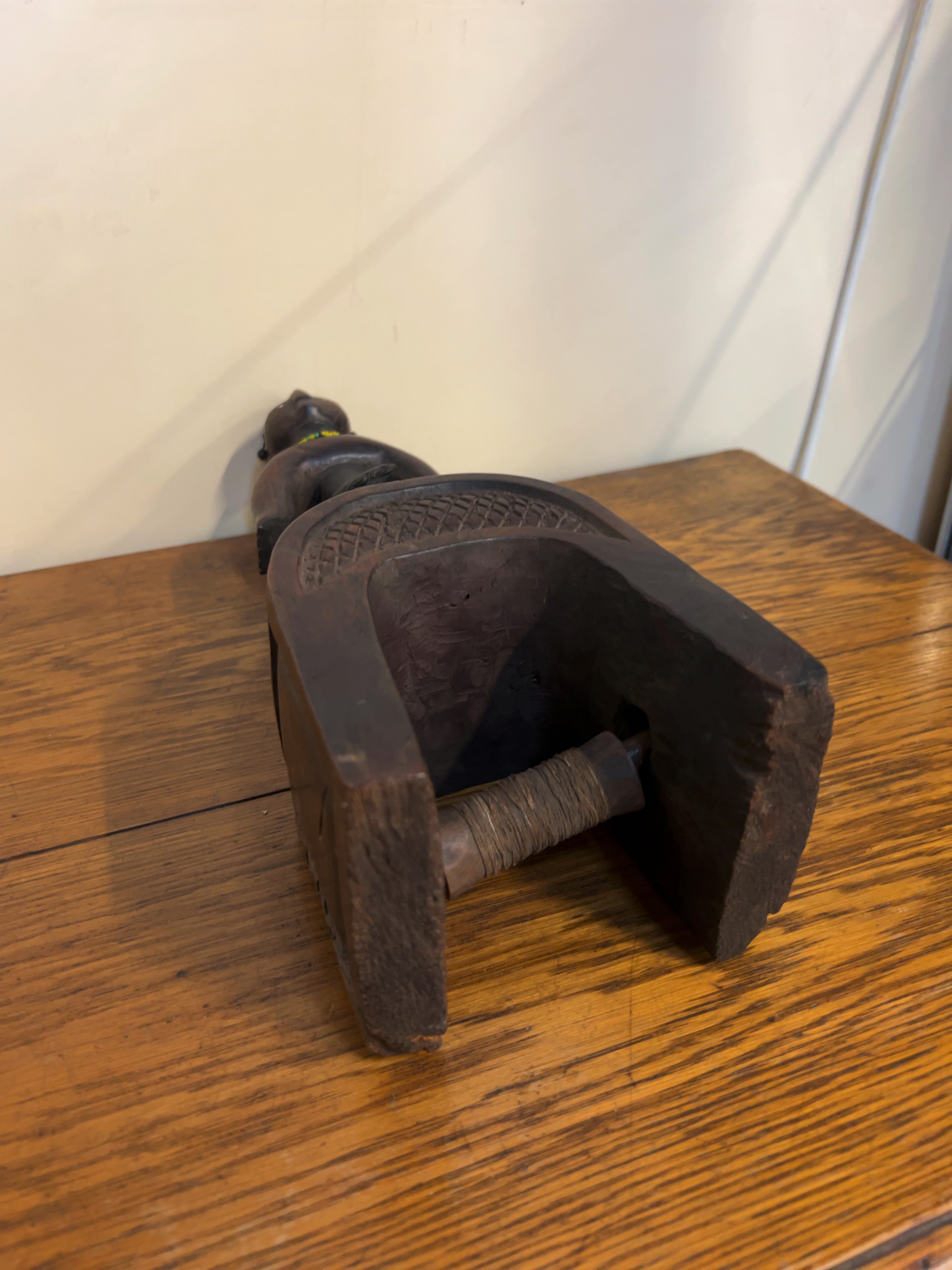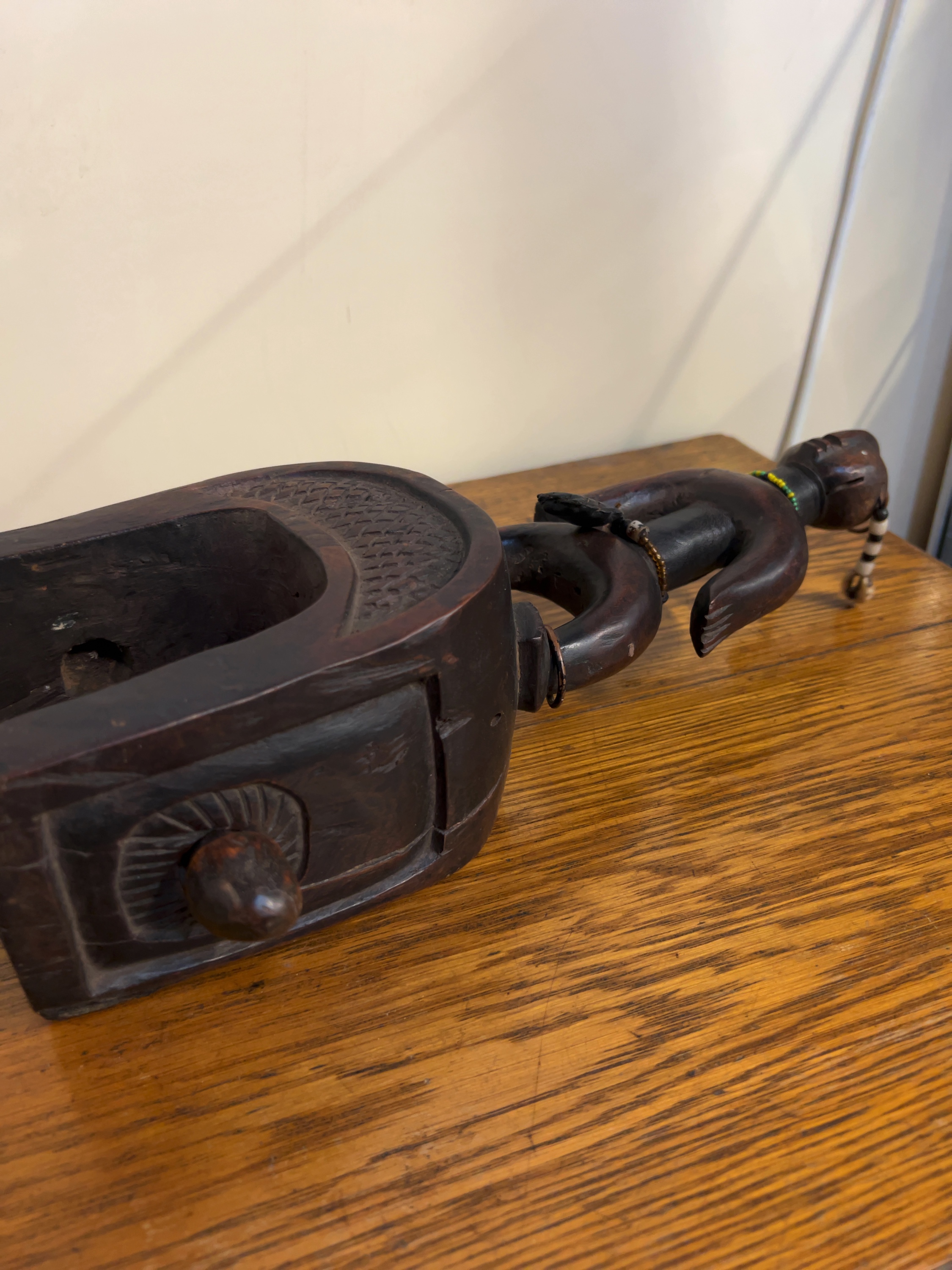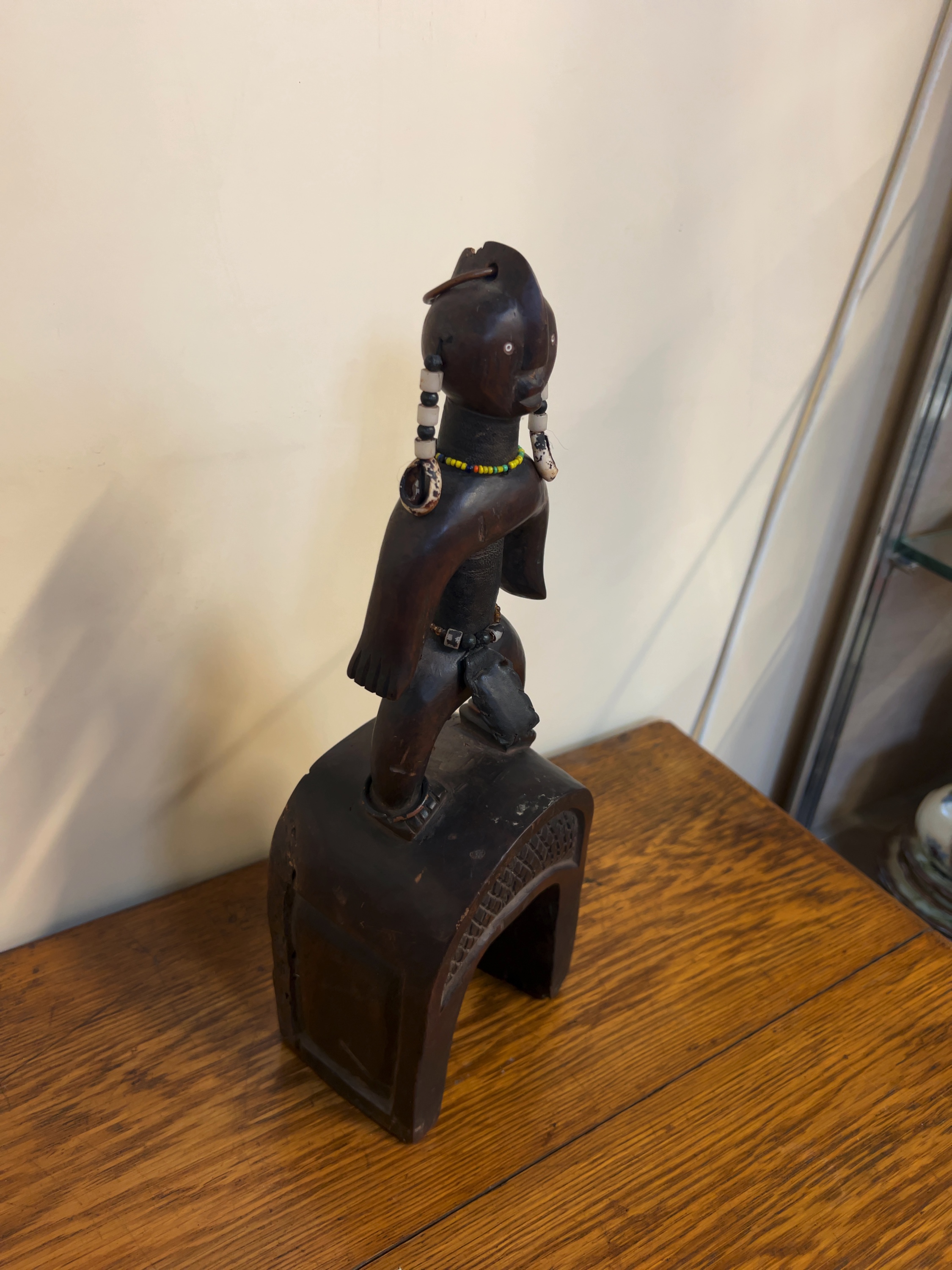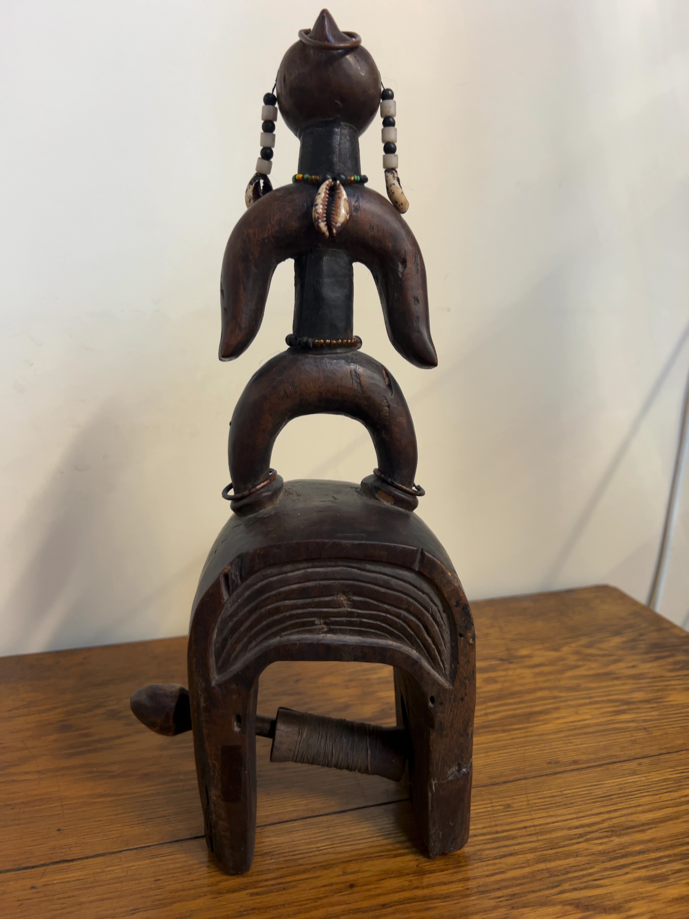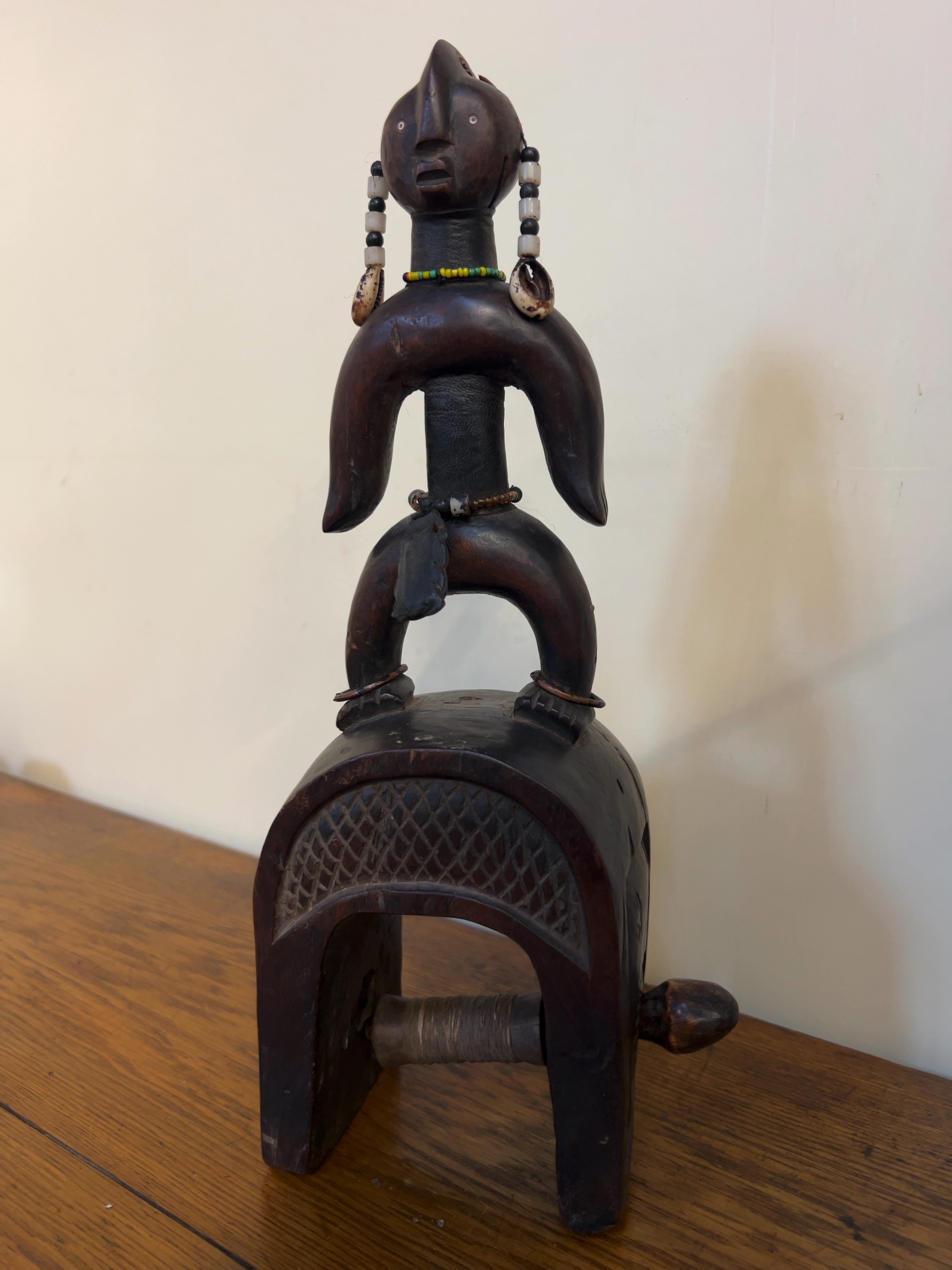 The item possesses a deep, dark brown patina. It shows signs of use-wear consistent with its functional history, including minor abrasions to the base and a softening of the carved edges. The glass beads and cowrie shells remain largely intact and well-affixed.
