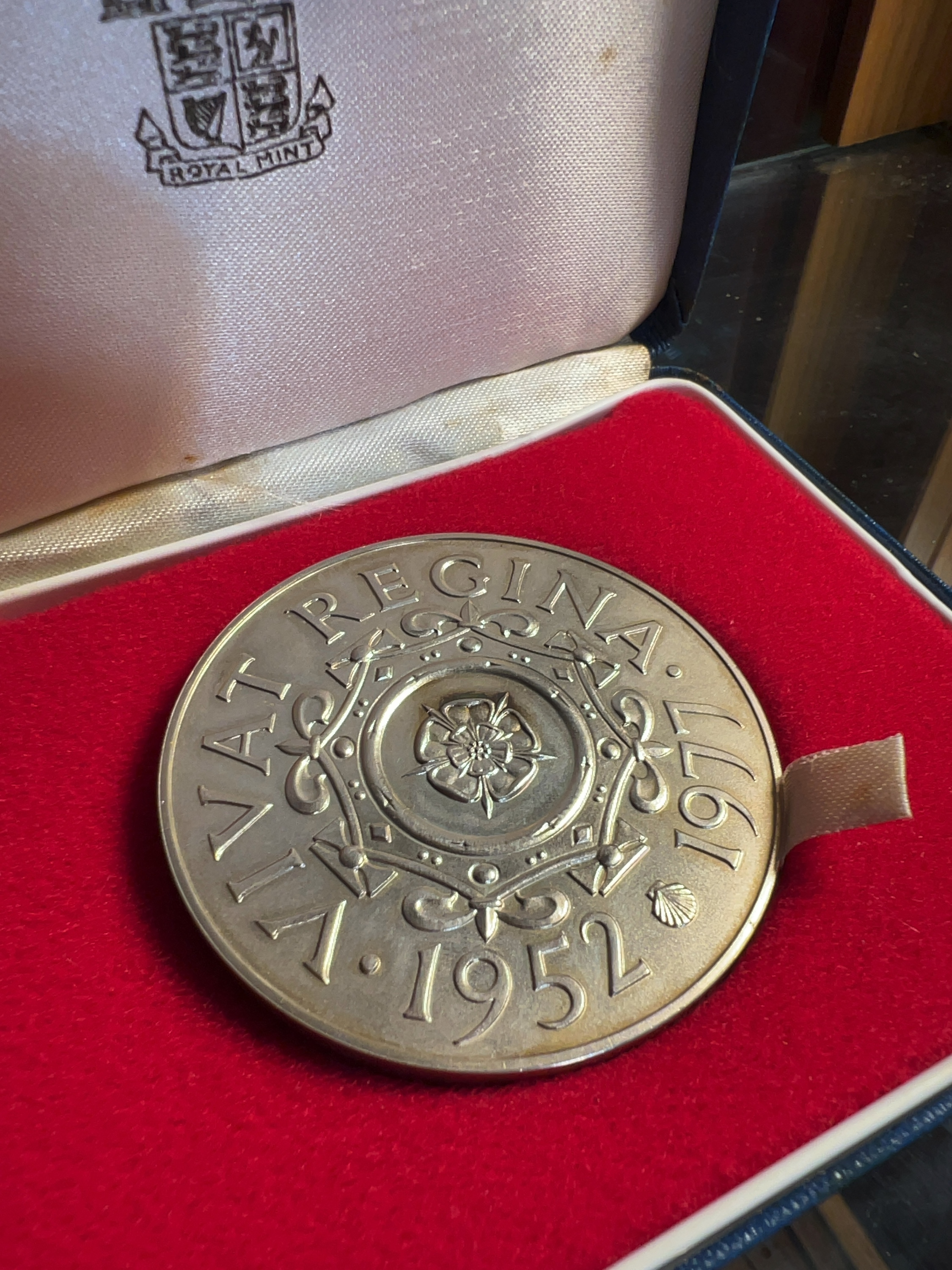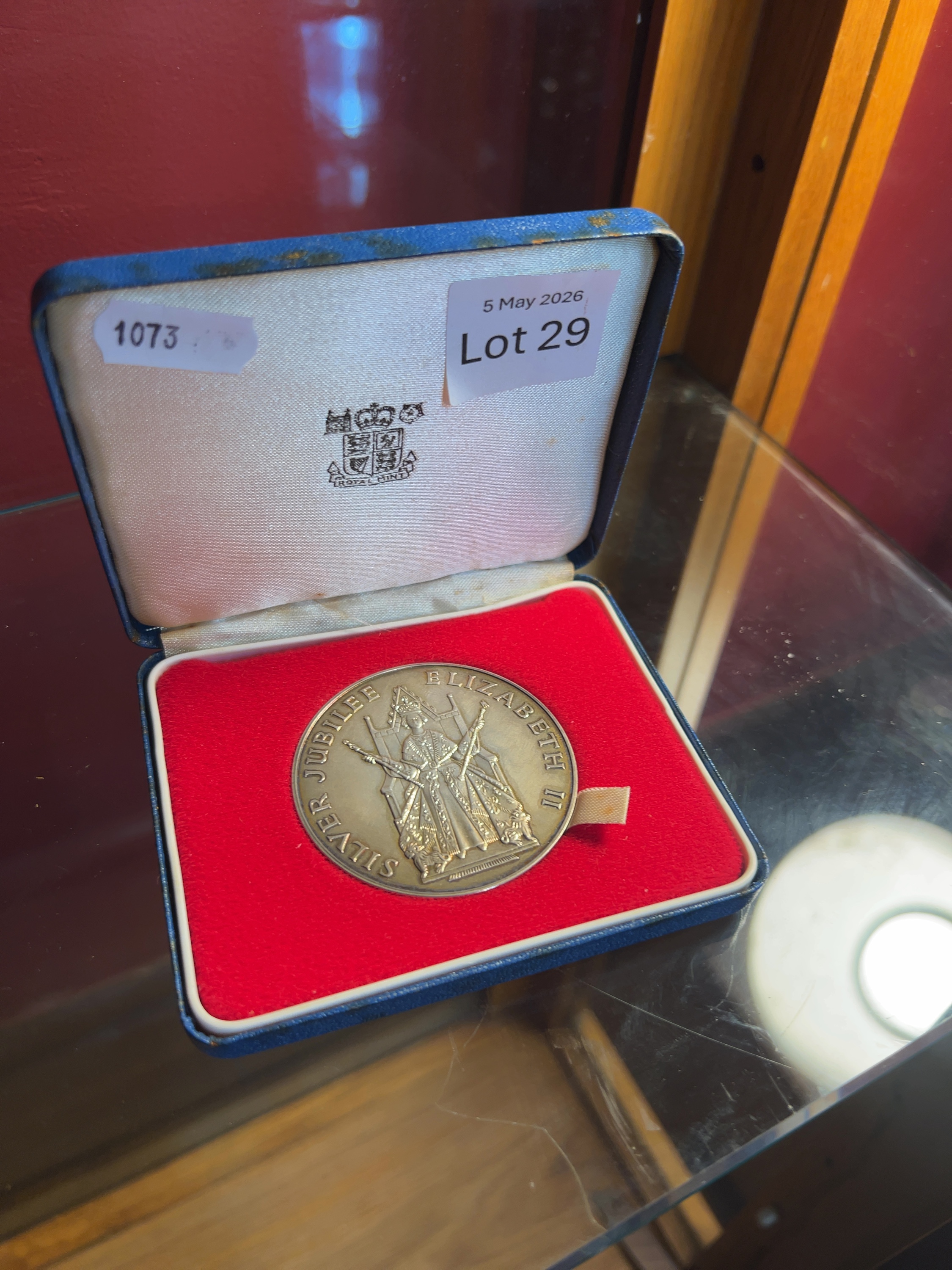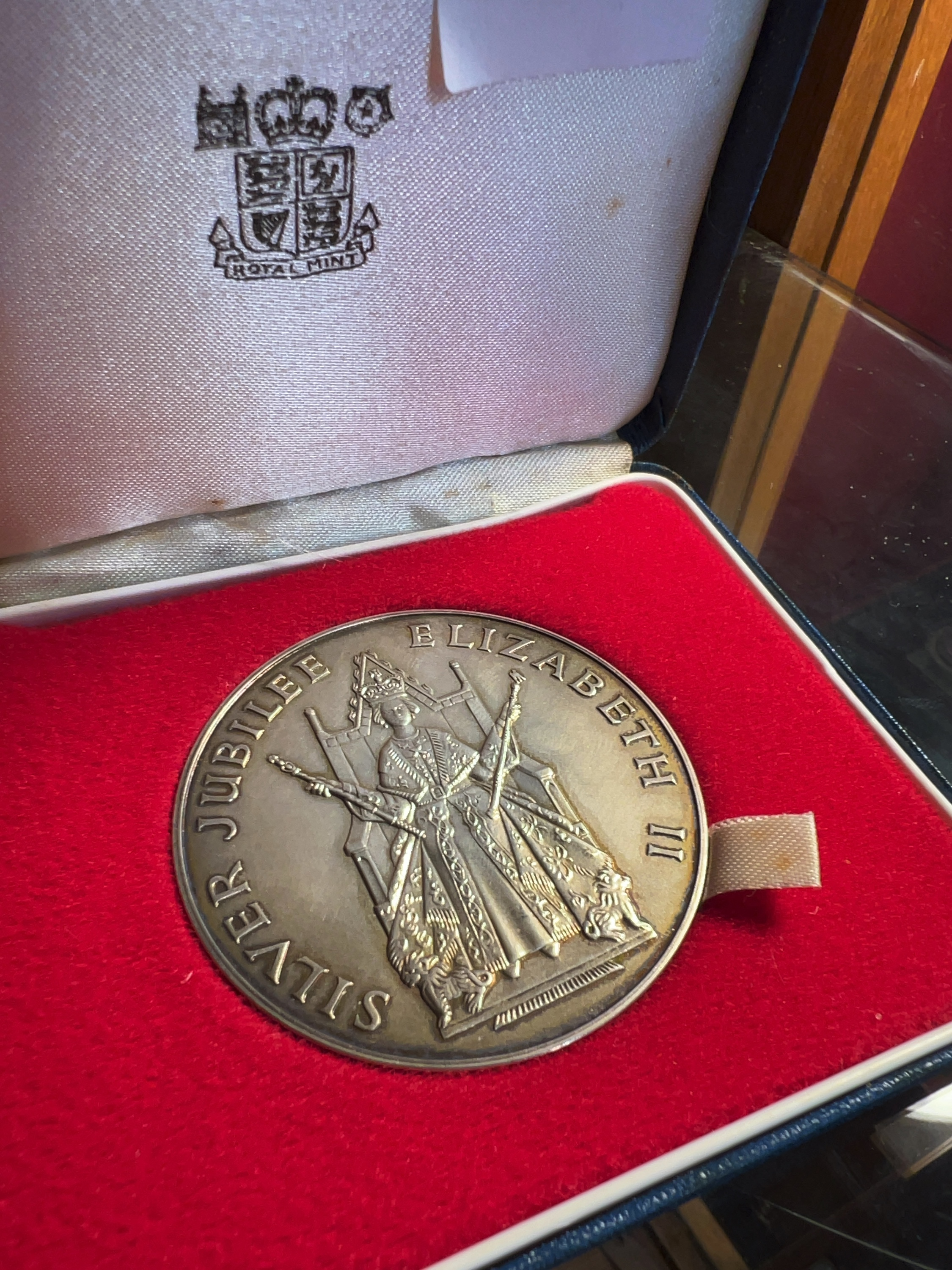 A silver commemorative medal struck by the Royal Mint to mark the twenty-fifth anniversary of the accession of Queen Elizabeth II. The obverse features a portrait of the Queen with the inscription SILVER JUBILEE ELIZABETH II. The reverse depicts a central Tudor rose design within an ornate border, inscribed VIVAT REGINA 1952-1977. The edge bears the maker mark JRG alongside London hallmarks including the lion passant for sterling silver, the leopard head for the London Assay Office, and the date letter c for 1977. The medal is presented in its original blue Royal Mint box with a white satin and velvet-lined interior featuring the mint crest.