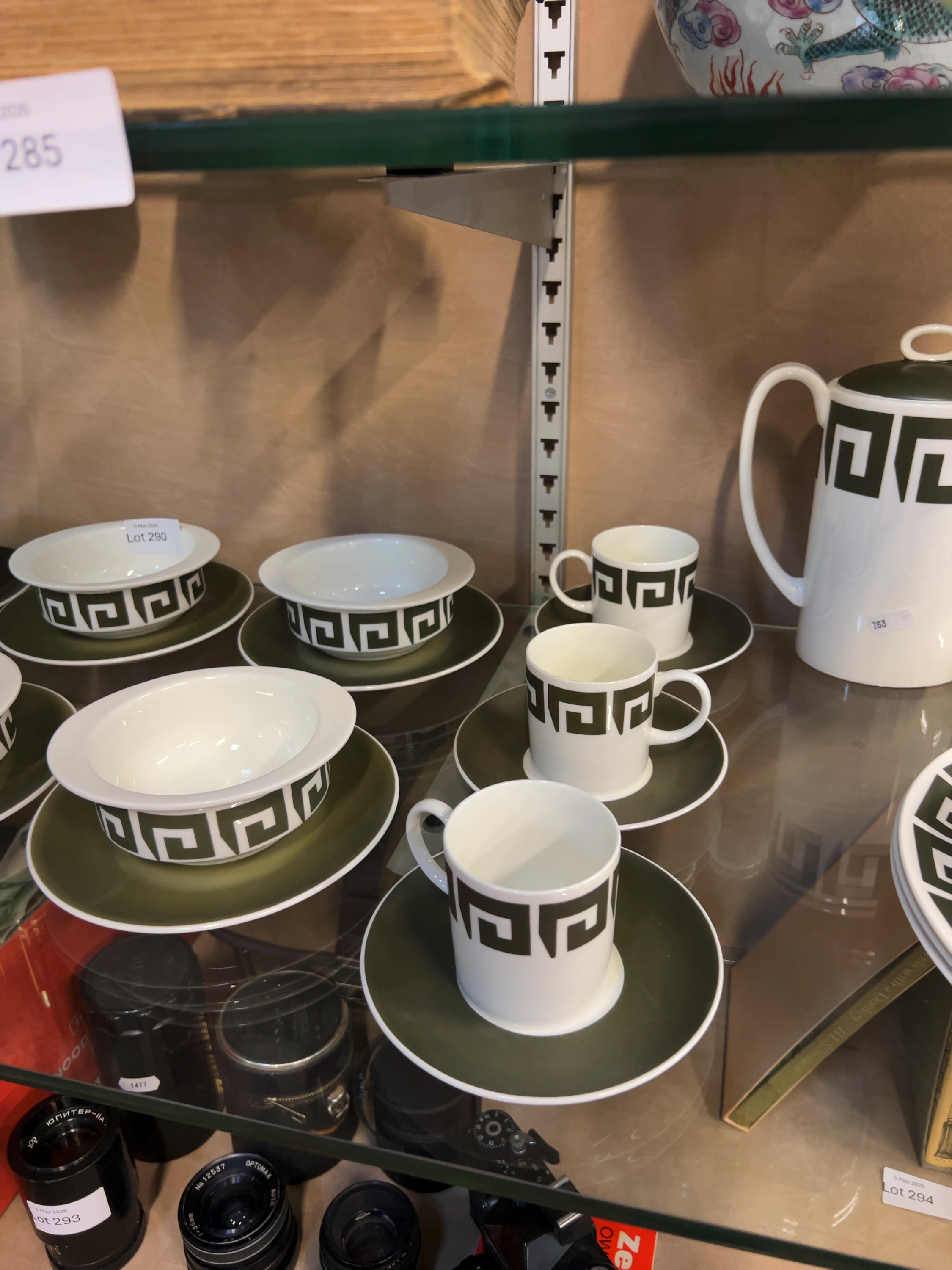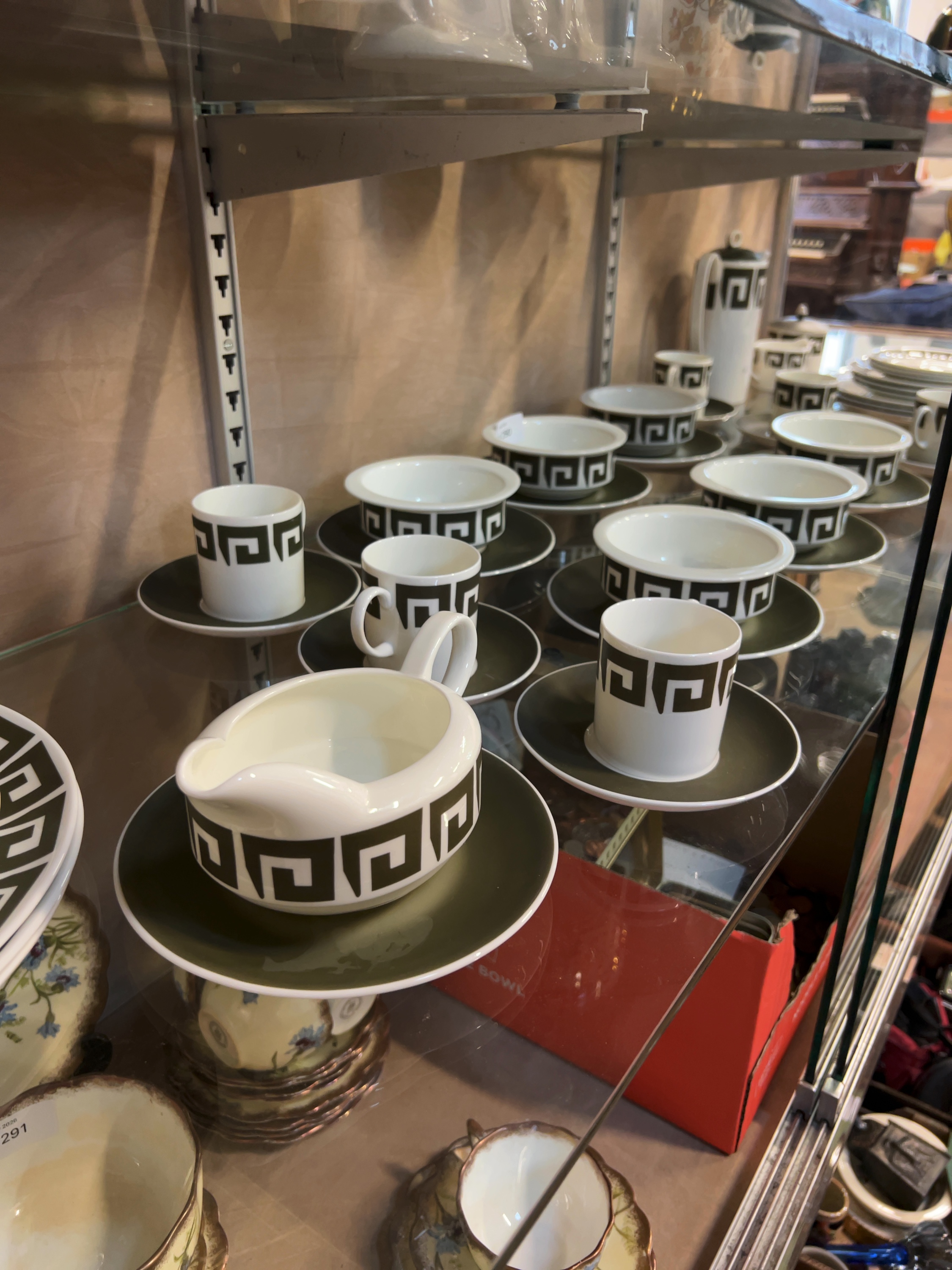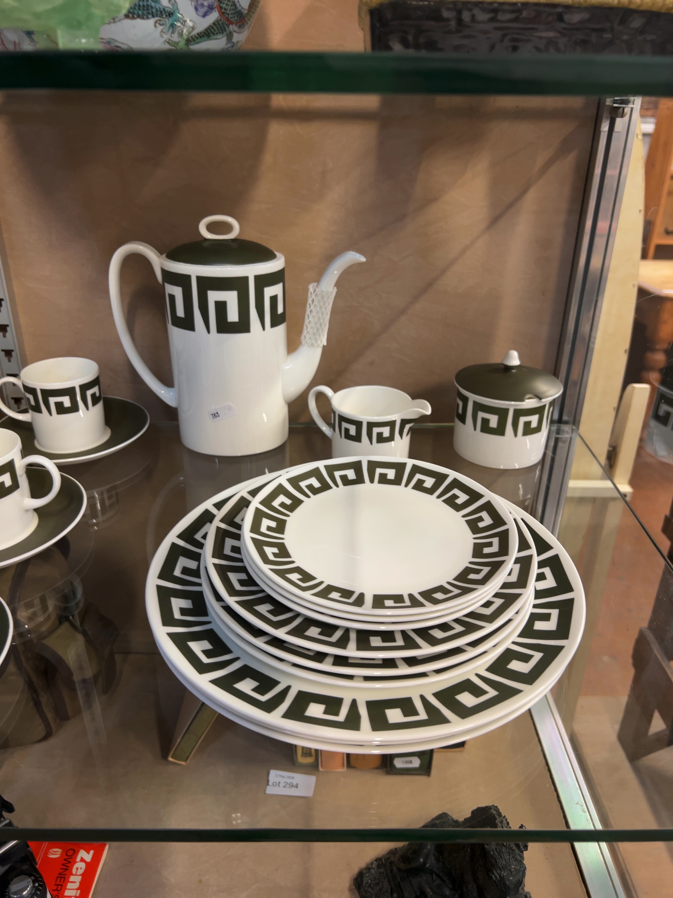 The service appears to be in very good overall condition with no visible chips, cracks, or repairs. Minor surface wear consistent with age and light use may be present. The coffee pot spout is protected with a plastic mesh suggesting careful storage.