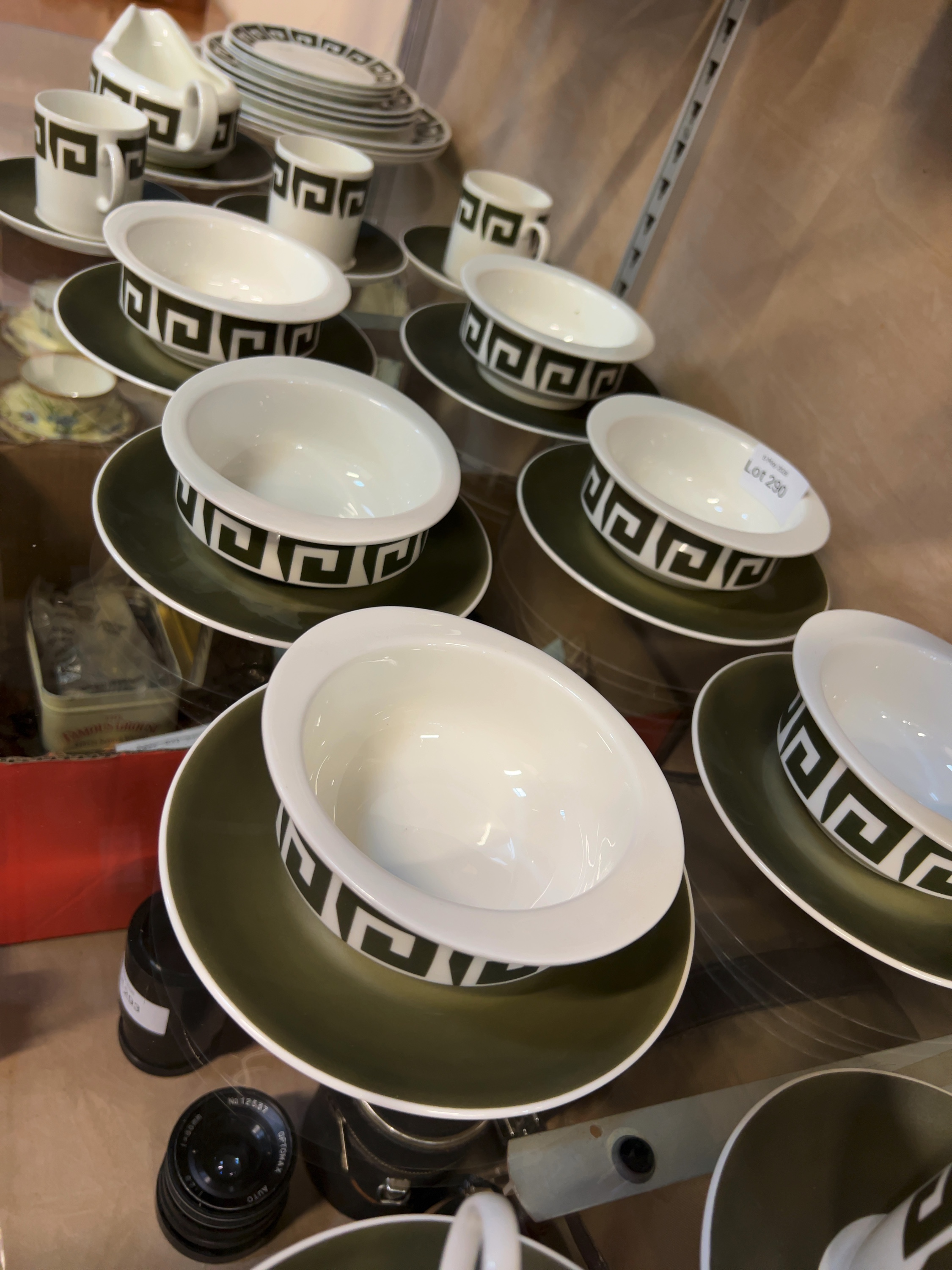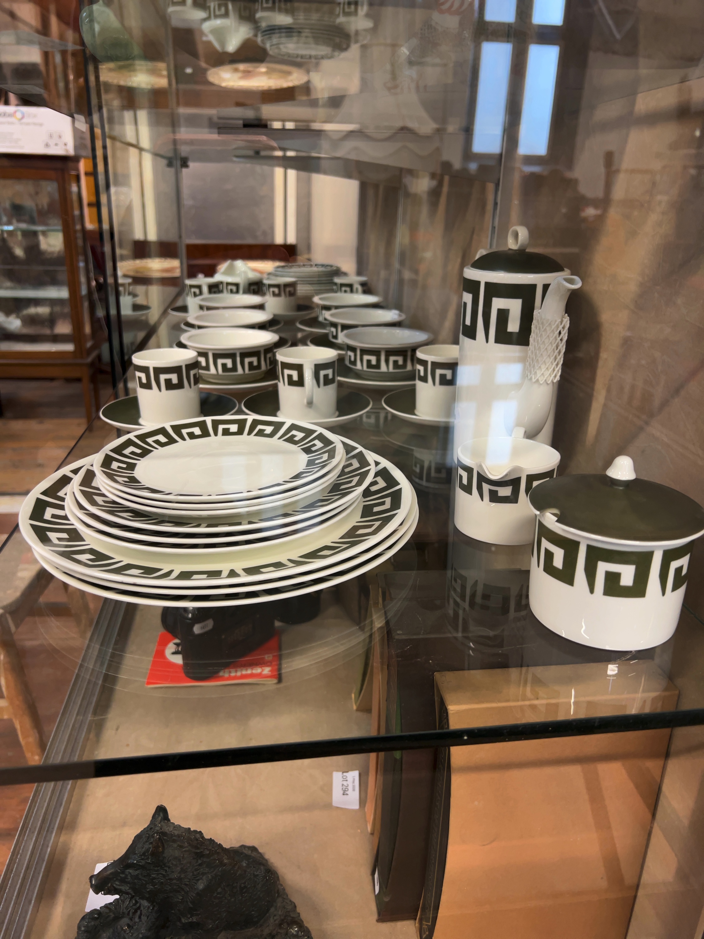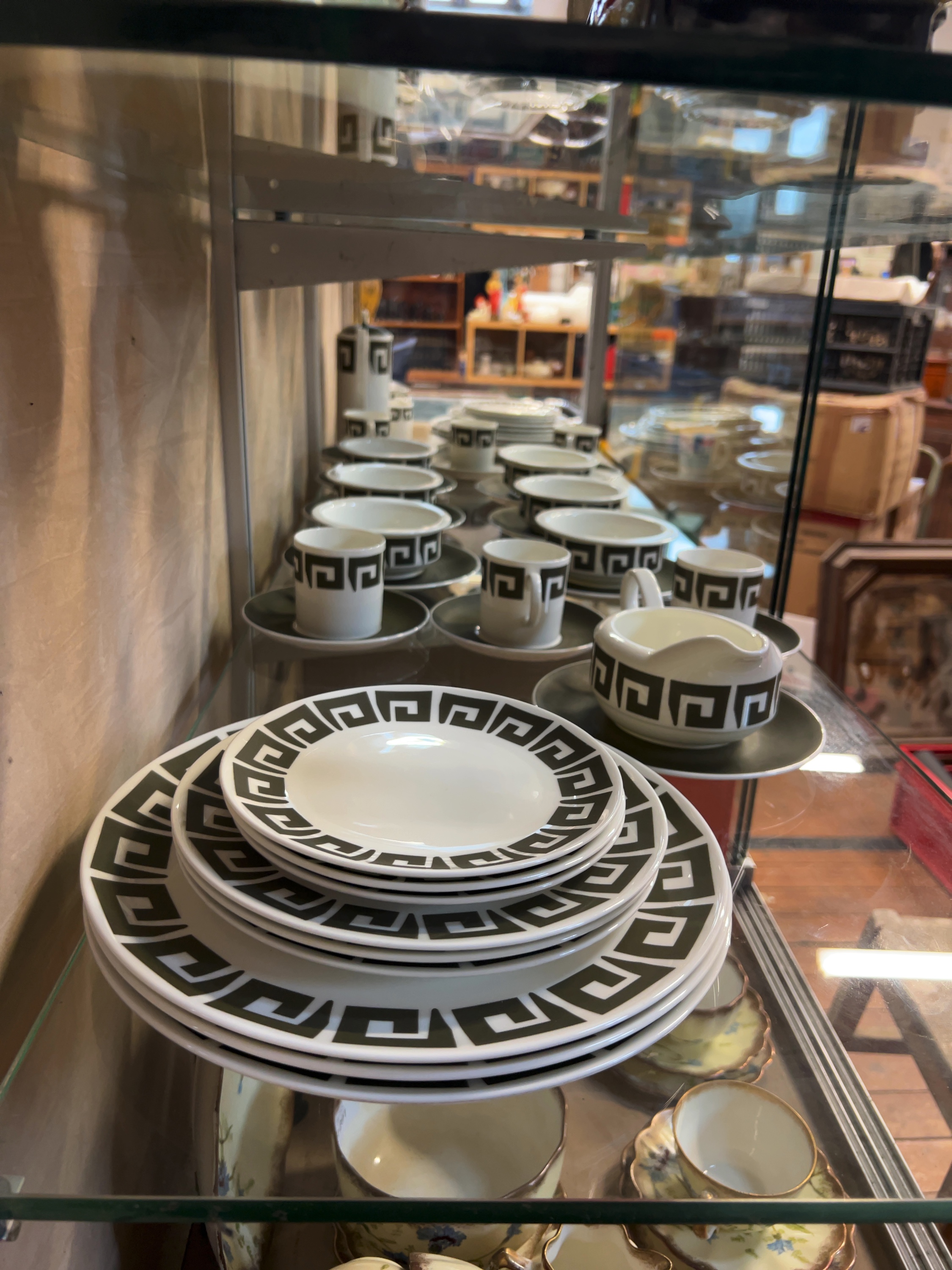 The service appears to be in very good overall condition with no visible chips, cracks, or repairs. Minor surface wear consistent with age and light use may be present. The coffee pot spout is protected with a plastic mesh suggesting careful storage.