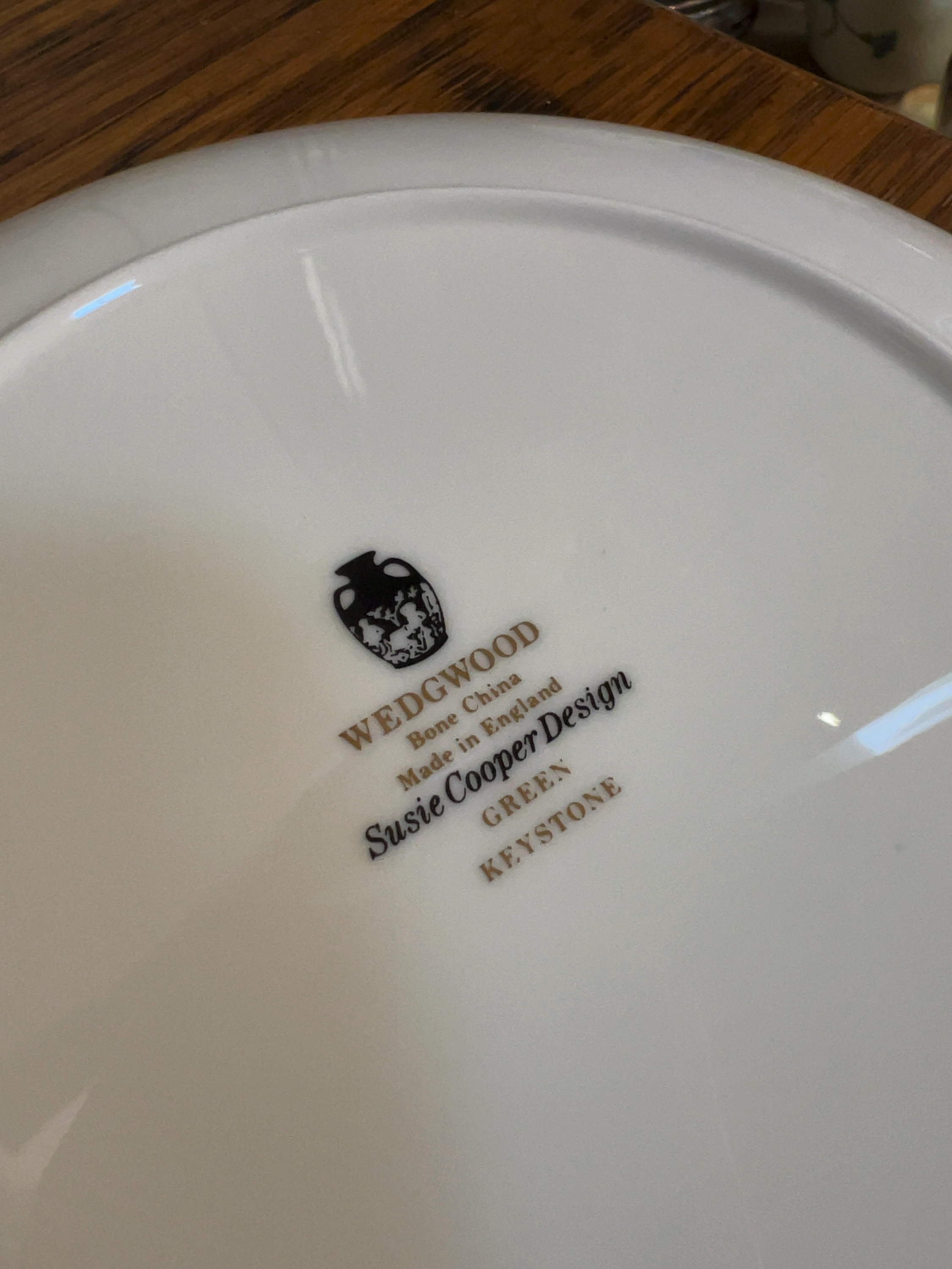 A comprehensive bone china tea and dinner service produced by Wedgwood, featuring the Keystone pattern in the green colourway, designed by Susie Cooper. Complementary pieces, including saucers and lids, are finished in a solid green glaze with white accents. The set includes a tall, cylindrical lidded coffee pot, a lidded sugar bowl, a cream jug, a sauce boat with an integral stand, multiple straight-sided cylindrical cups with matching saucers, small bowls with flared rims, and a graduated assortment of circular plates. Each piece bears the factory mark to the underside with the printed black urn symbol above Wedgwood Bone China Made in England in gold lettering, and the Susie Cooper Design signature in black script above Green Keystone in gold lettering.