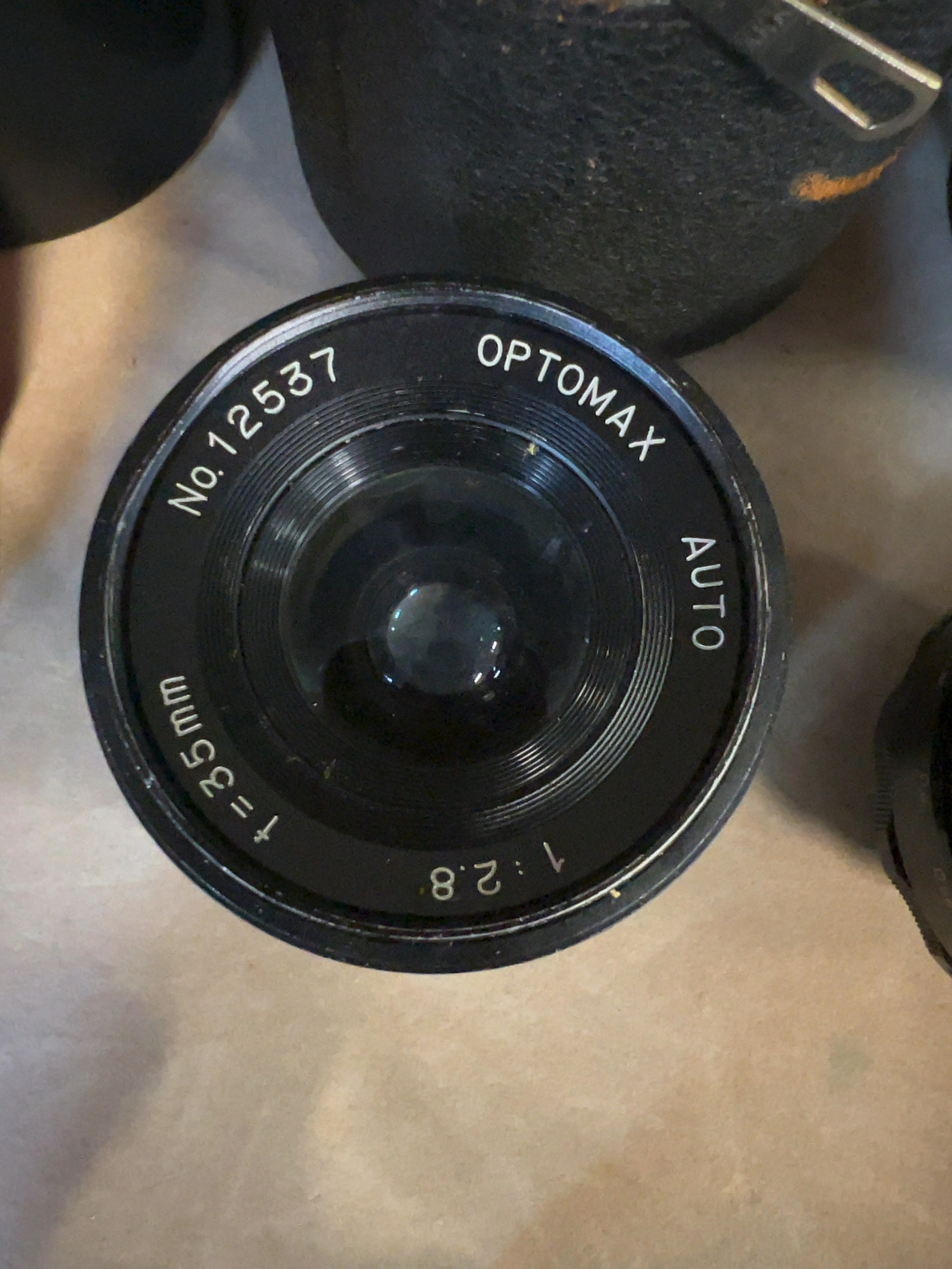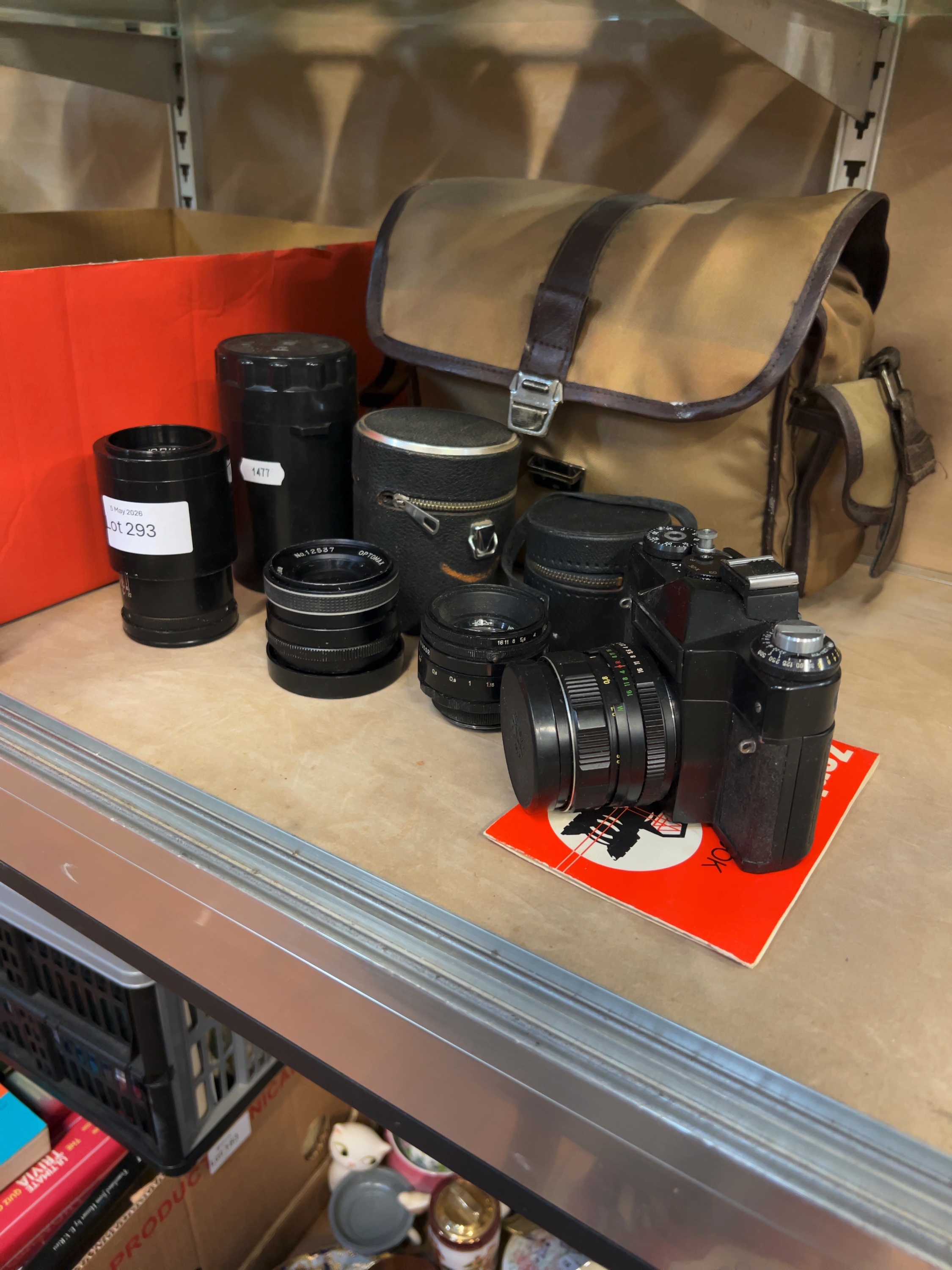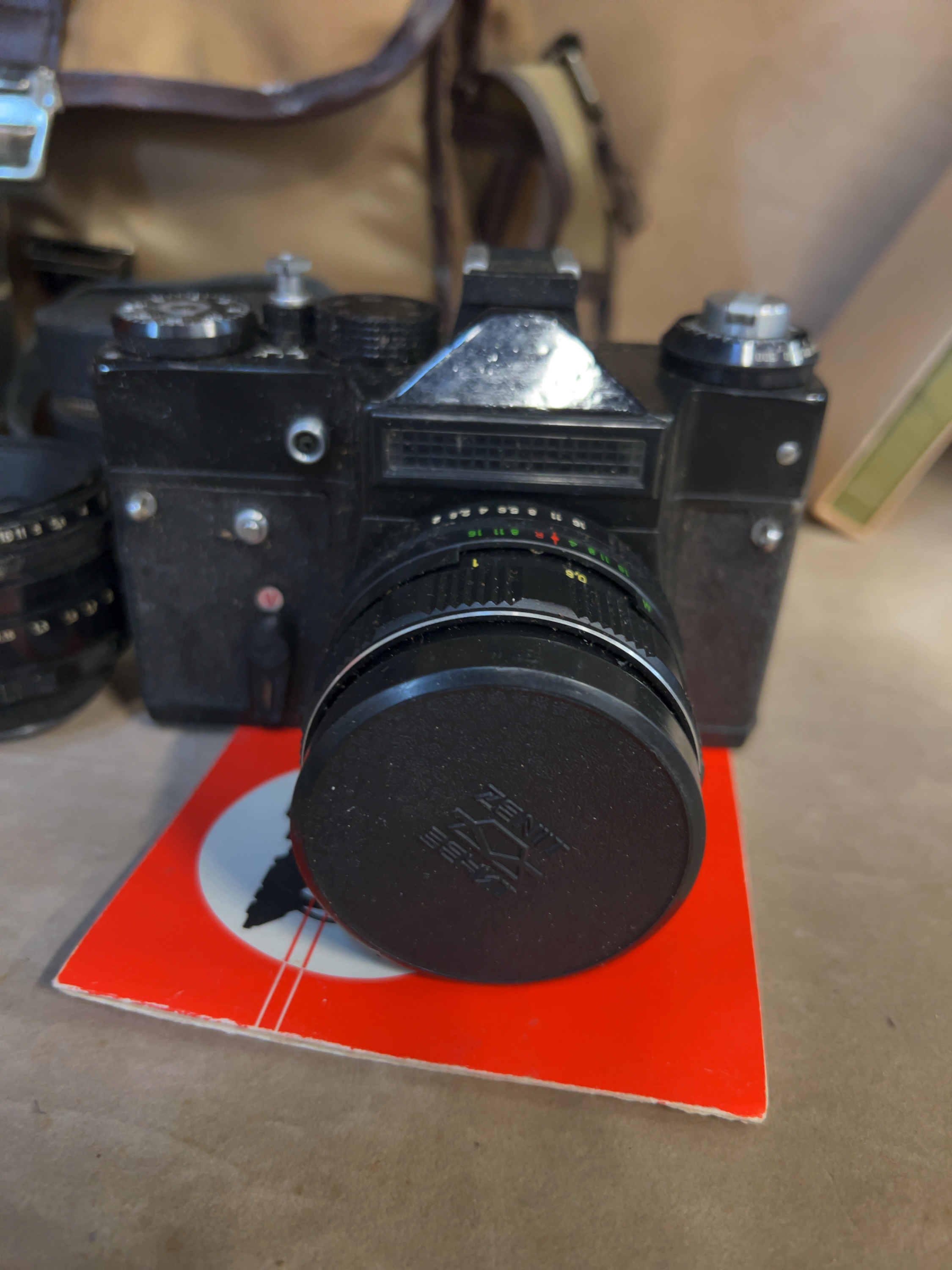 A collection of Soviet-era photographic equipment comprising a Zenit 35mm SLR camera body and multiple interchangeable lenses. The camera body is constructed from die-cast metal with a black enamel finish and a textured grip. The base of the camera is marked Made in USSR alongside the KMZ (Krasnogorsk Mechanical Works) factory prism logo. The lot includes four lenses. The first is a Helios-44 58mm f/2 lens, serial number 449200, featuring the KMZ logo. The second is a Jupiter-11A 135mm f/4 telephoto lens, serial number 727942, inscribed in Cyrillic as ЮПИТЕР-11А. The third is an Optomax Auto 35mm f/2.8 wide-angle lens, serial number 12537. The fourth is a Helios 44-series lens mounted to the camera body, serial number 836552. Accessories included with the collection consist of a tan canvas and brown leather-style shoulder bag with a buckle closure, two black leatherette cylindrical lens cases, one black plastic lens case, a Zenit embossed lens cap, and a red Zenit instruction booklet.