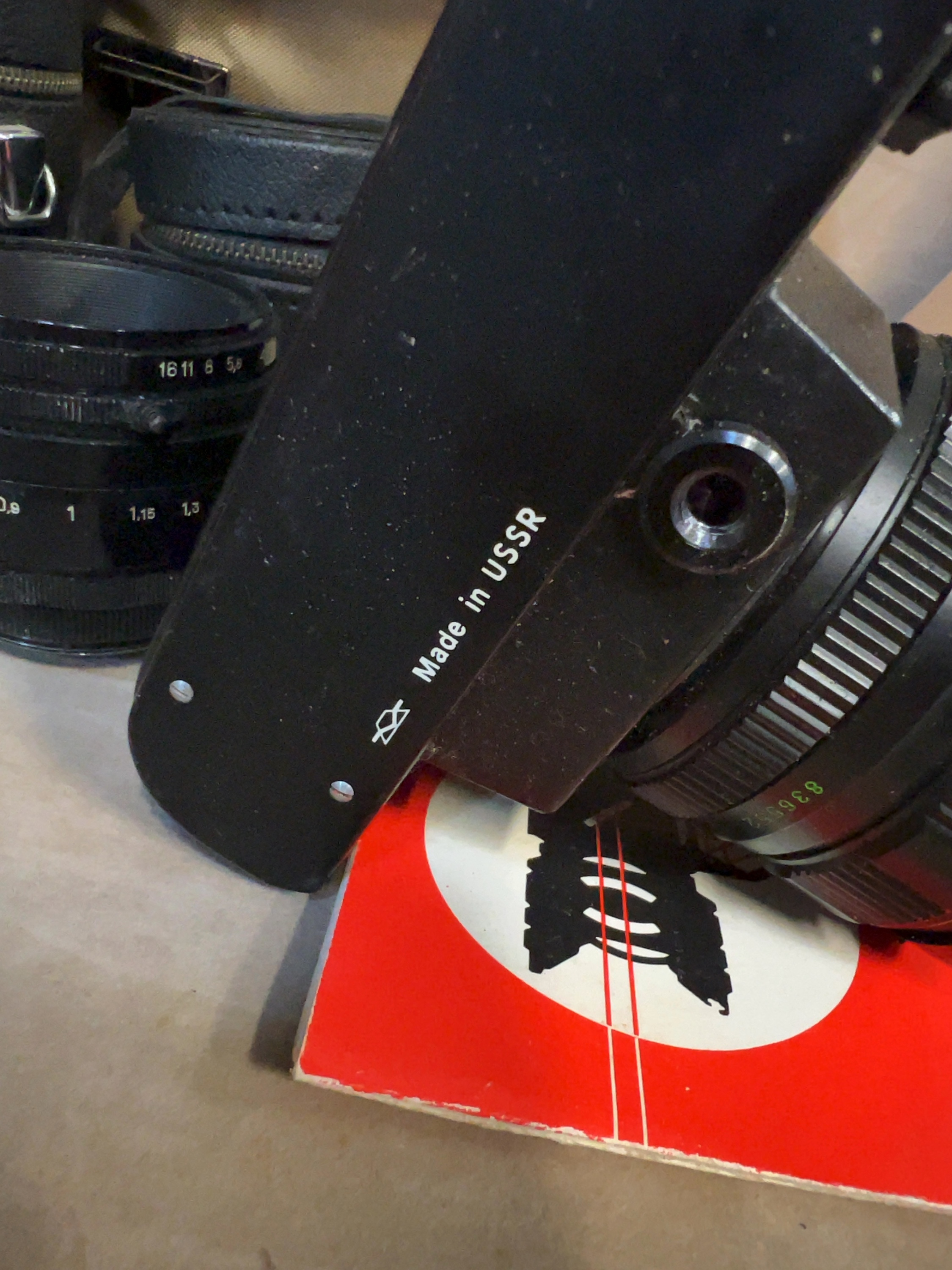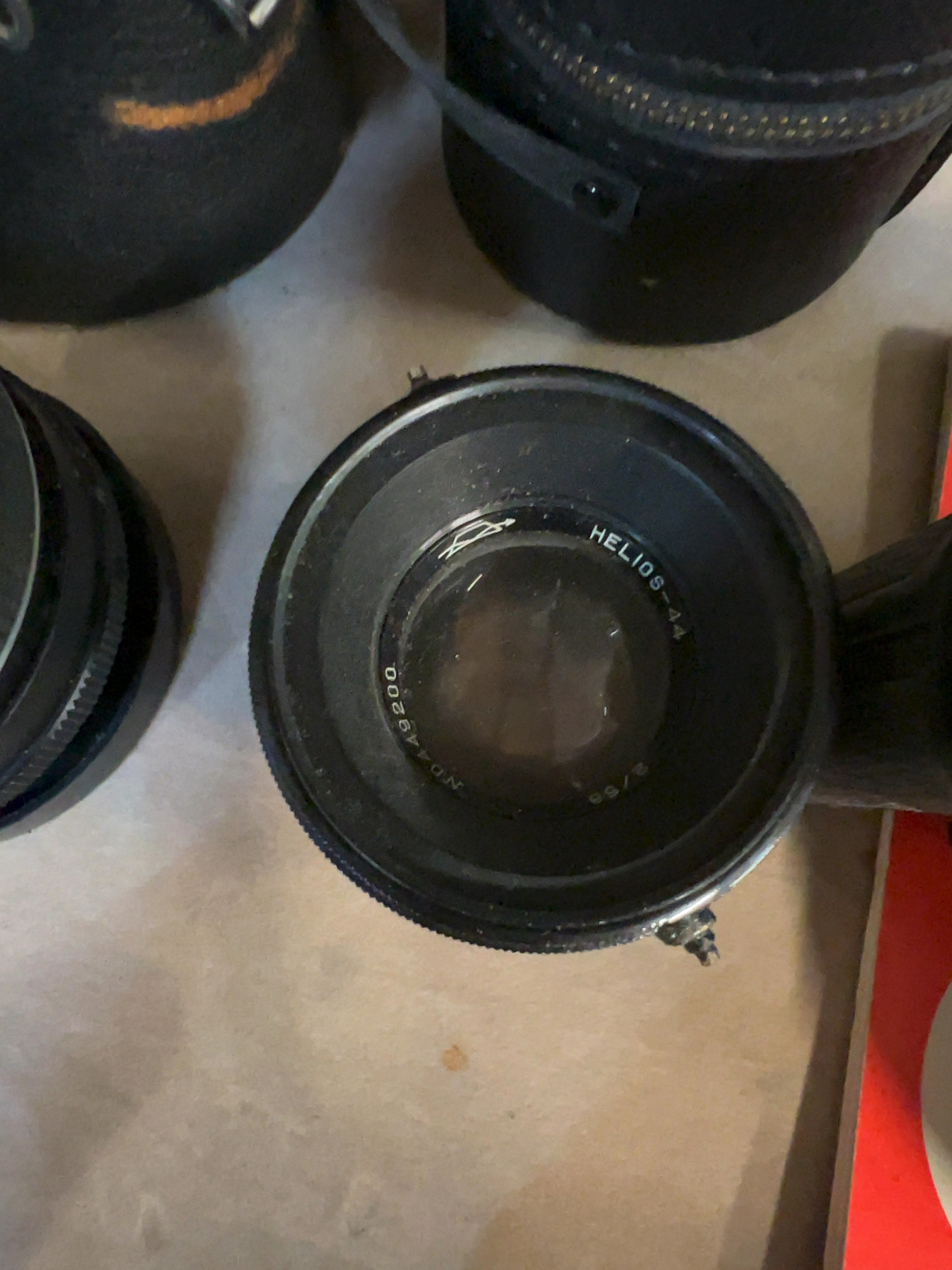 The collection shows signs of heavy previous use and significant dust accumulation across all components. The black enamel finish on the camera body and lens barrels exhibits scuffing, edge wear, and surface mottling on the metal top plate. All lenses contain visible internal dust. The Helios-44 (serial no. 449200) shows evidence of internal haze or surface marks on the front element. The mechanical and electronic functions of the equipment are untested; the shutter, film advance, selenium light meter, and lens mechanisms (aperture and focus) have not been verified for functionality. Sold as-is for parts, restoration, or display.