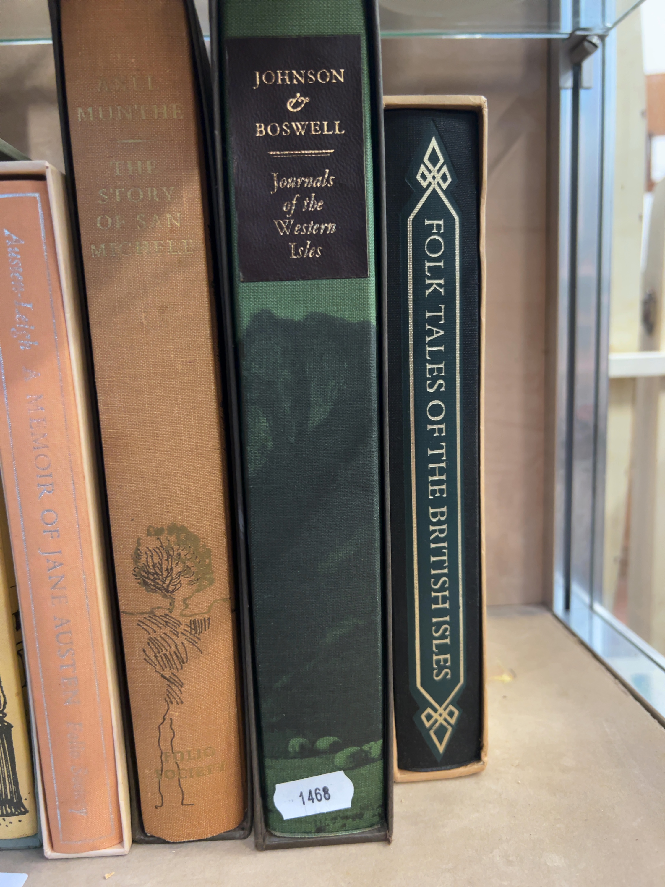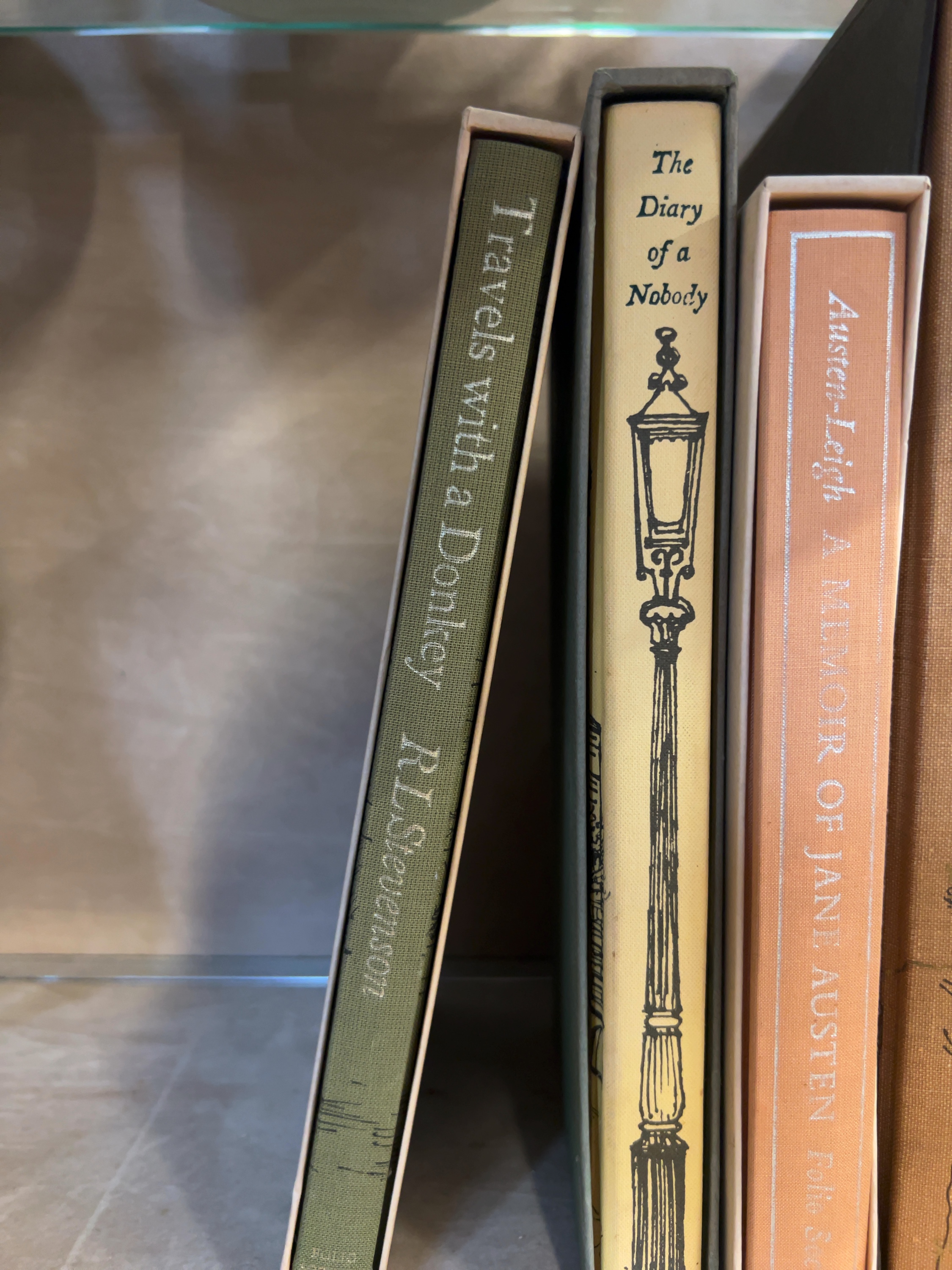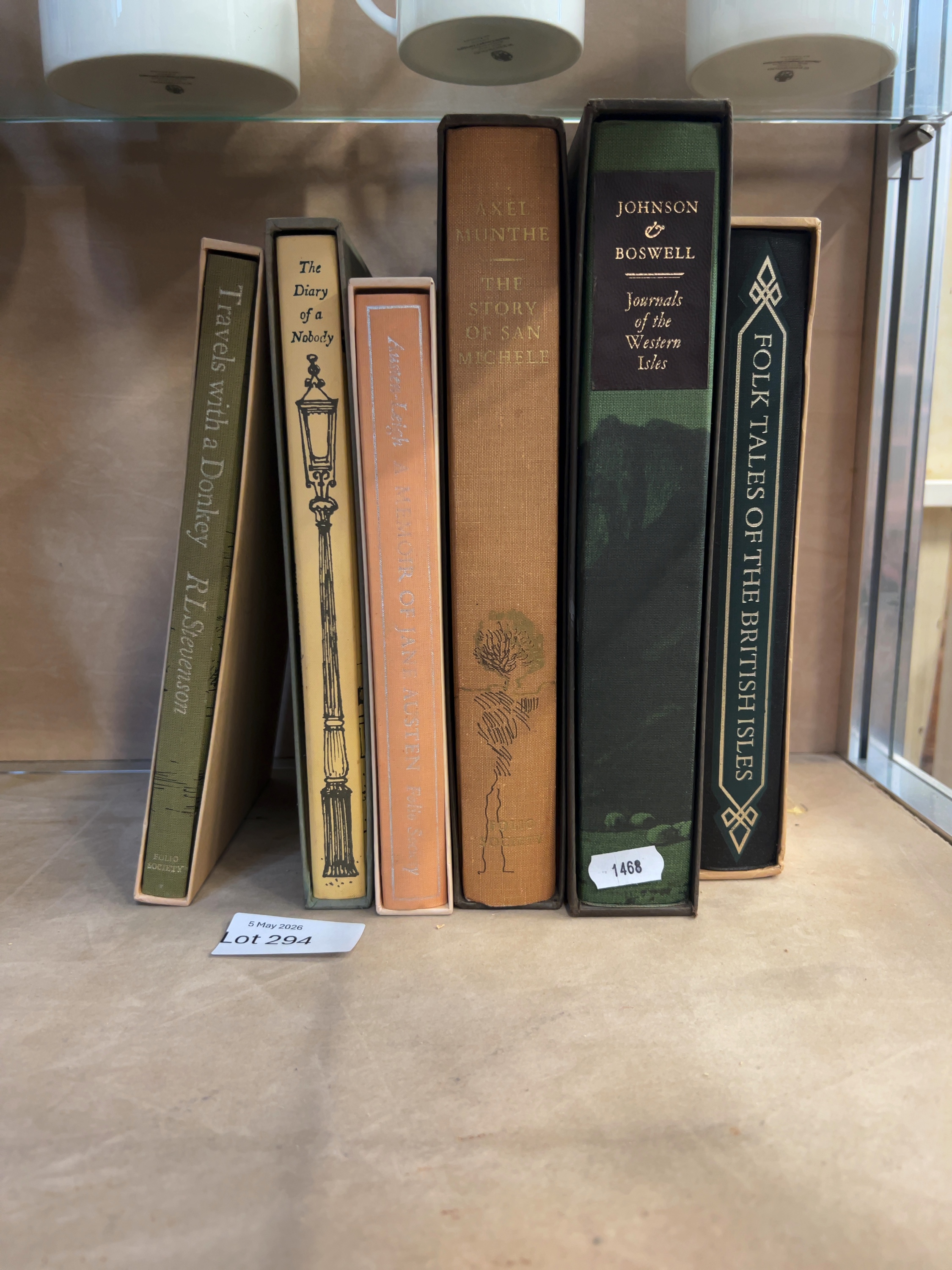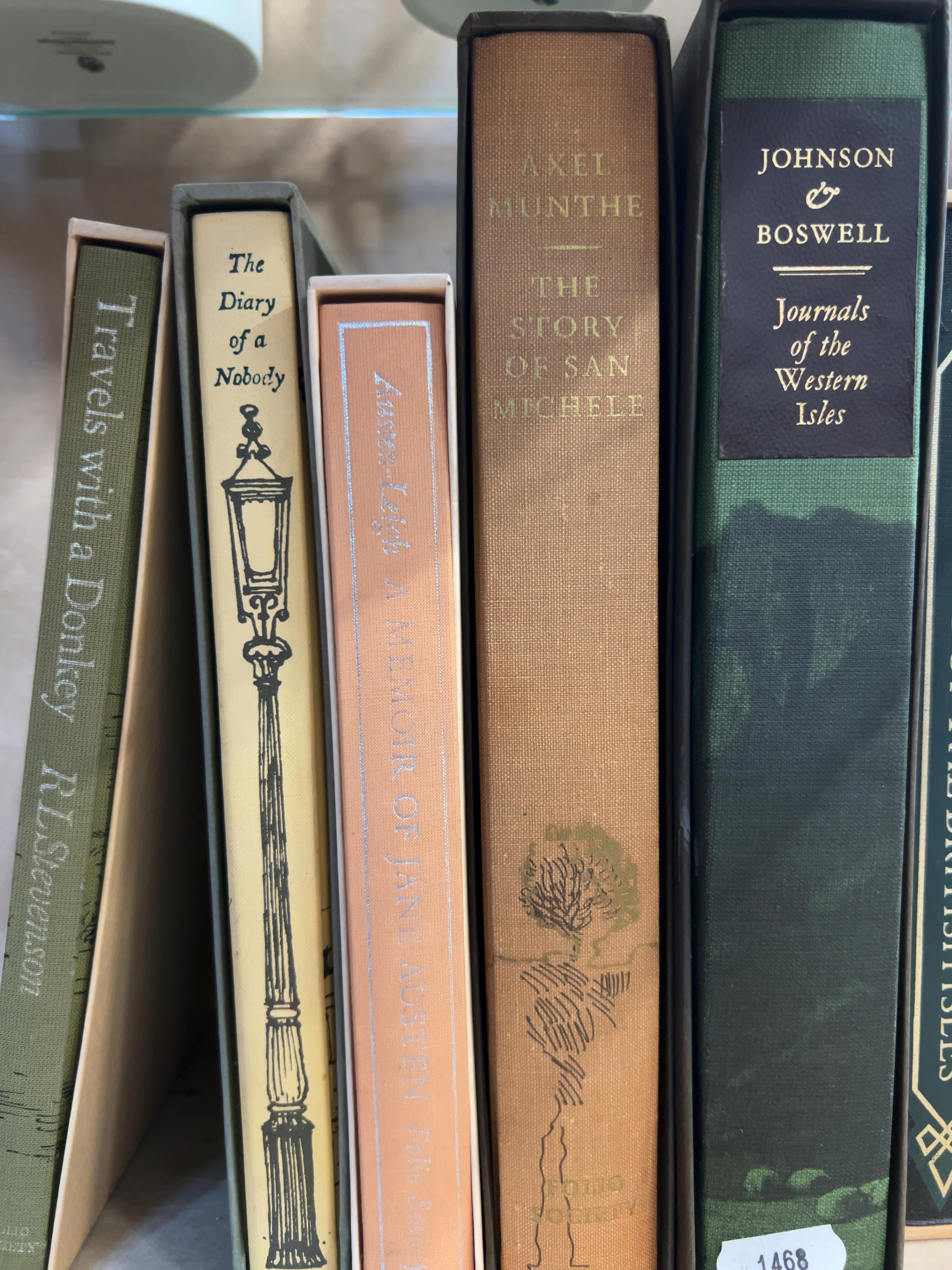 A collection of six hardcover volumes published by the Folio Society, each presented in its original publisher’s slipcase. The group comprises: Robert Louis Stevenson’s Travels with a Donkey in the Cevennes, bound in olive green cloth; George and Weedon Grossmith’s The Diary of a Nobody, featuring a cream spine with a street lamp illustration; James Edward Austen-Leigh’s A Memoir of Jane Austen, bound in peach cloth with silver-toned lettering; Axel Munthe’s The Story of San Michele, in tan cloth with a tree motif; Samuel Johnson and James Boswell’s Journals of the Western Isles, bound in green cloth with a black title label; and Folk Tales of the British Isles, in a black cloth binding with decorative gilt elements. Most volumes feature the Folio Society imprint at the base of the spine. The books are standard octavo in size.