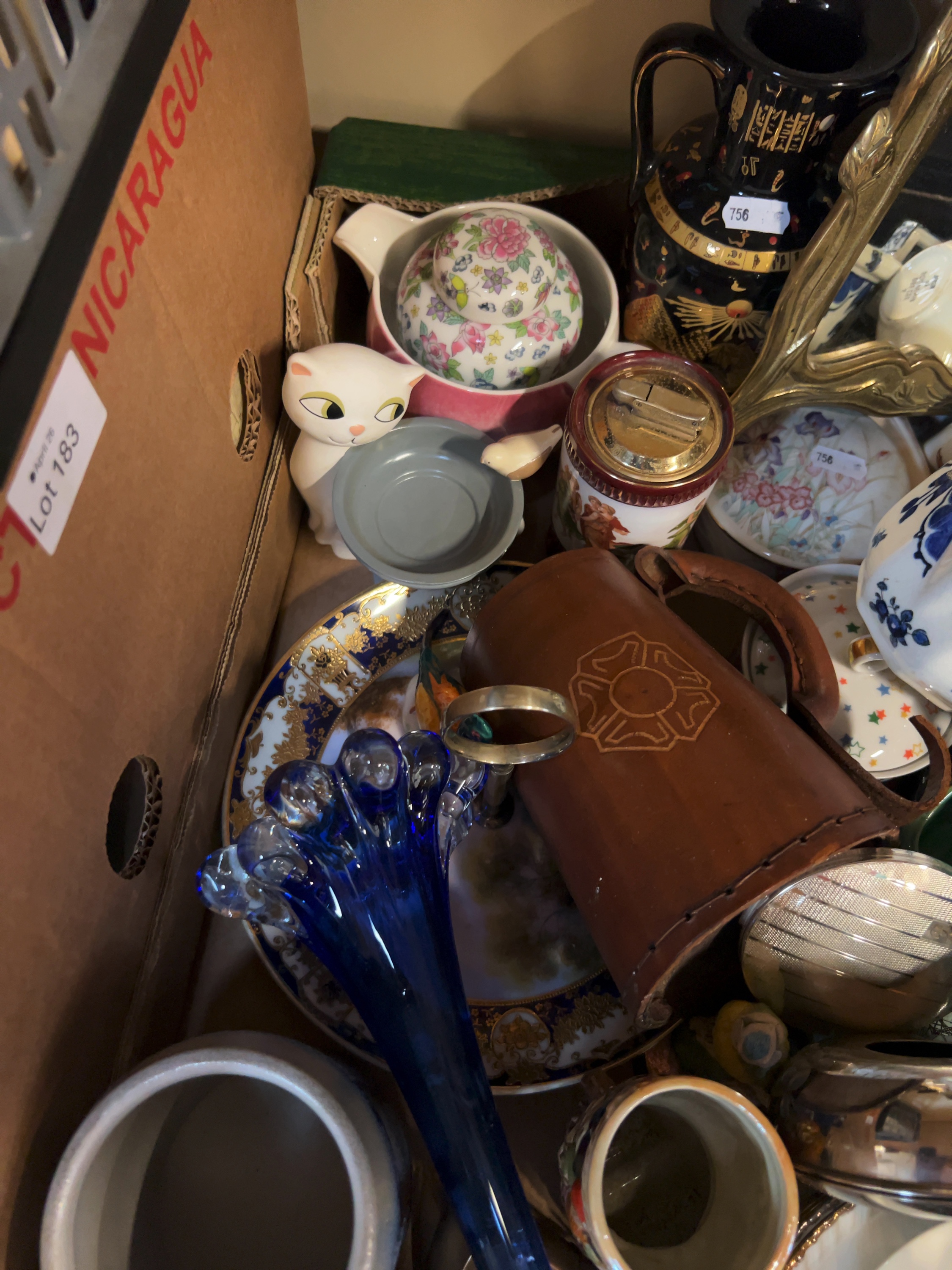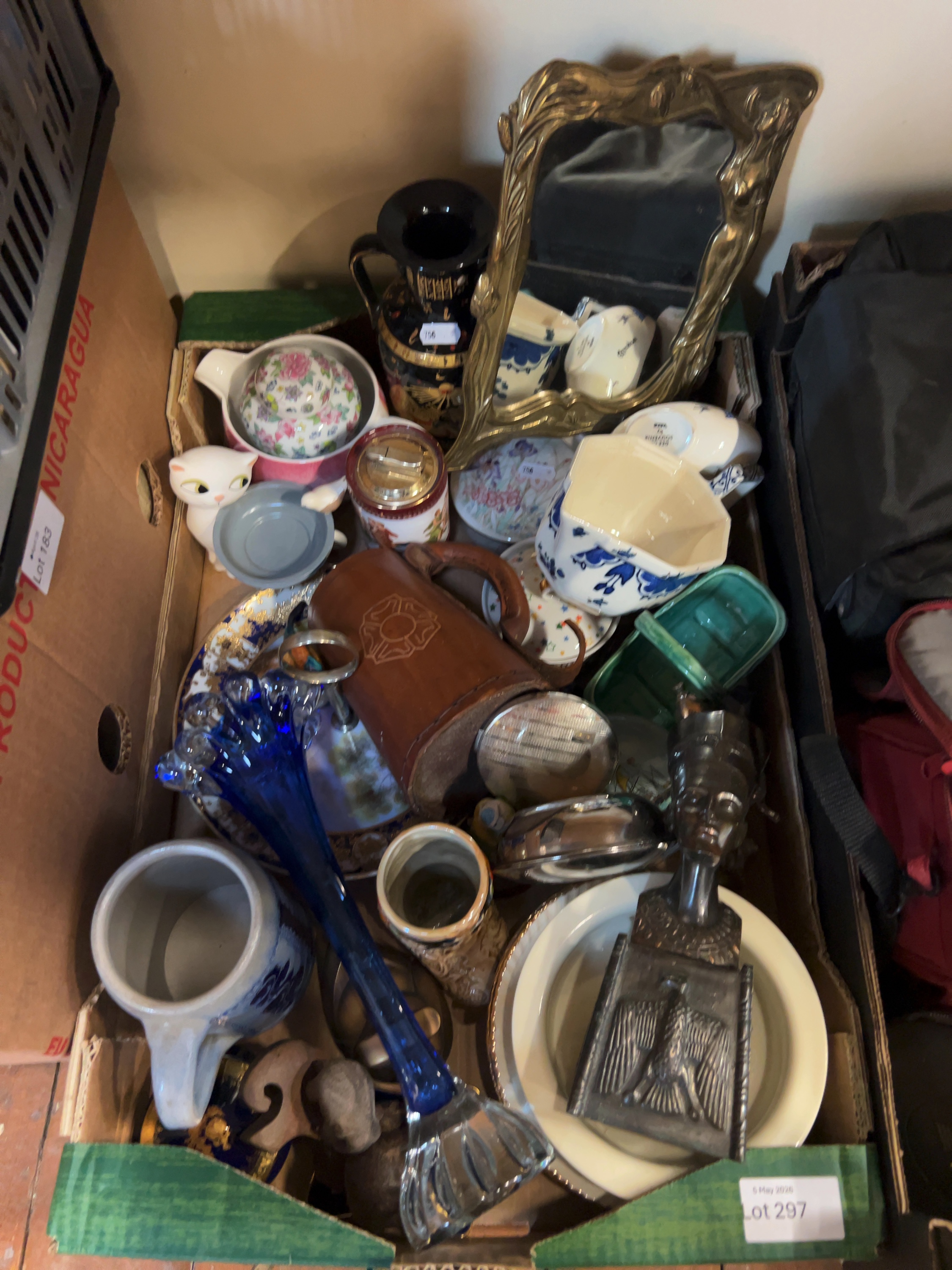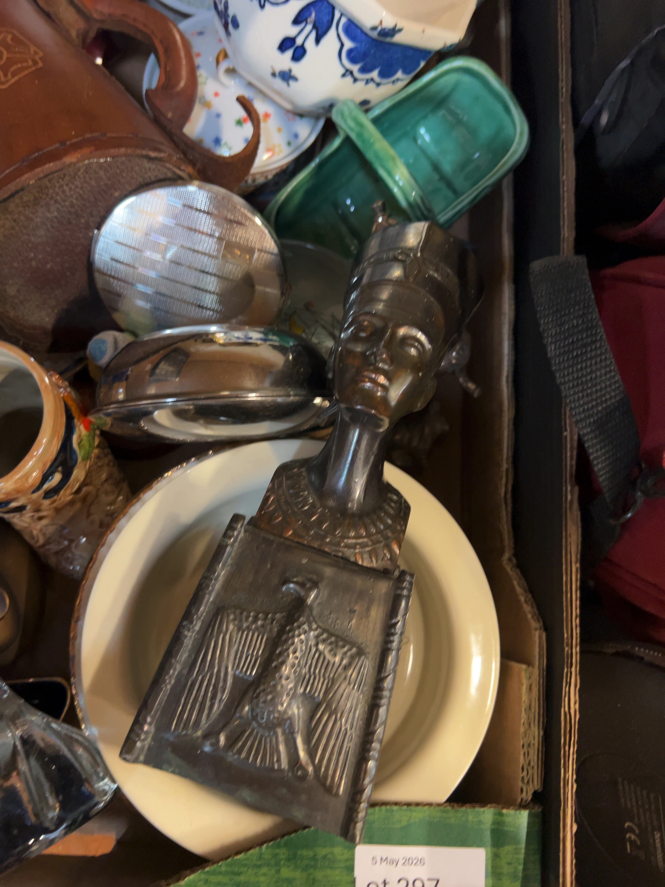 A collection of various decorative items and household collectibles. The lot includes an Art Nouveau style cast metal dressing table mirror; a patinated metal bust of Nefertiti; mid-century modern style white cat figurine, a black-glazed Egyptian revival vase. Further items include a lidded floral jar, a table lighter with a ceramic body, a flared cobalt blue glass vase, and a leather-cased tankard, several cabinet plates and various small trinket dishes. Manufacturer marks are present on the underside of some ceramic pieces but are not clearly legible from the images.