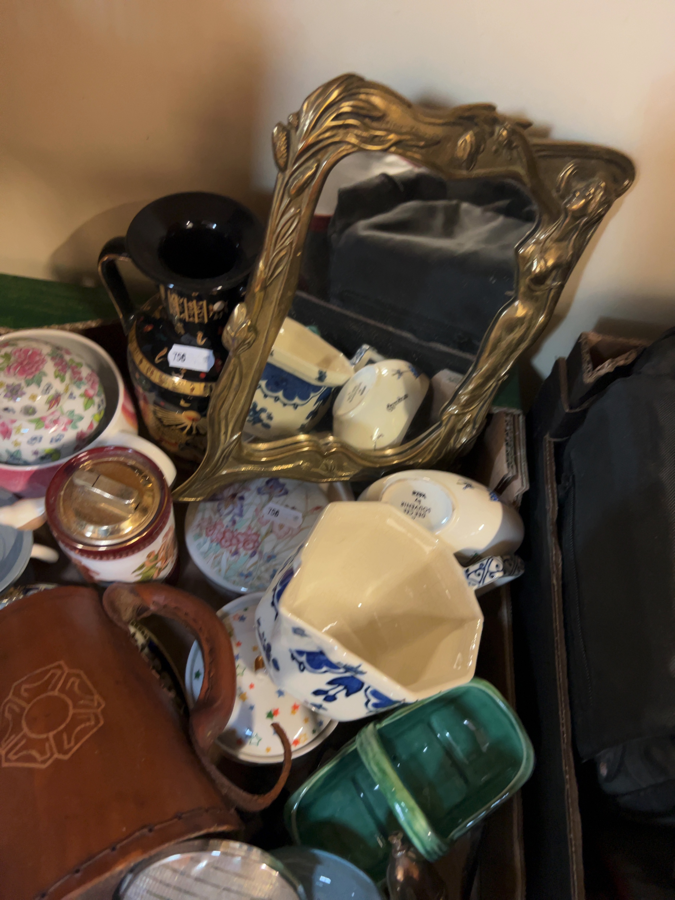 The collection is in mixed condition. Most items appear to be intact, though surface wear, scratches, and dust are evident throughout the lot. The Art Nouveau mirror frame shows some tarnishing and age-related wear to the mirror plate. Ceramic items may exhibit fine crazing or minor rubbing to gilt and transfer decoration. The leather casing on the tankard shows some scuffing and signs of age. The metal bust has minor wear to the patinated finish.