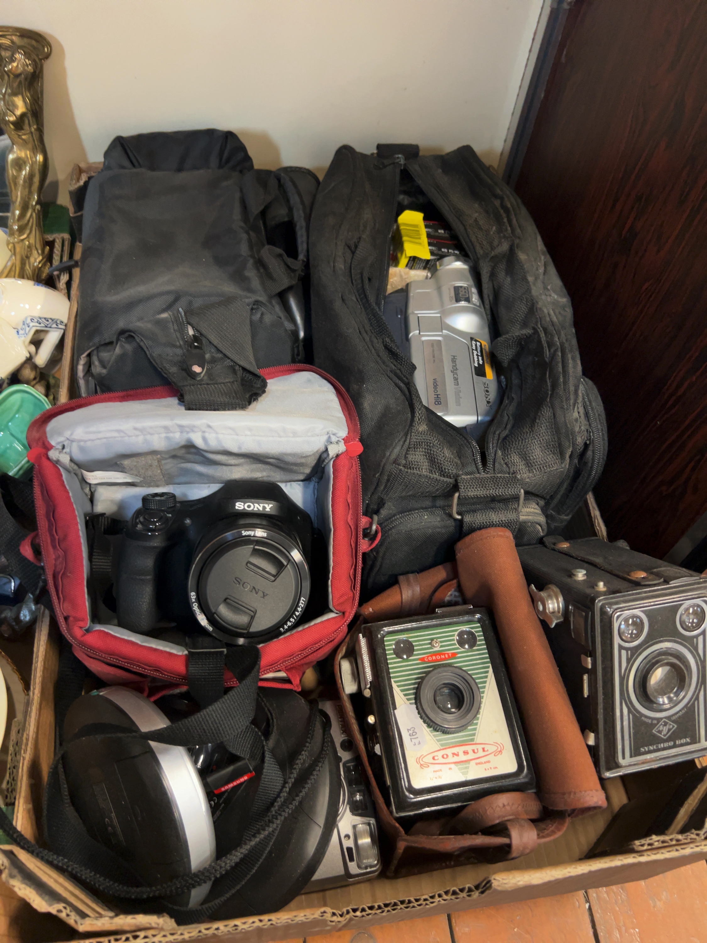 All items in this lot are sold as seen and are untested for mechanical or electrical functionality. The Sony DSC-H400 and Handycam camcorder appear in good cosmetic condition. The vintage Coronet and Agfa box cameras exhibit age-appropriate wear, including minor surface oxidation and rubbing to the edges. Lenses have not been internally inspected for potential haze, dust, or fungus.