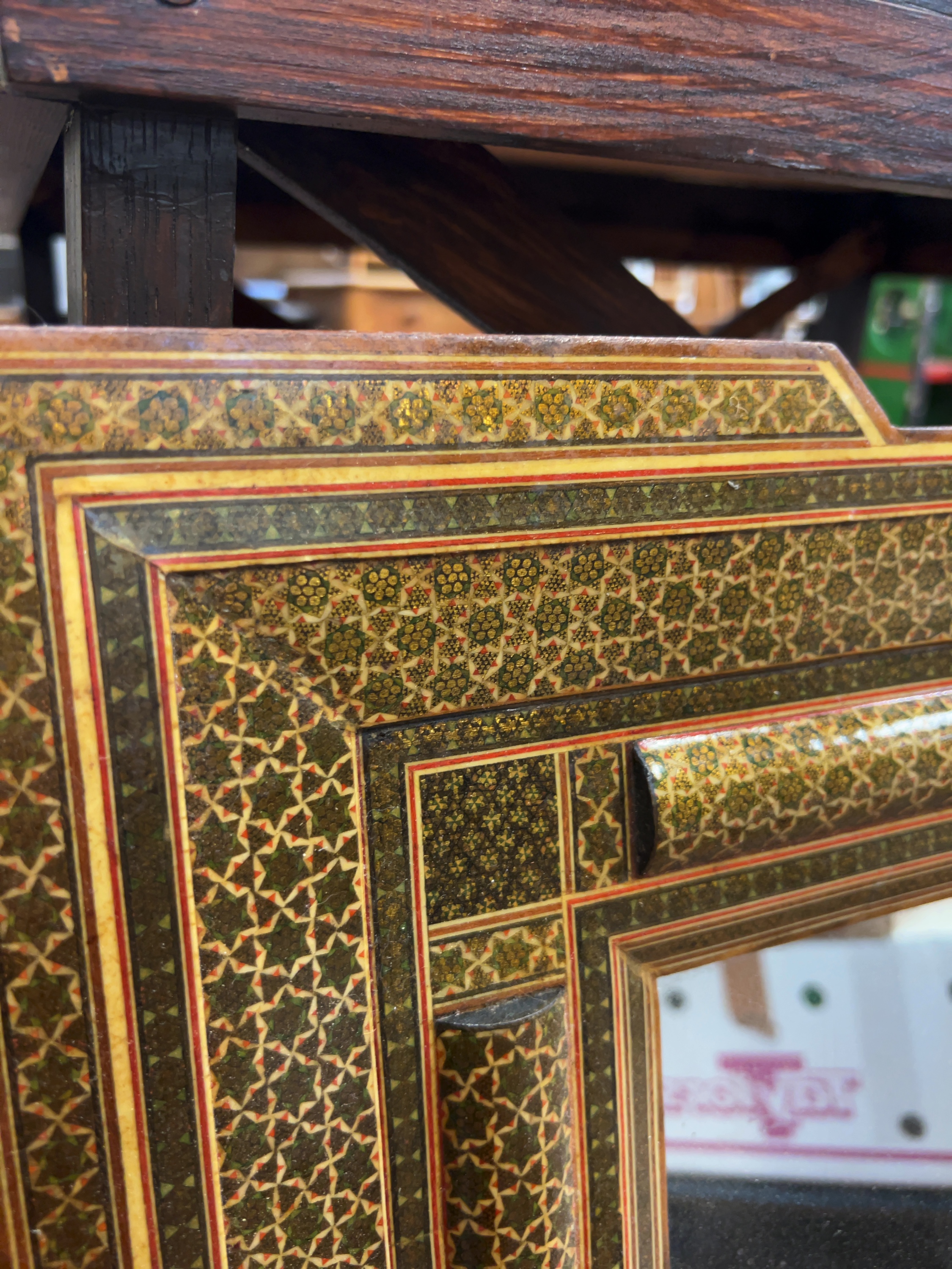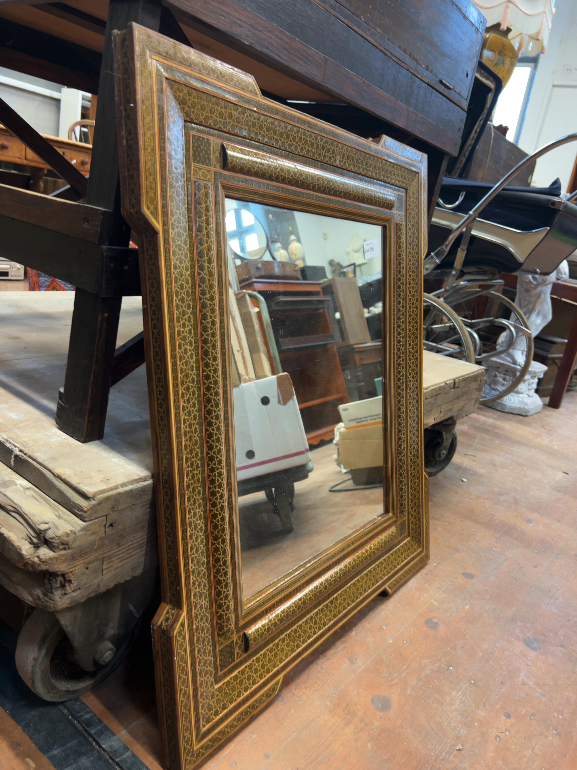 A rectangular wall mirror featuring a frame decorated with Persian Khatamkari micro-mosaic inlay. No maker marks or labels are present.